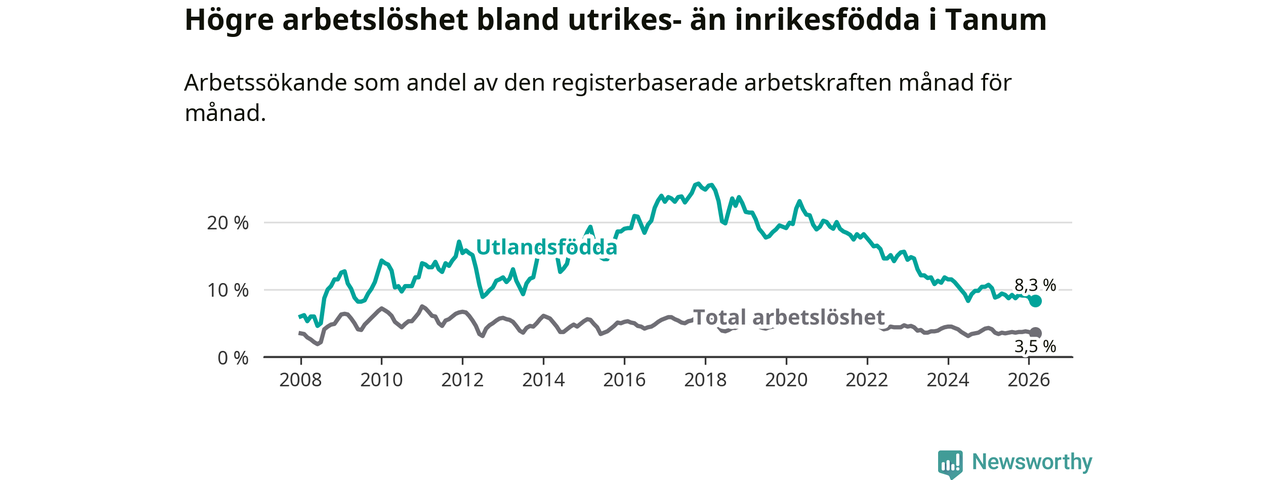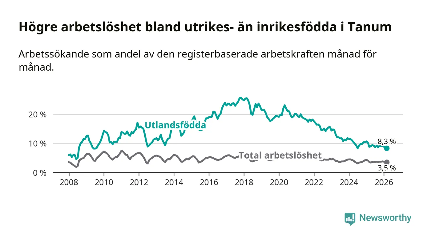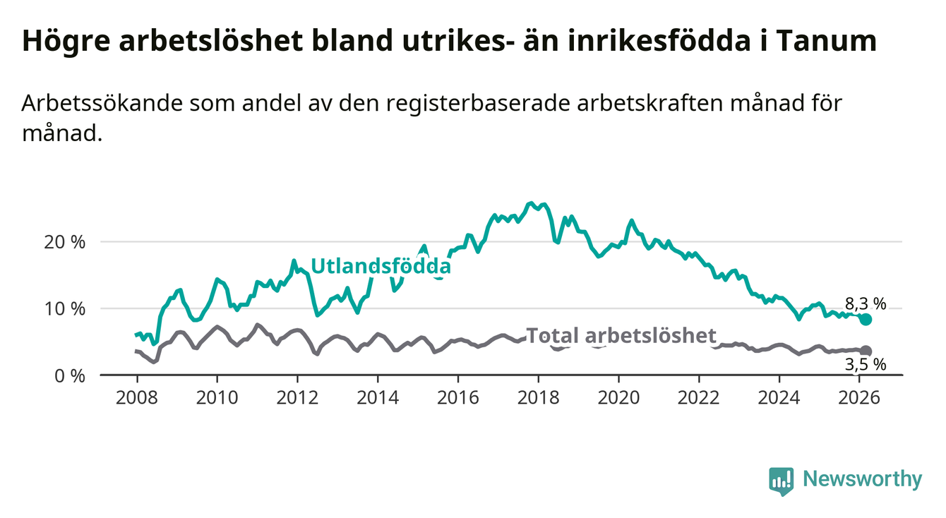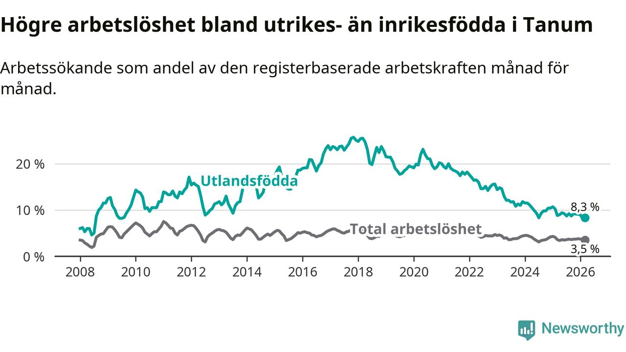 Arbetslösheten bland utlandsfödda var 8,3 procent i Tanum under mars månad, motsvarande 68 av 819 personer. Det är 0,5 procentenheter färre än vid samma tidpunkt i fjol (−4 om man räknar personer). Därmed är de utlandsföddas arbetslöshet lägre än vid samma tidpunkt i fjol för åttonde månaden i följd.