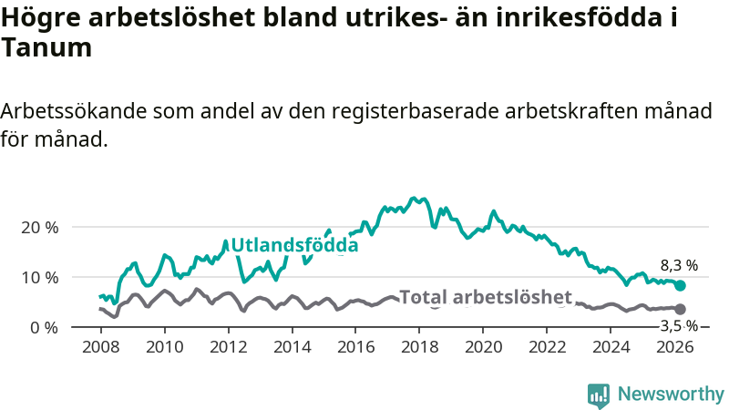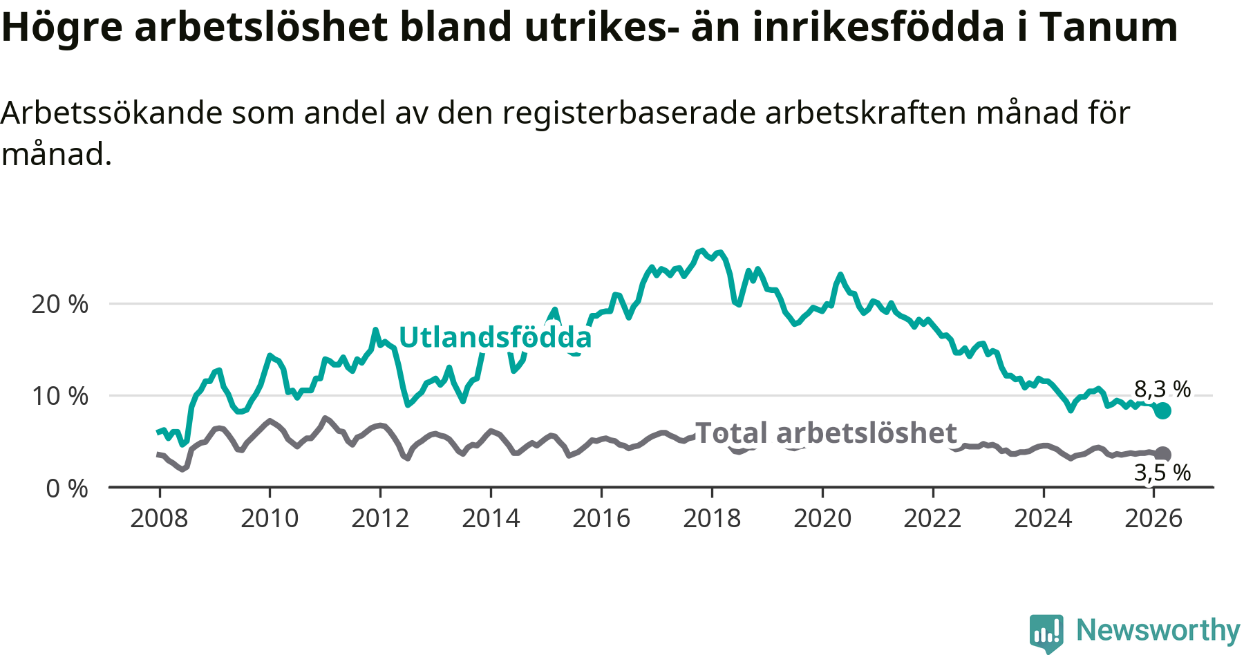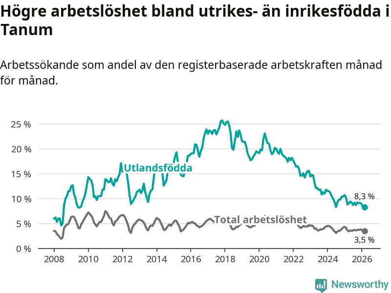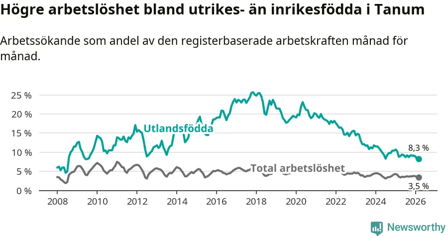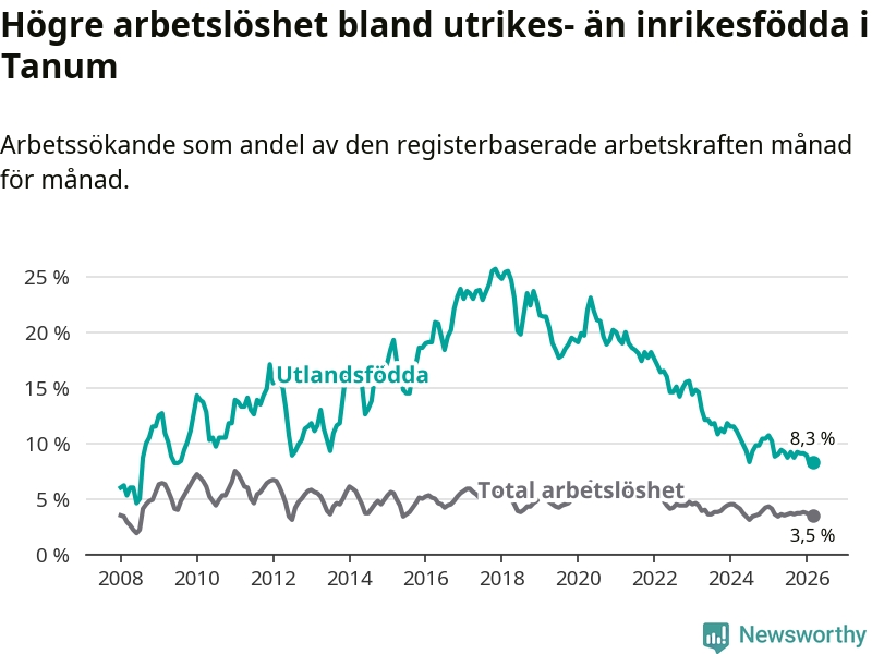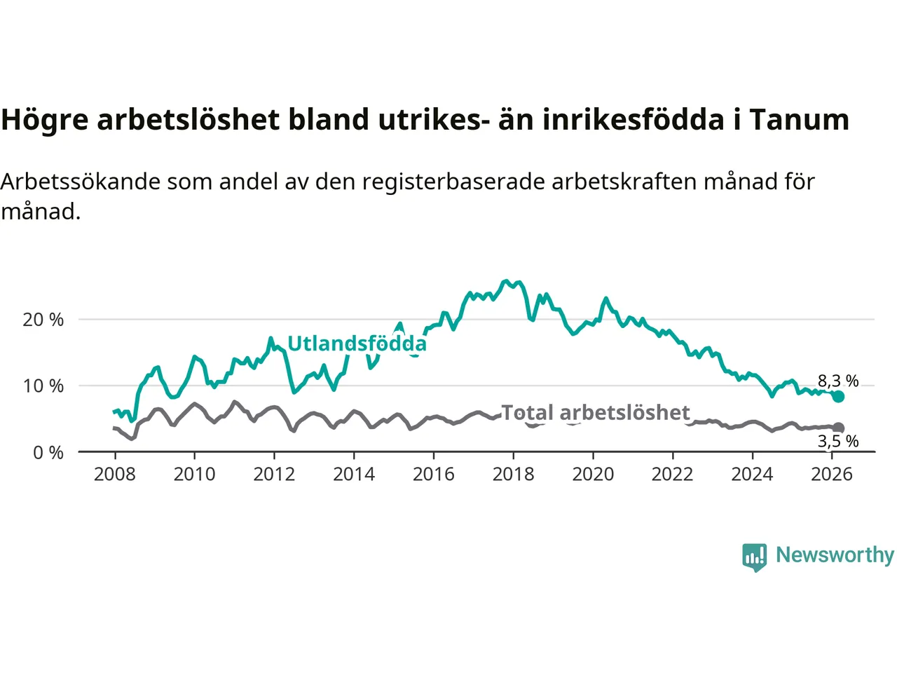 Arbetslösheten bland utlandsfödda var 8,3 procent i Tanum under mars månad, motsvarande 68 av 819 personer. Det är 0,5 procentenheter färre än vid samma tidpunkt i fjol (−4 om man räknar personer). Därmed är de utlandsföddas arbetslöshet lägre än vid samma tidpunkt i fjol för åttonde månaden i följd.