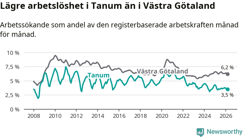 Tanum hade redan tidigare lägre arbetslöshet än snittet i hela Västra Götalands län och nu växer klyftan (3,5 procent i kommunen, jämfört med 6,2 procent i hela länet). Öckerö har den lägsta arbetslösheten i länet (2,6 procent), medan Gullspång har den högsta (8,1 procent). För att Tanum skulle komma ner i samma arbetslöshetsnivå som Öckerö skulle 51 personer behöva sysselsättas.