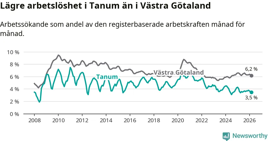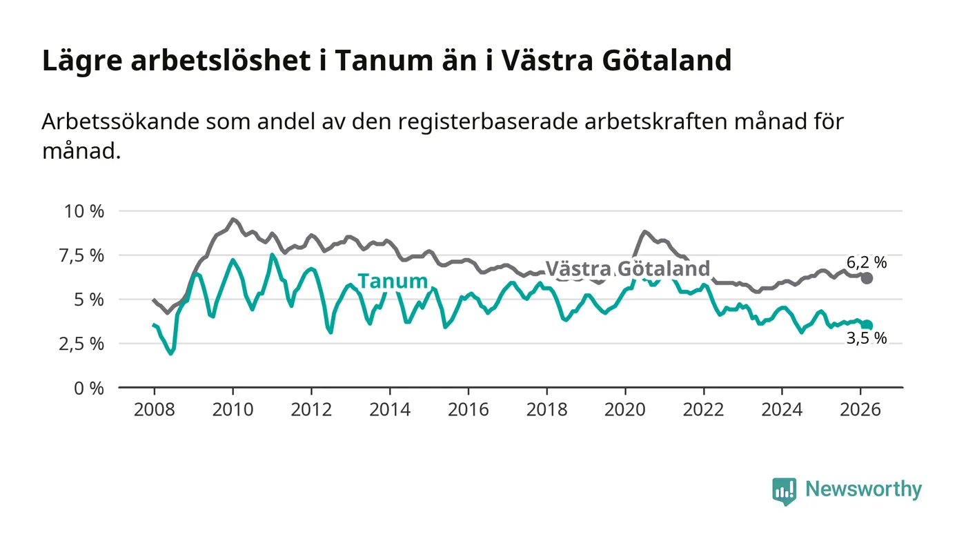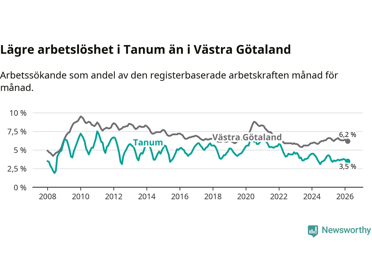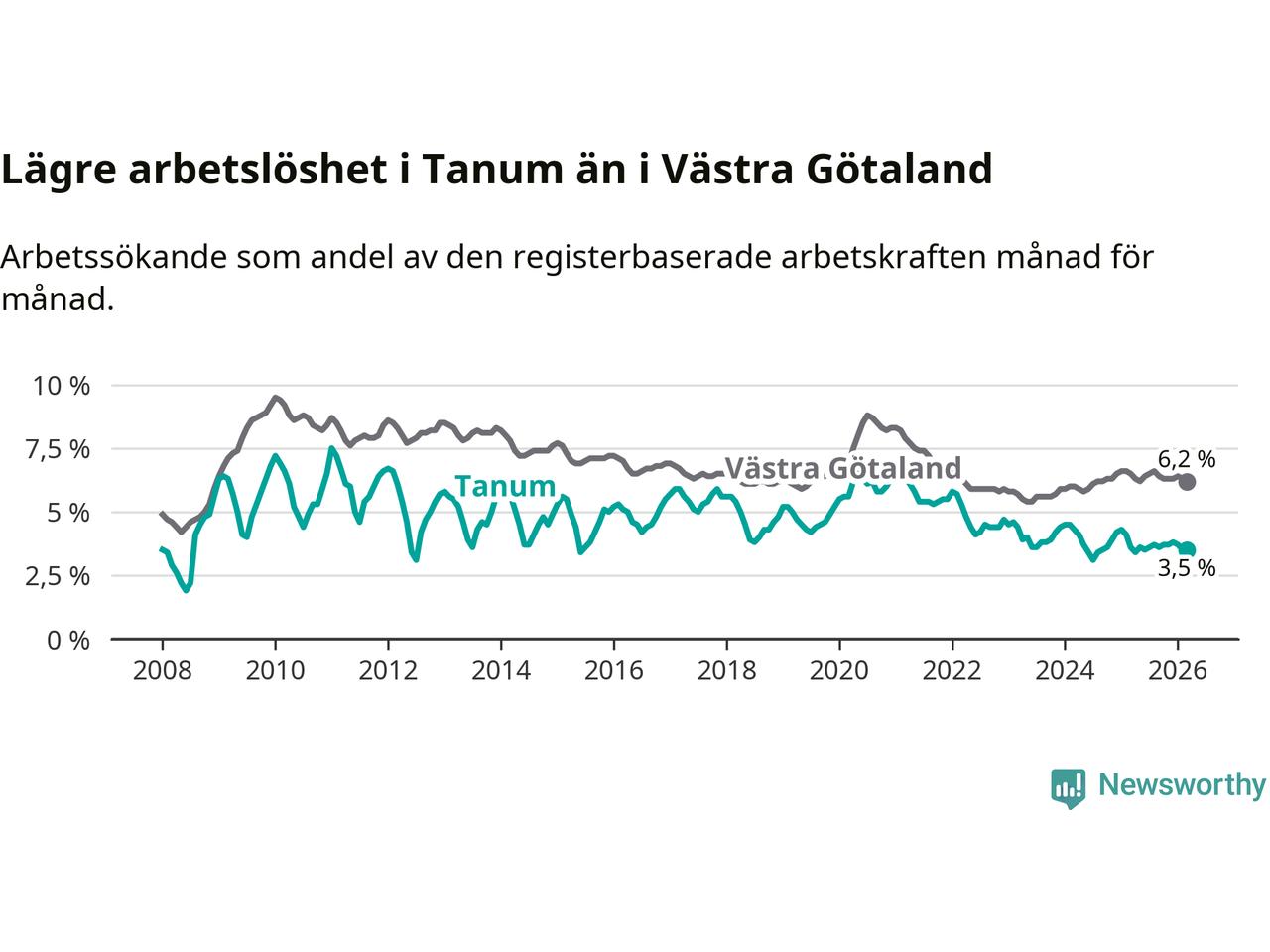 Under mars månad rapporterade Tanums kommun en total arbetslöshet på 3,5 procent. Det är en minskning jämfört med samma tidpunkt i fjol (−0,1 procentenheter). Även i Västra Götalands län sjunker arbetslösheten .