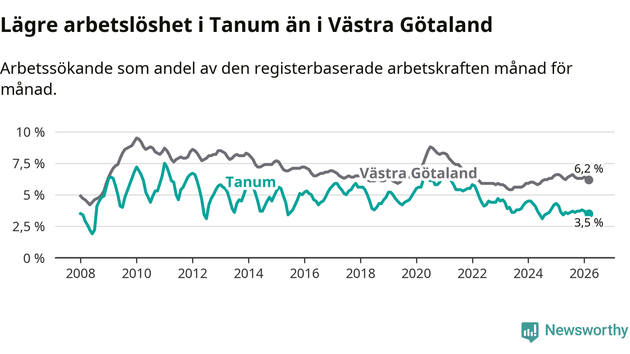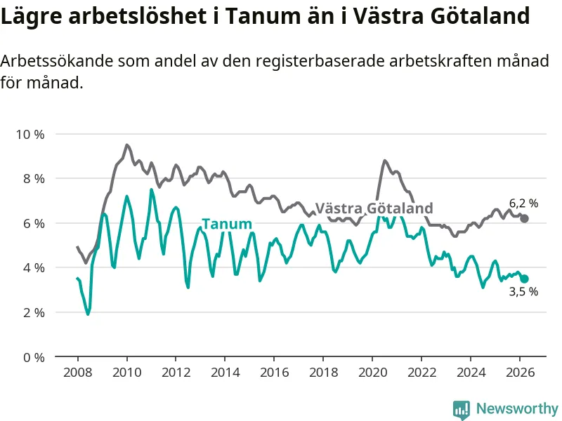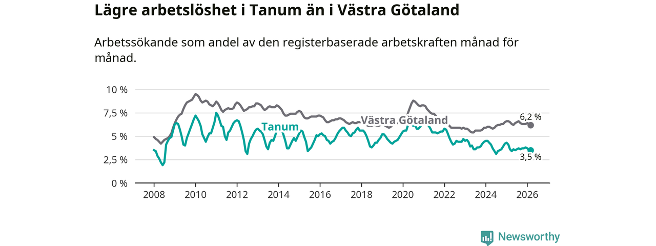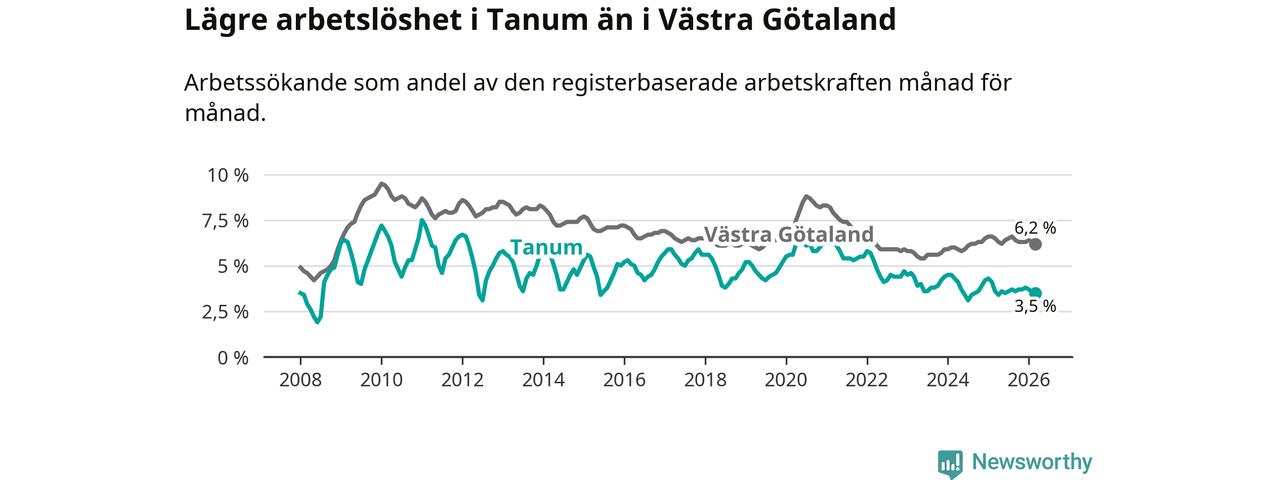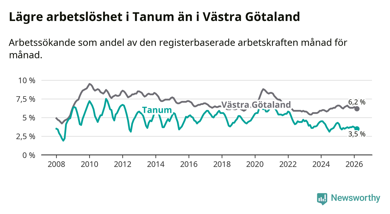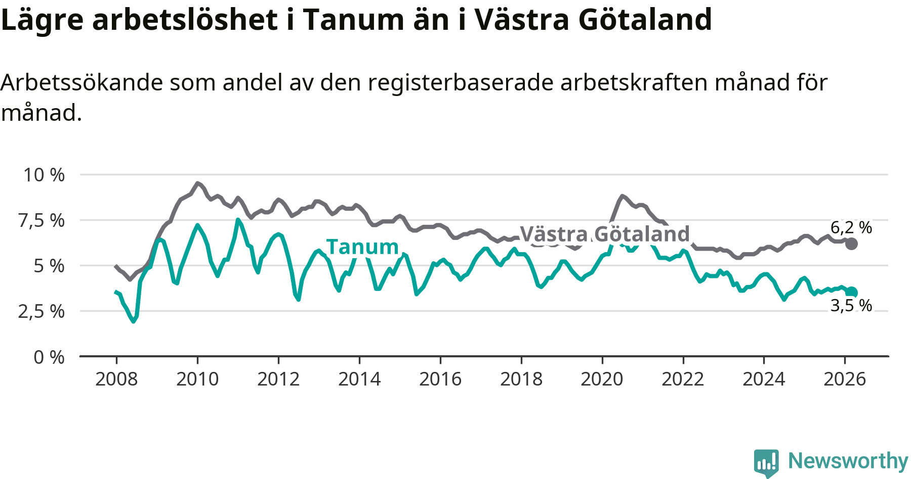 Under mars månad rapporterade Tanums kommun en total arbetslöshet på 3,5 procent. Det är en minskning jämfört med samma tidpunkt i fjol (−0,1 procentenheter). Även i Västra Götalands län sjunker arbetslösheten .