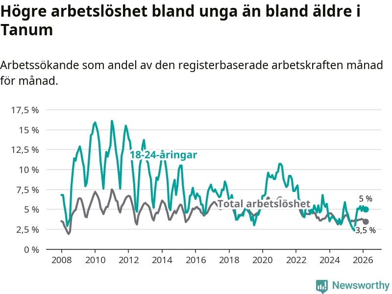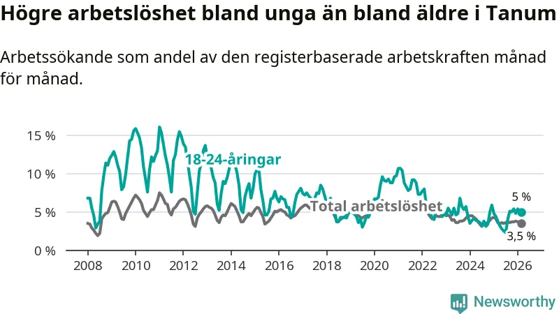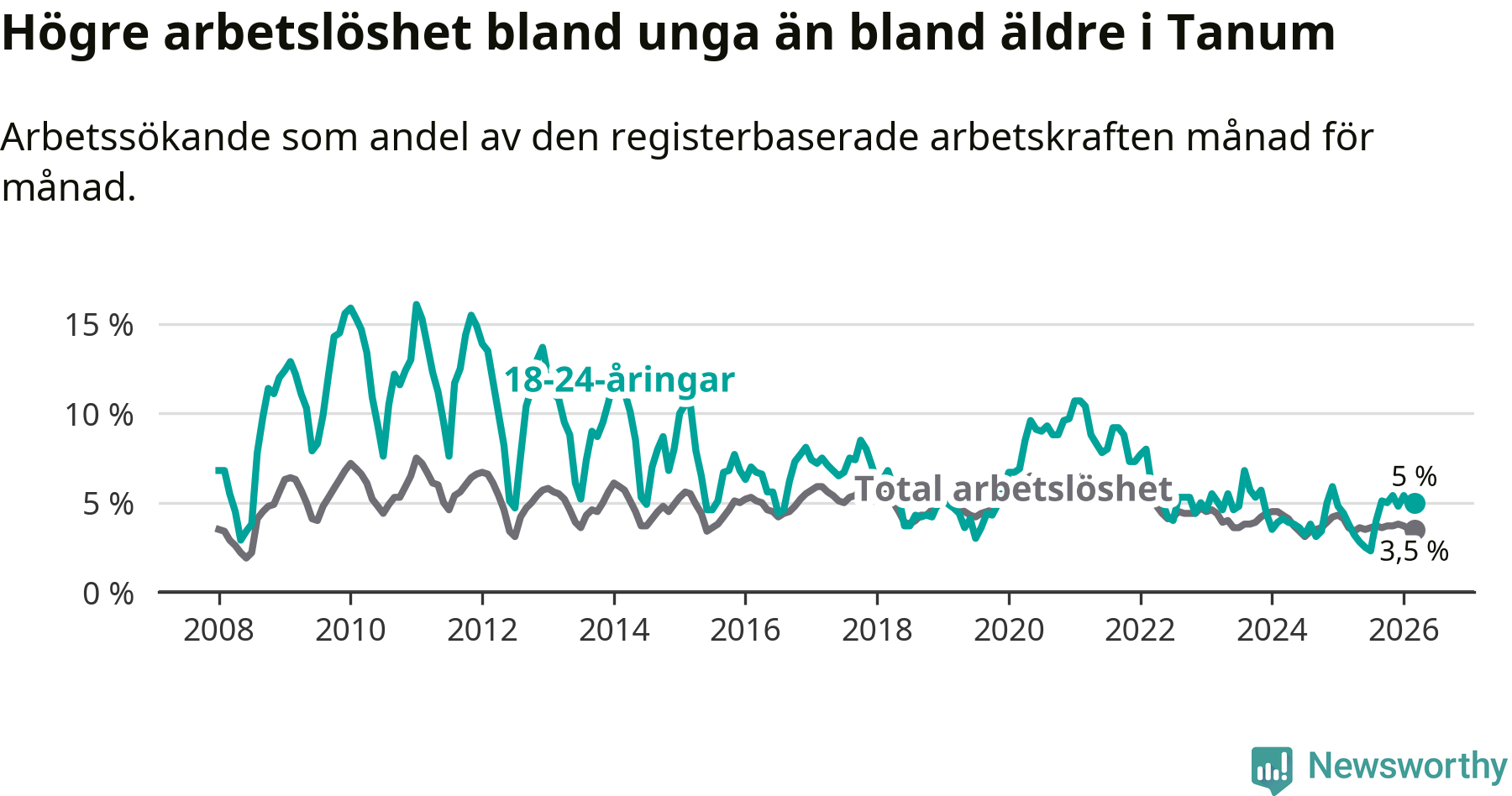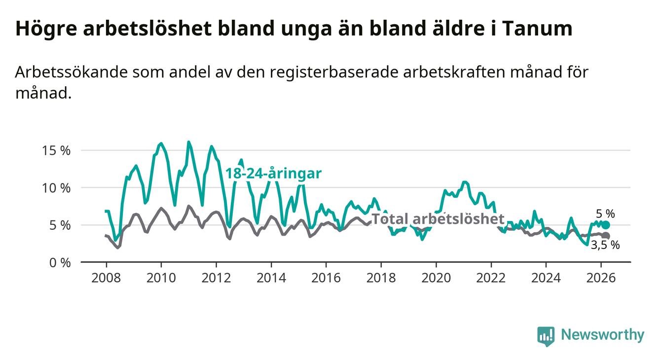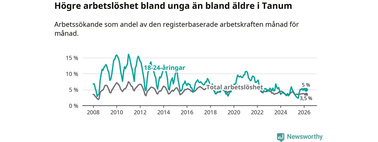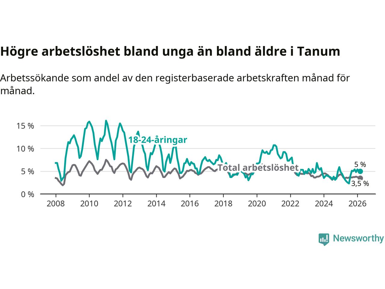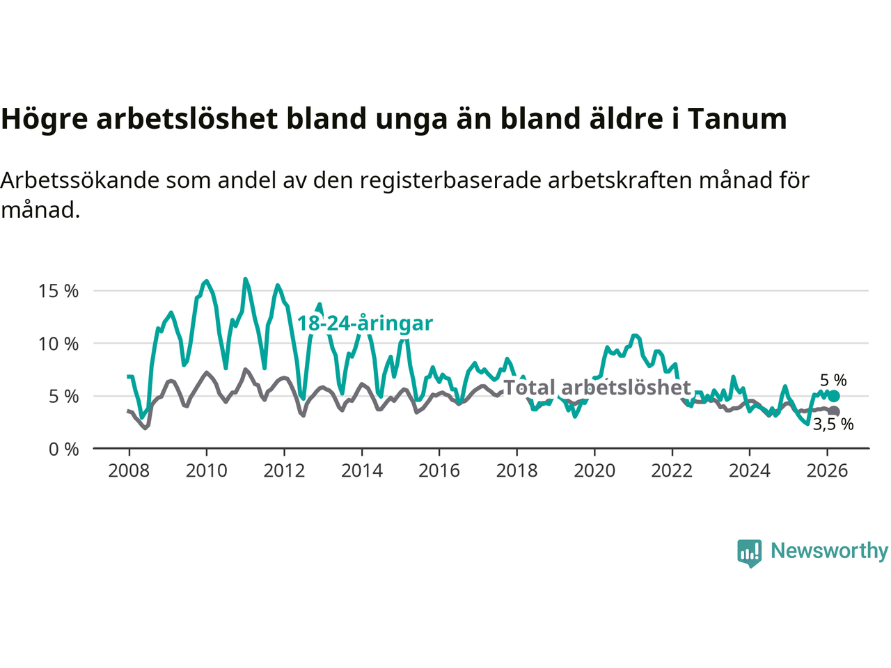 Den senaste månadsstatistiken från Arbetsförmedlingen visar på en uppgång i ungdomsarbetslöshet i Tanums kommun med 1,2 procentenheter. Arbetslösheten bland personer i åldern 18–24 år låg i mars på 5,0 procent.