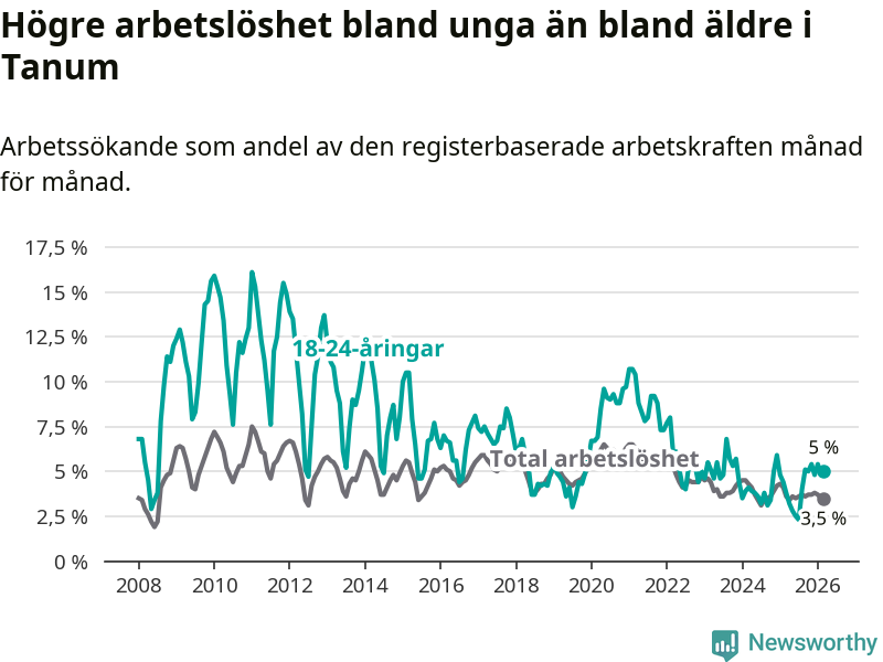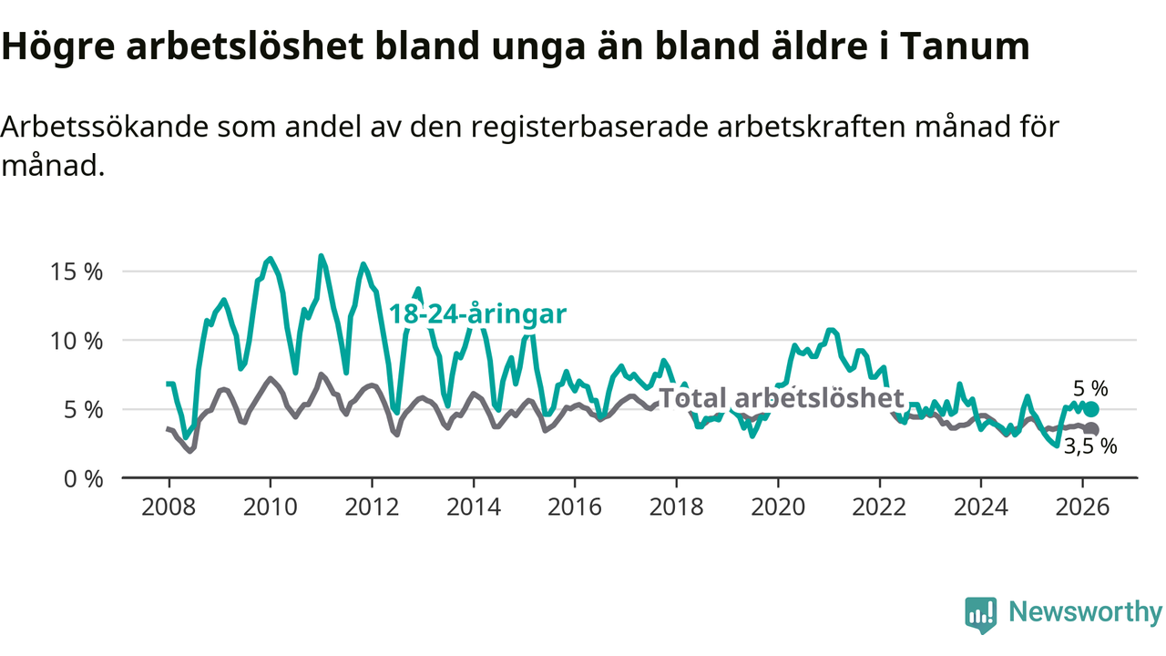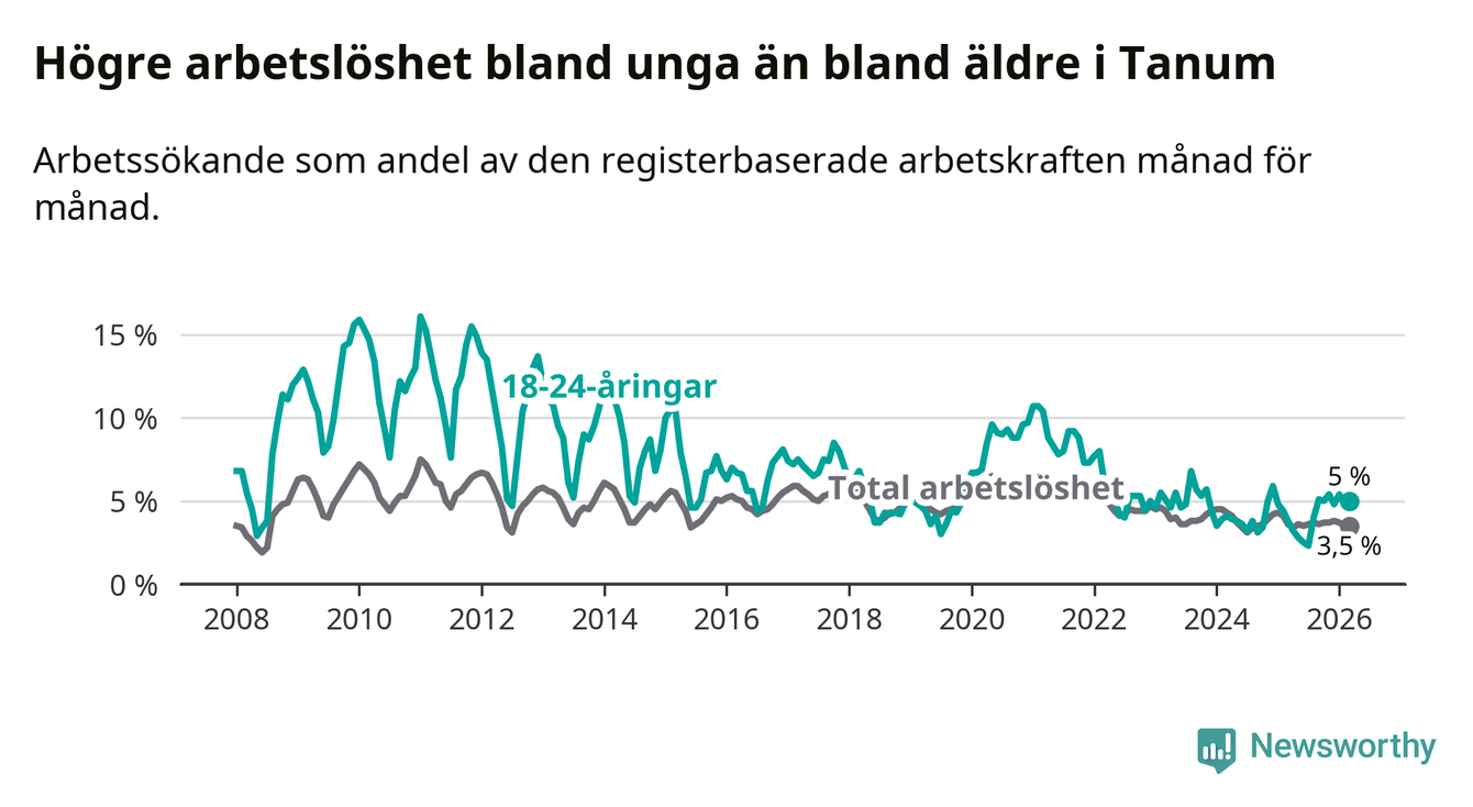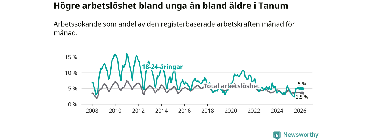 Till skillnad från den totala arbetslösheten stiger arbetslösheten bland unga (+1,2 procentenheter). I mars var 5,0 procent av 18–24-åringarna inskrivna som arbetssökande (motsvarande 26 personer). Mäter vi antalet inskrivna ser vi en ökning med sex personer på ett års sikt.