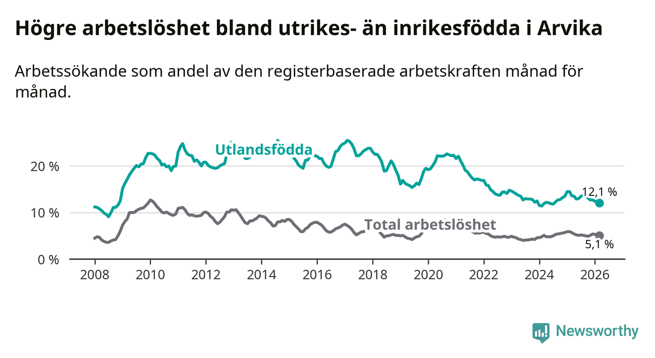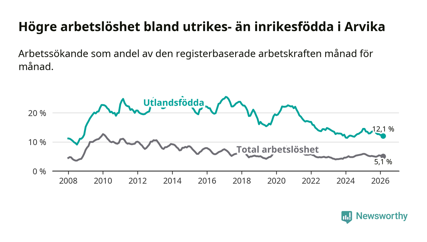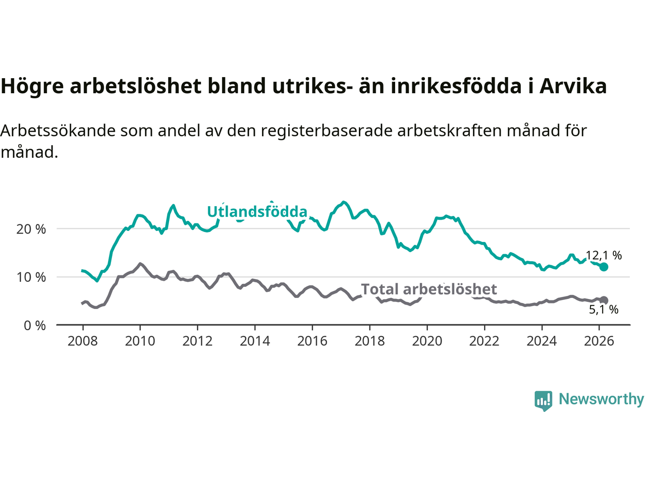 Arbetslösheten bland utlandsfödda var 12,1 procent i Arvika under mars månad, motsvarande 220 av 1 818 personer. Det är 1,5 procentenheter färre än vid samma tidpunkt i fjol (−24 om man räknar personer).