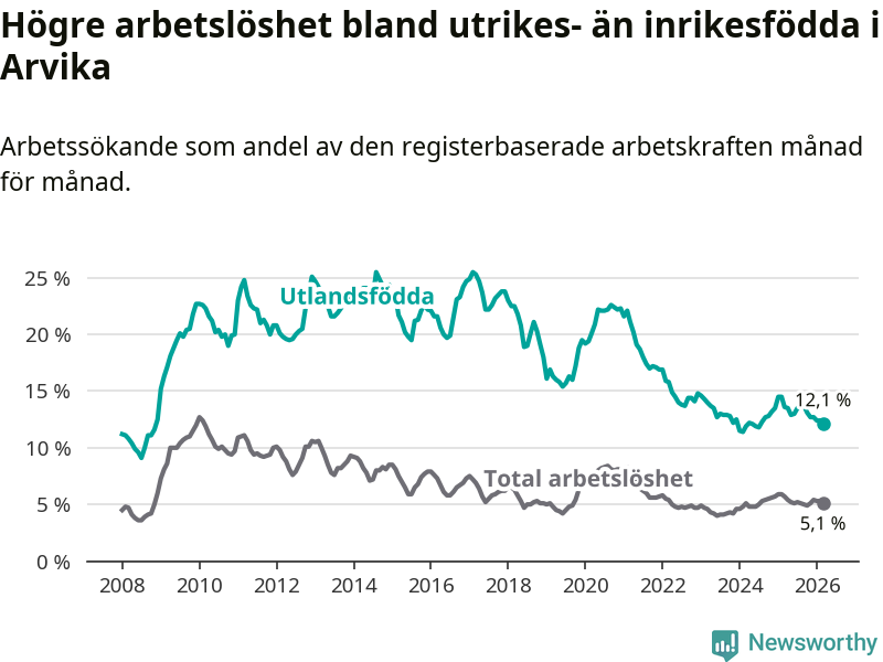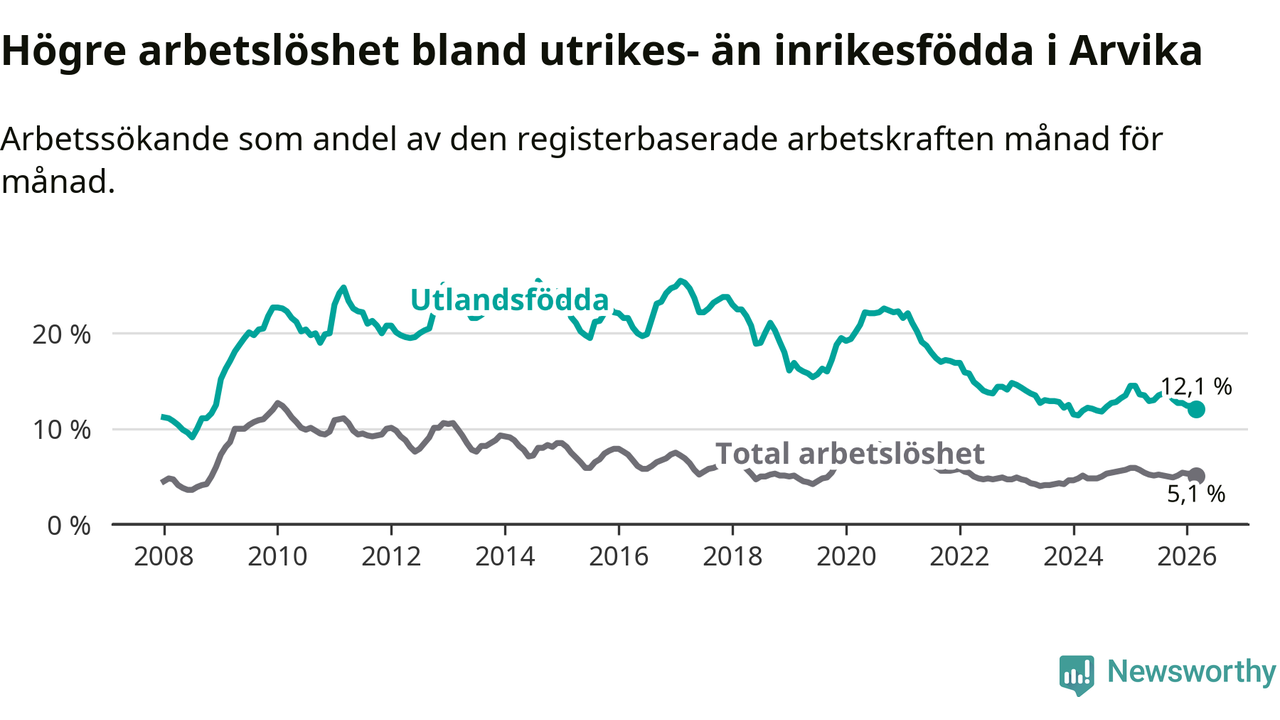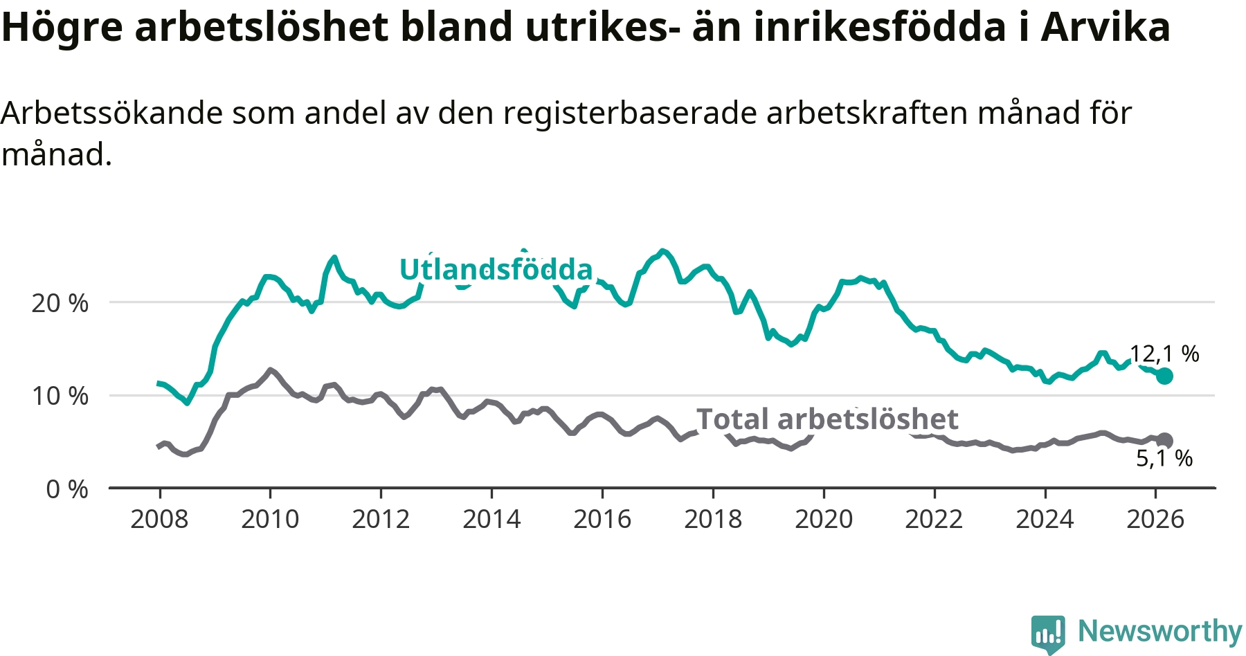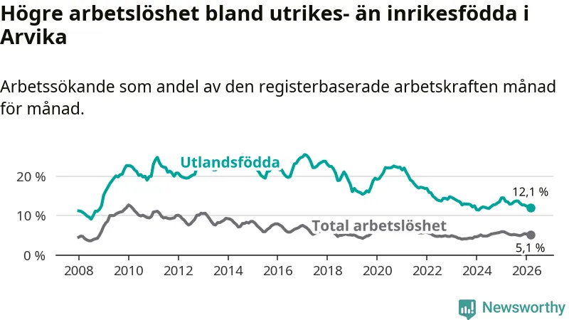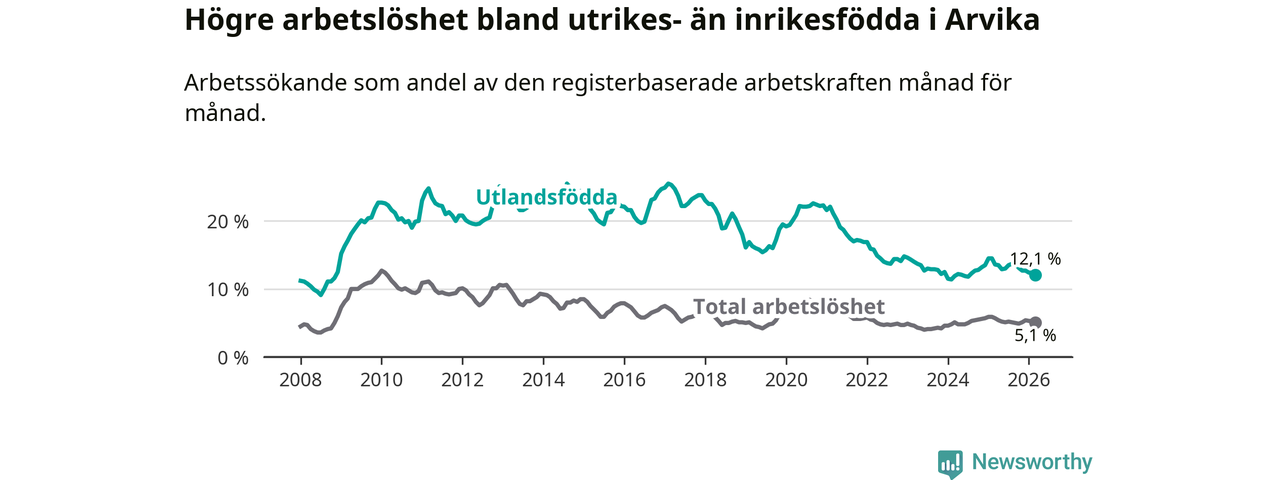 Arbetslösheten bland utlandsfödda var 12,1 procent i Arvika under mars månad, motsvarande 220 av 1 818 personer. Det är 1,5 procentenheter färre än vid samma tidpunkt i fjol (−24 om man räknar personer).