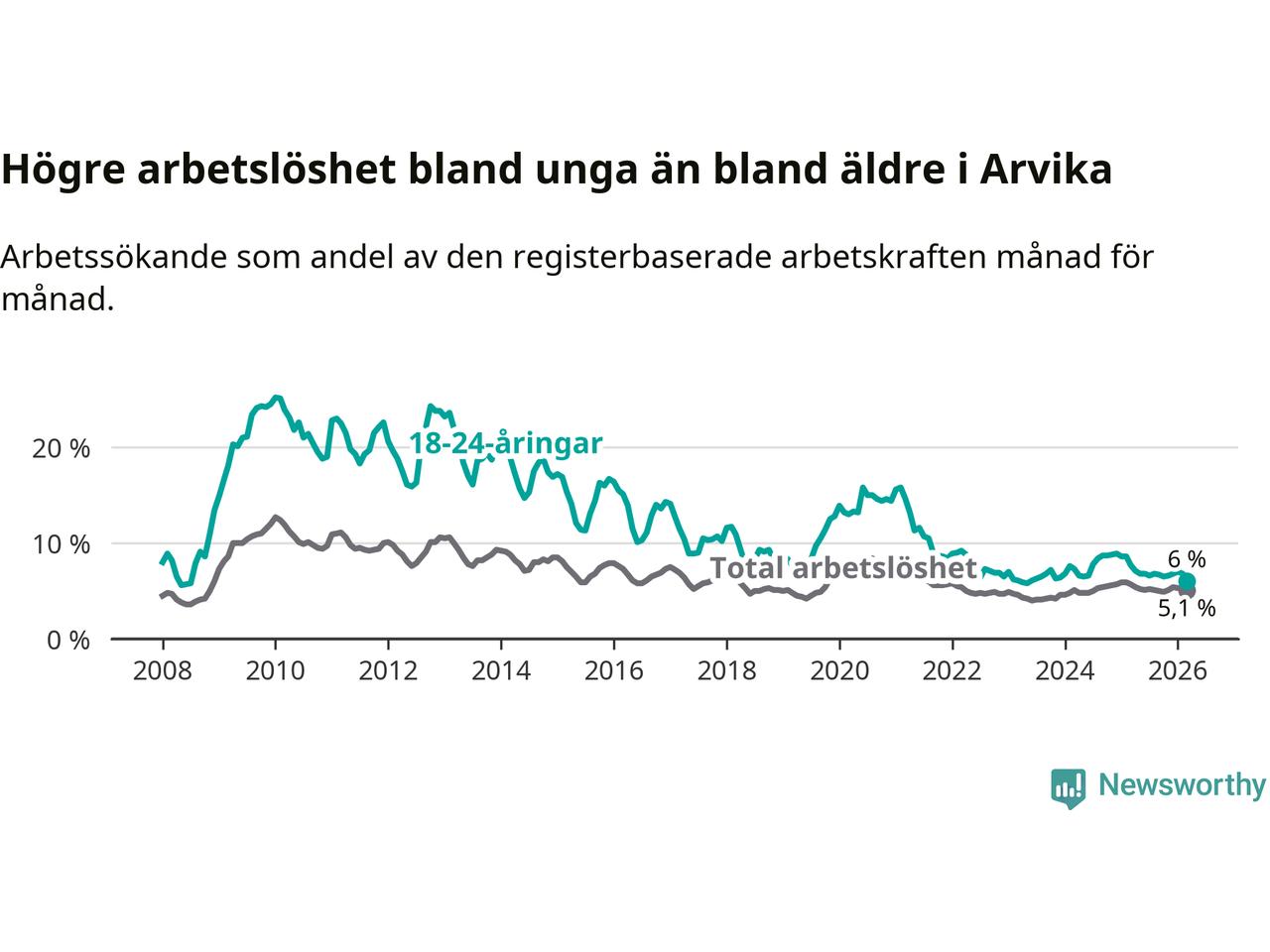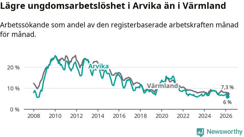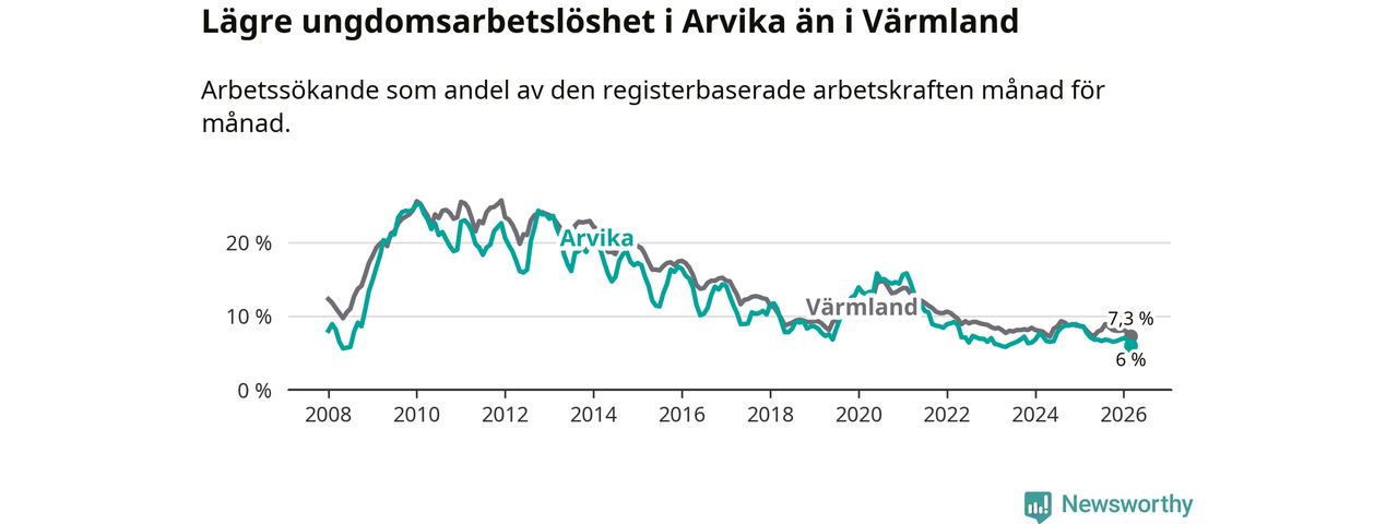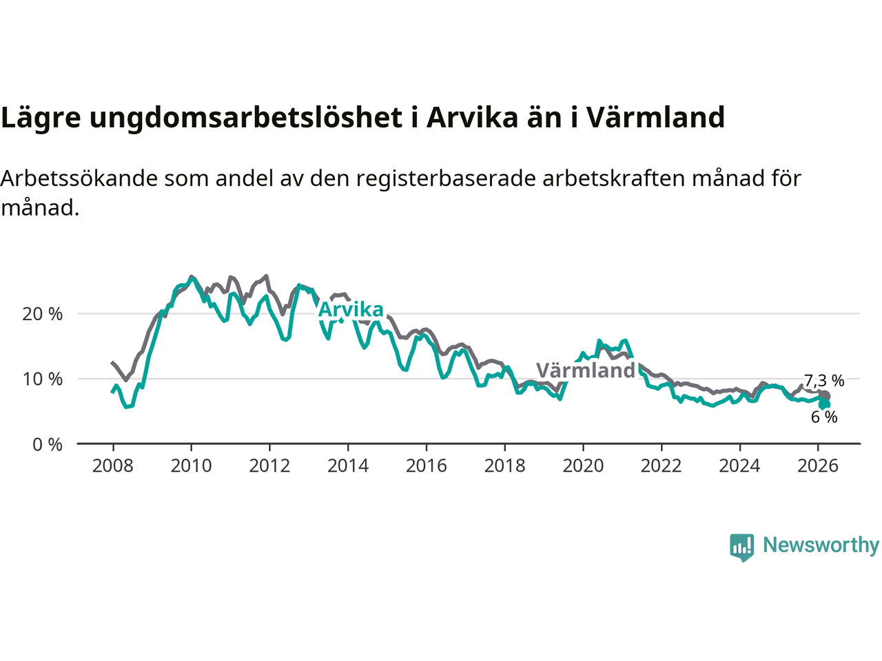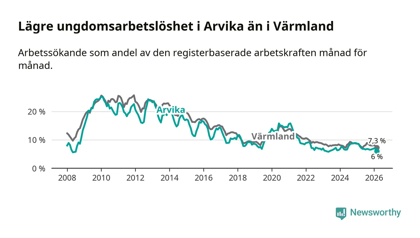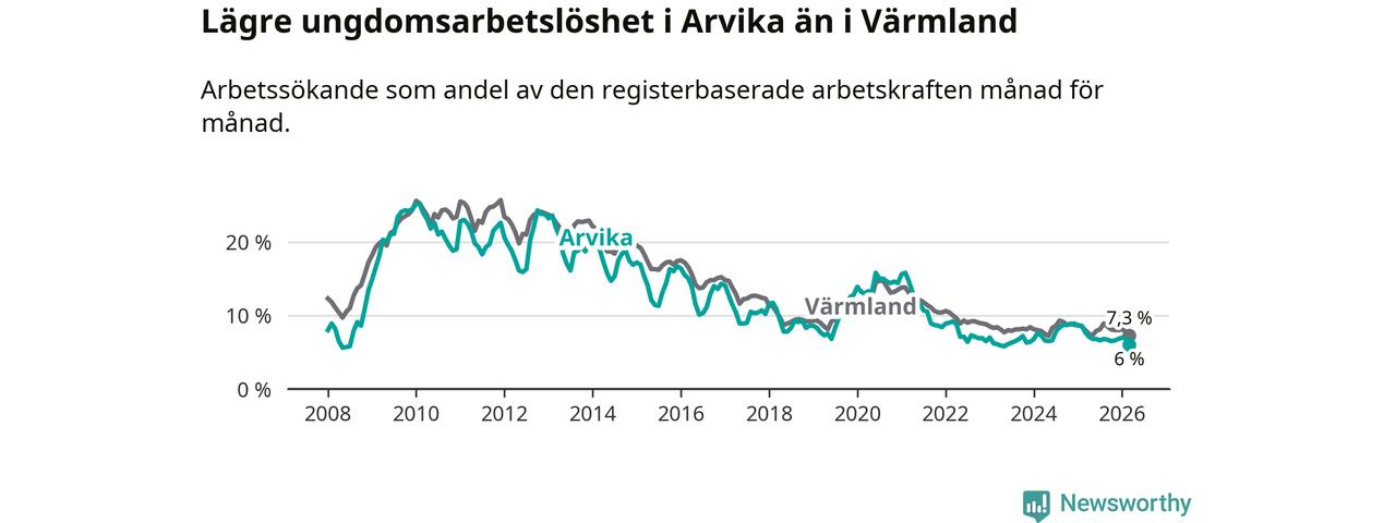 I och med den senaste månadens nedgång har de ungas arbetslöshet i Arvika sjunkit nio månader i följd (ner från 6,8 procent i juni 2025 till 6,0 procent nu). Den nuvarande arbetslöshetsnivån är den lägsta sedan maj 2023.