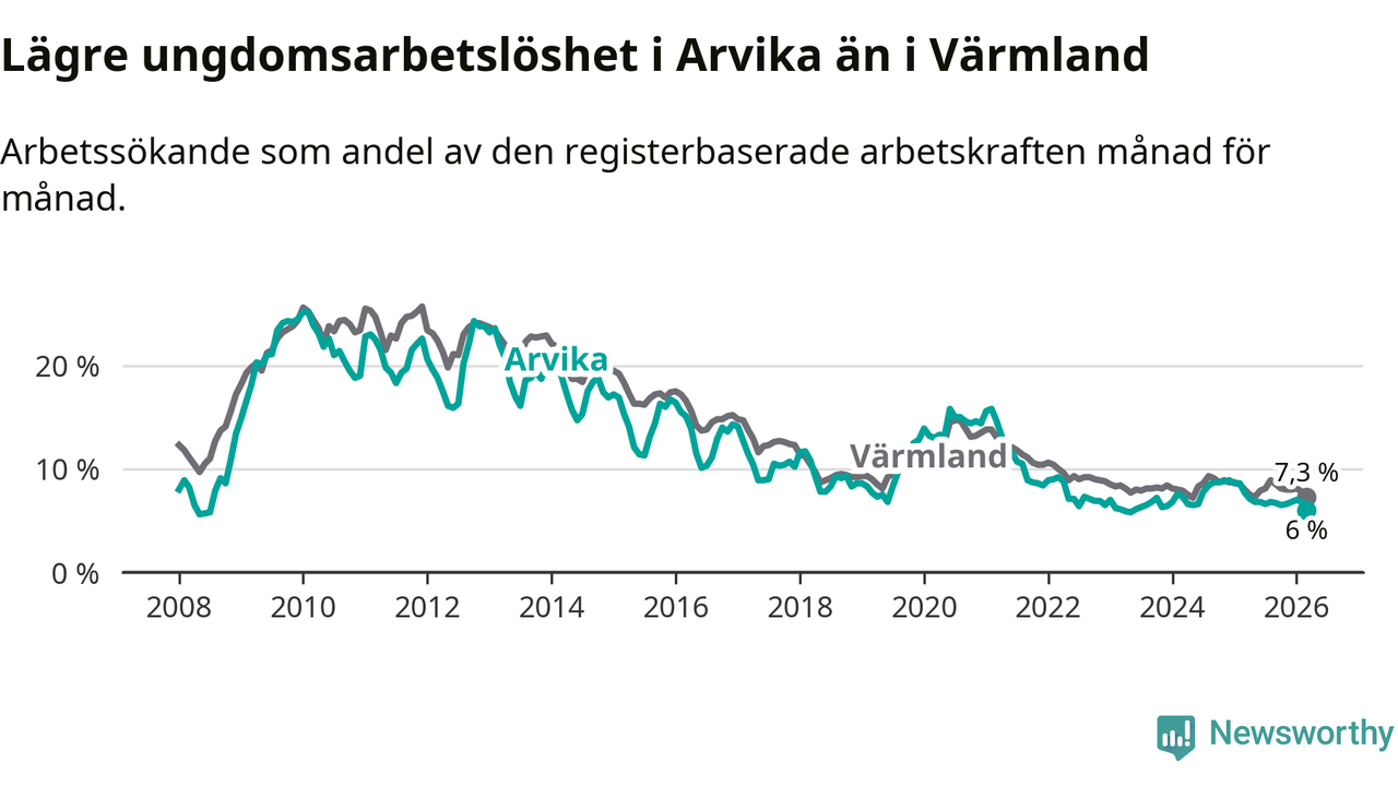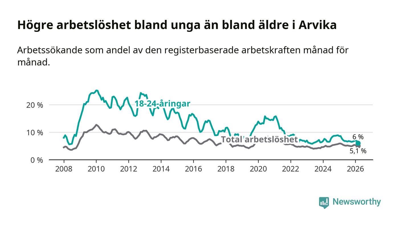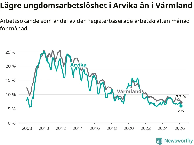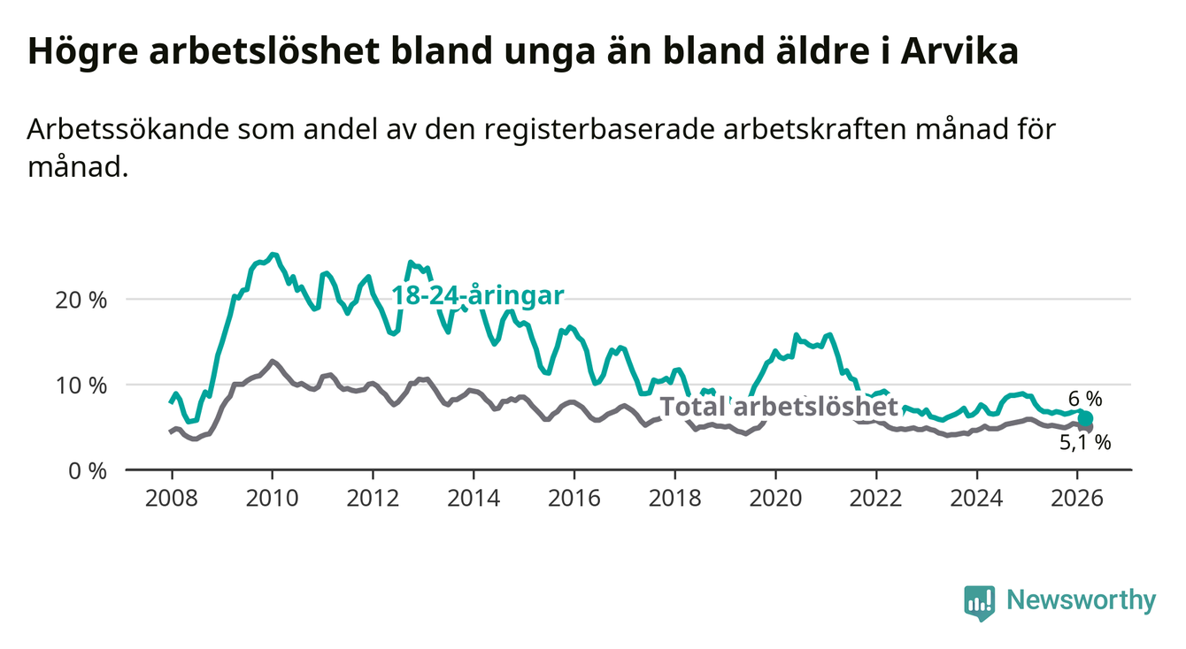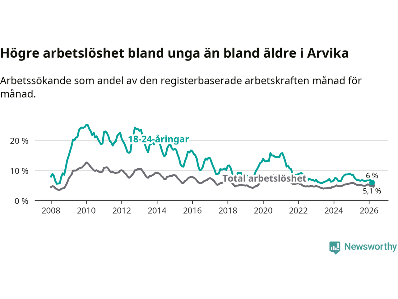 I och med den senaste månadens nedgång har de ungas arbetslöshet i Arvika sjunkit nio månader i följd (ner från 6,8 procent i juni 2025 till 6,0 procent nu). Den nuvarande arbetslöshetsnivån är den lägsta sedan maj 2023.