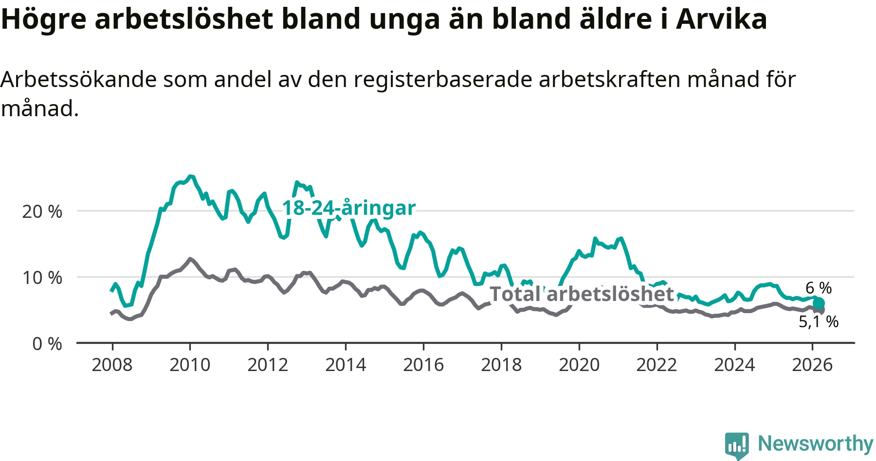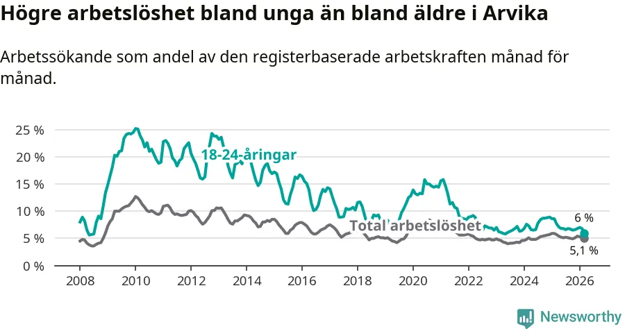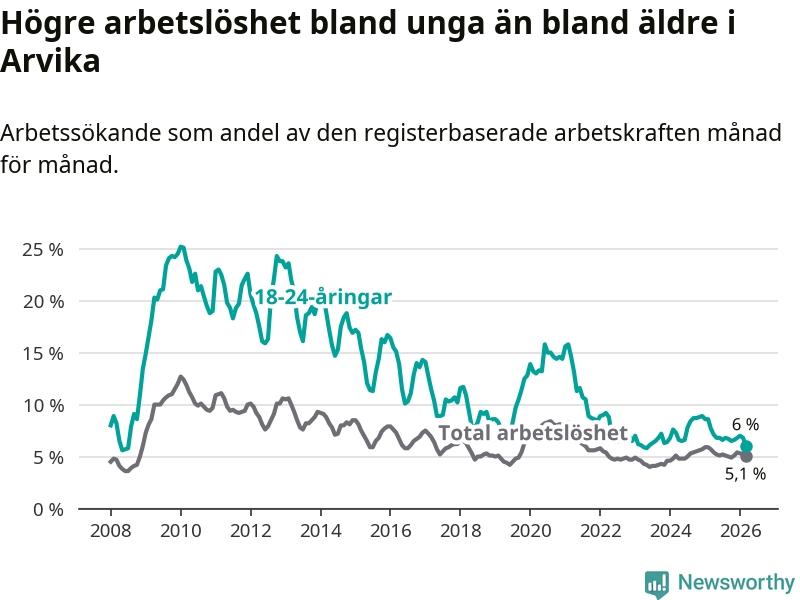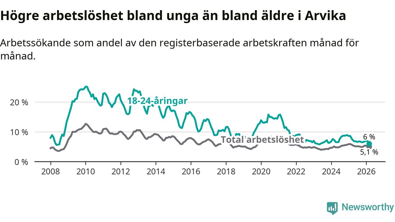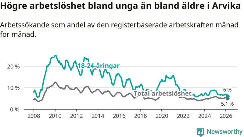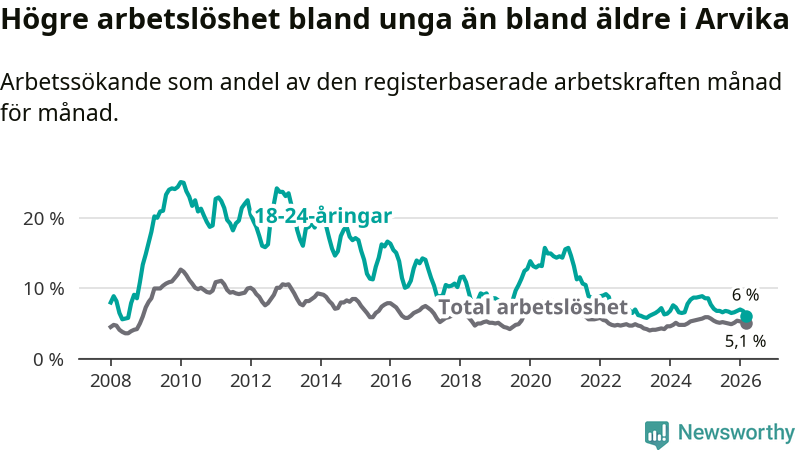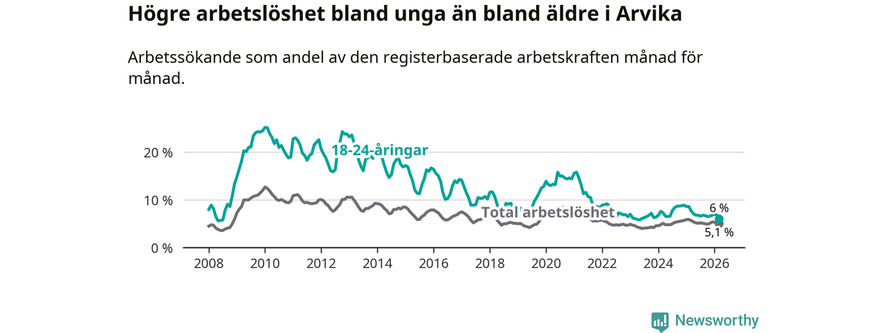 I och med den senaste månadens nedgång har de ungas arbetslöshet i Arvika sjunkit nio månader i följd (ner från 6,8 procent i juni 2025 till 6,0 procent nu). Den nuvarande arbetslöshetsnivån är den lägsta sedan maj 2023.