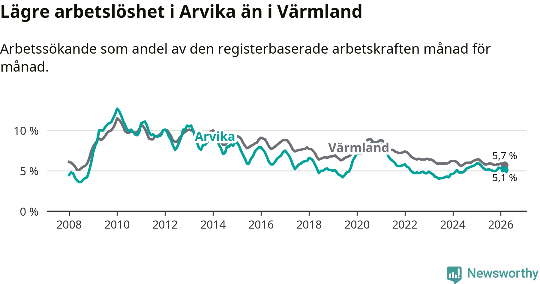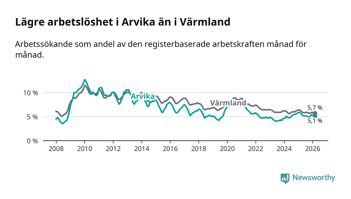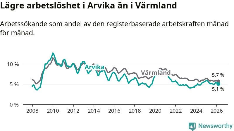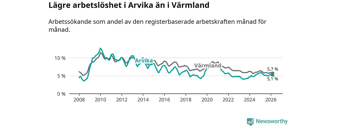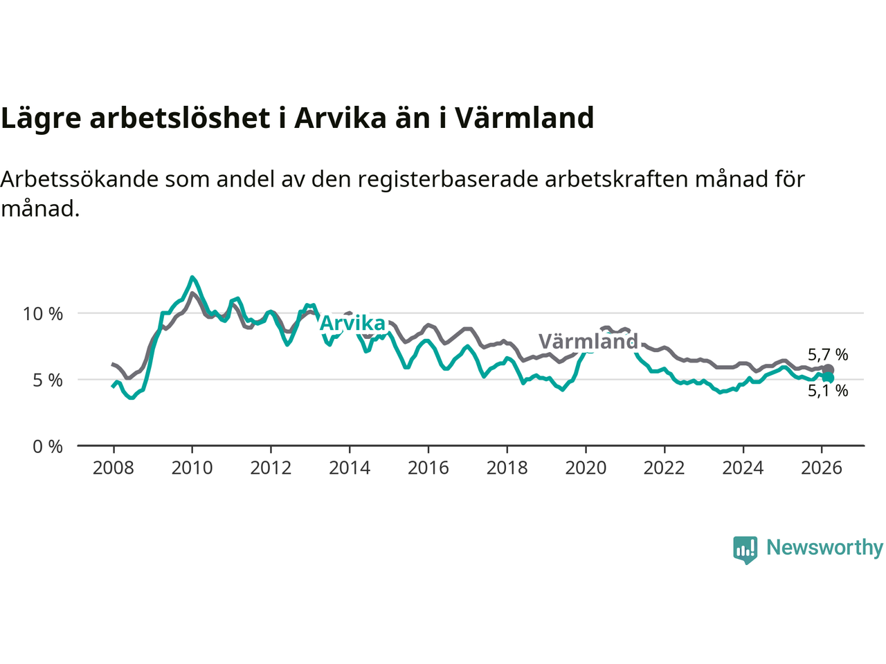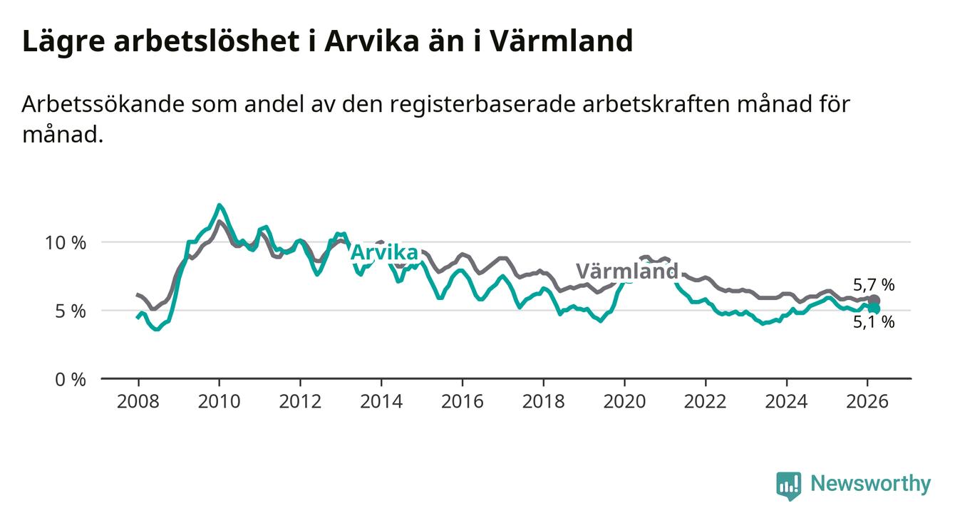 Under mars månad rapporterade Arvika kommun en total arbetslöshet på 5,1 procent. Det är en minskning jämfört med samma tidpunkt i fjol (−0,6 procentenheter). Även i Värmlands län sjunker arbetslösheten .