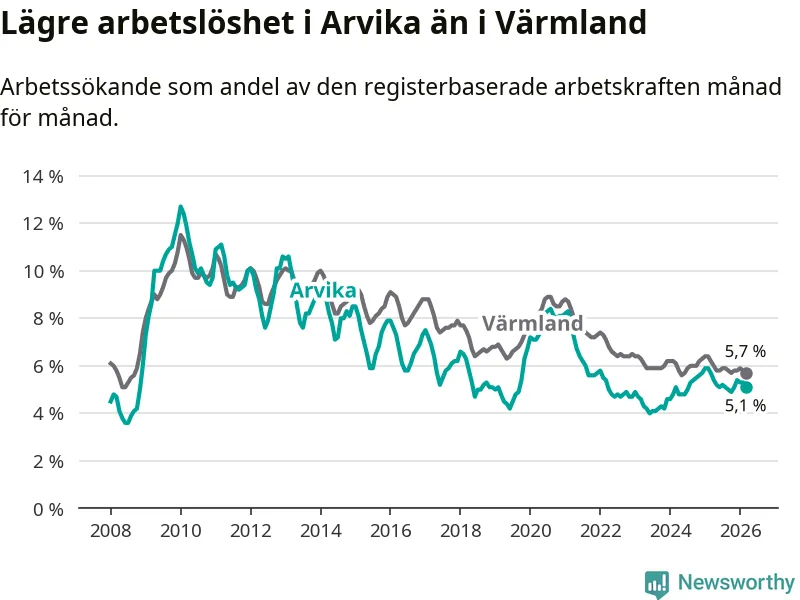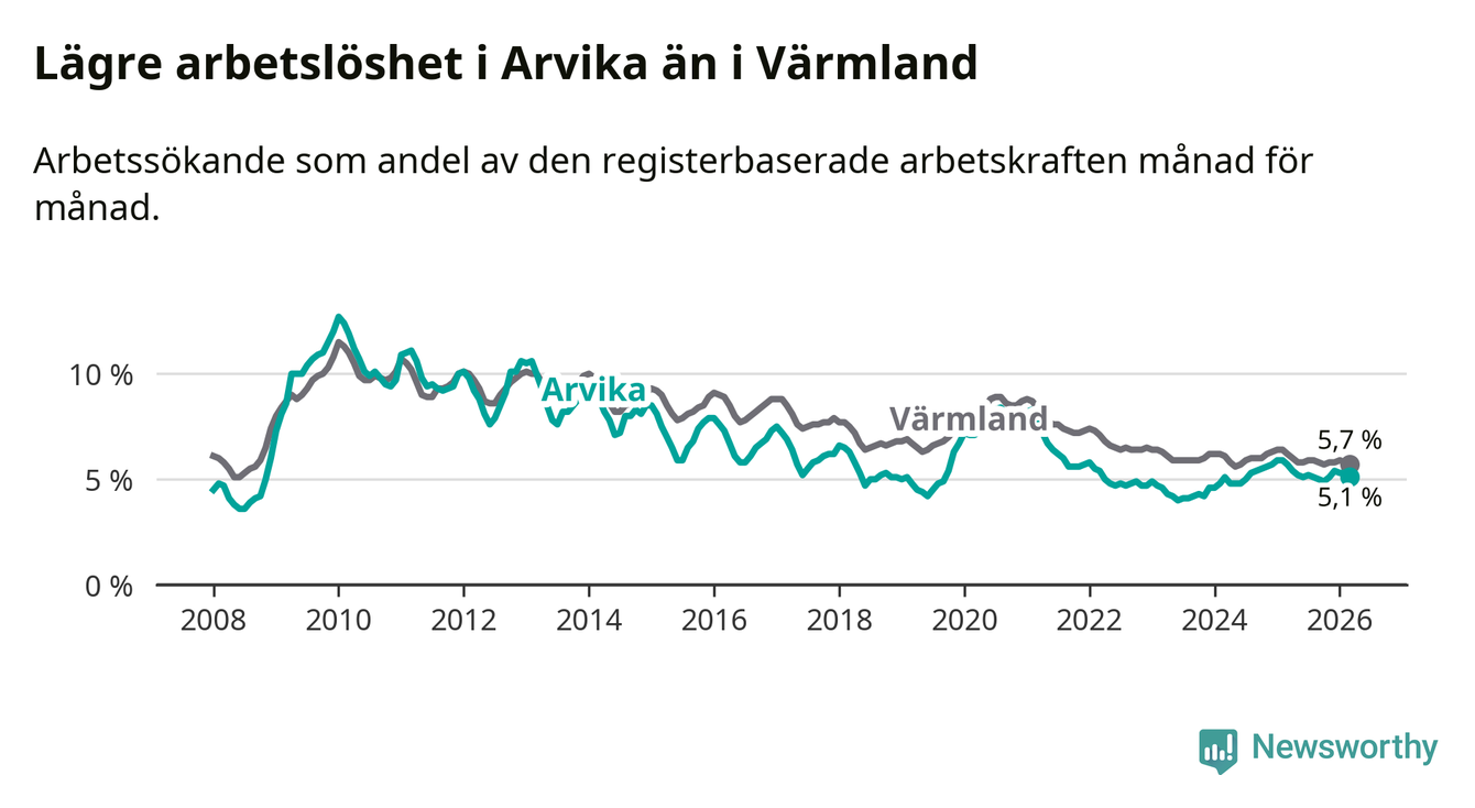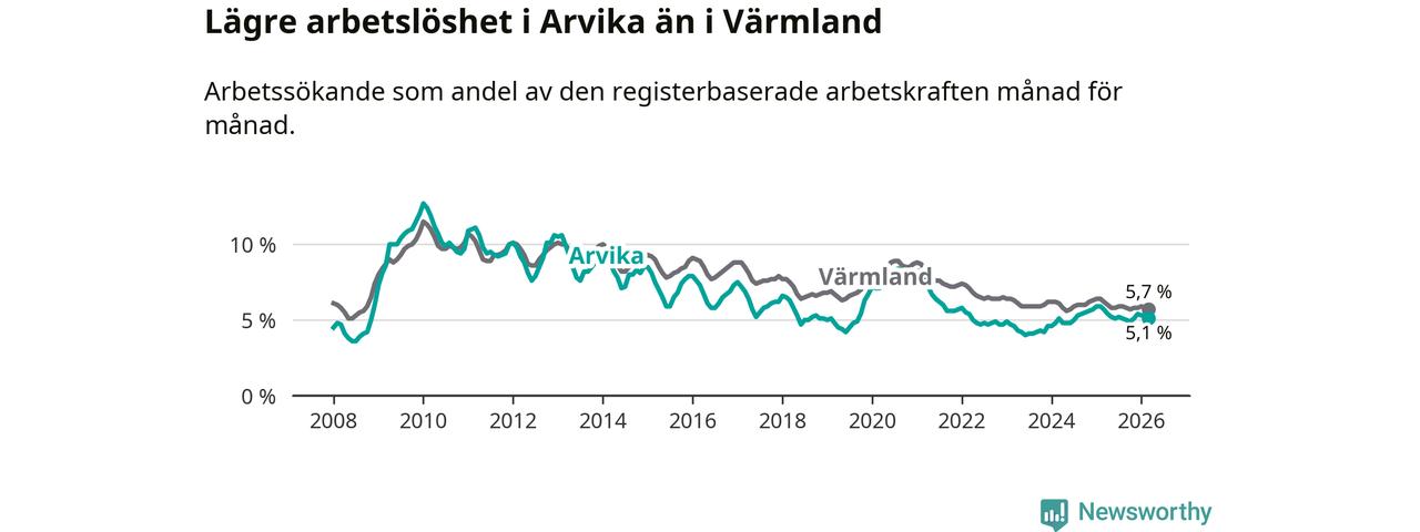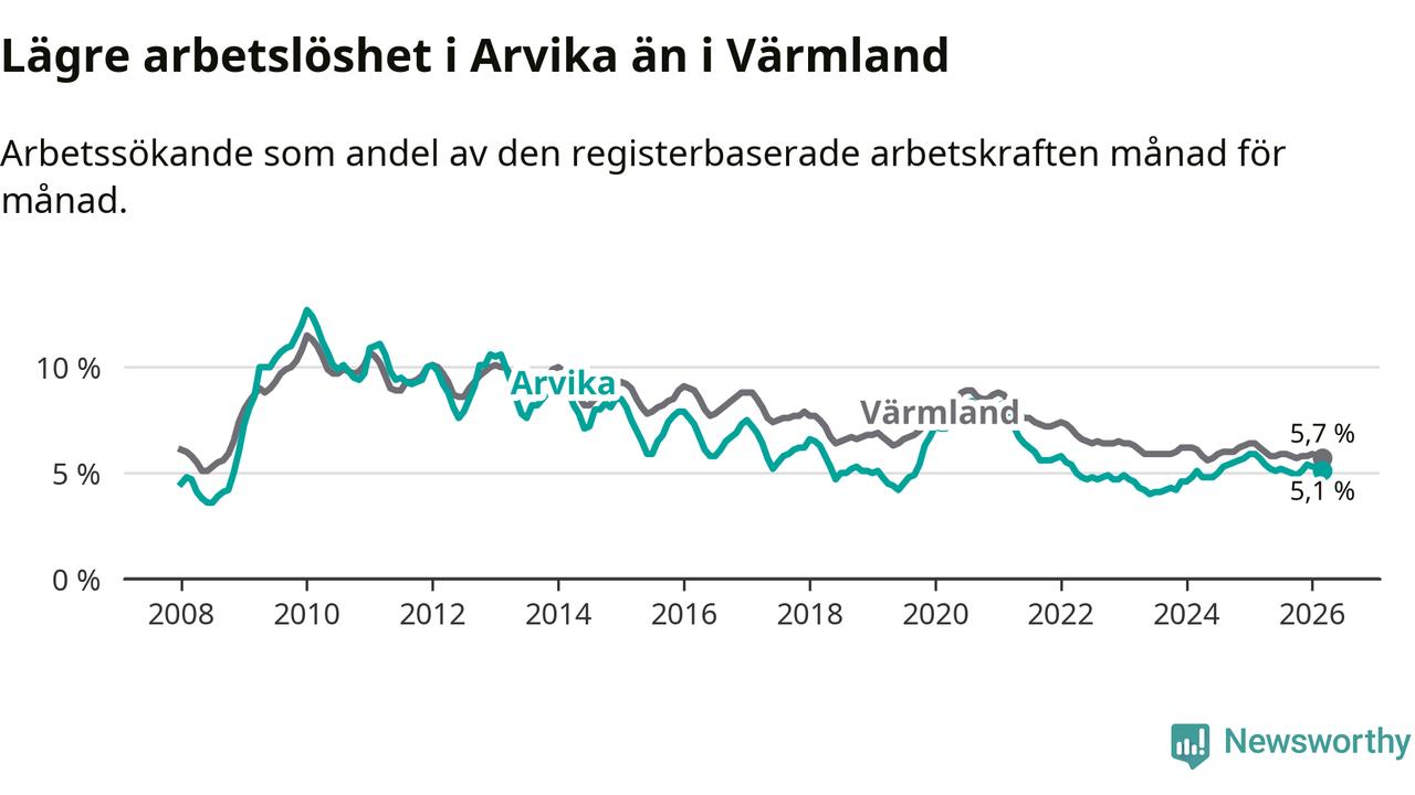 Arvika hade redan tidigare lägre arbetslöshet än snittet i hela Värmlands län och nu växer klyftan (5,1 procent i kommunen, jämfört med 5,7 procent i hela länet). Torsby har den lägsta arbetslösheten i länet (3,3 procent), medan Filipstad har den högsta (8,4 procent). För att Arvika skulle komma ner i samma arbetslöshetsnivå som Torsby skulle 212 personer behöva sysselsättas.