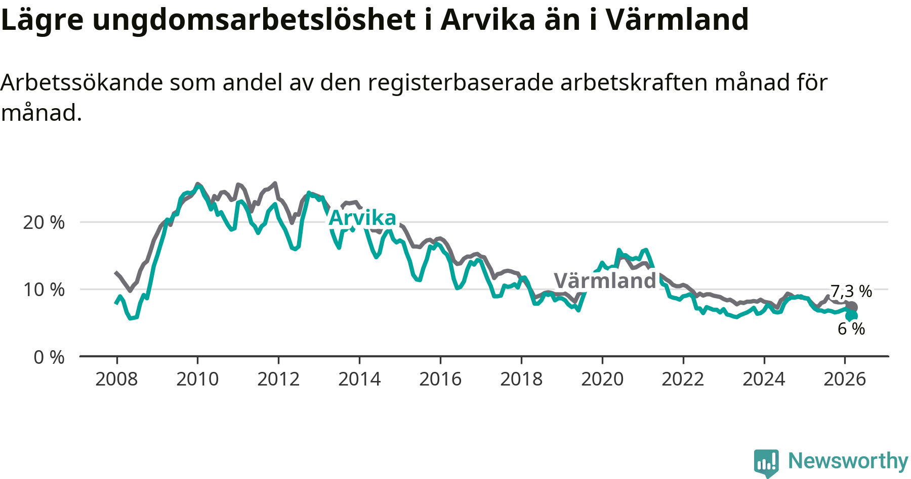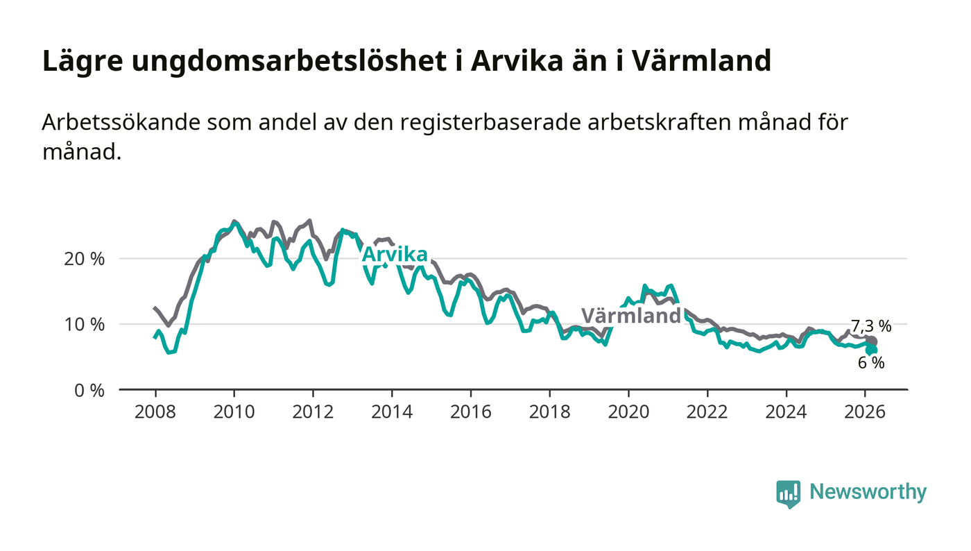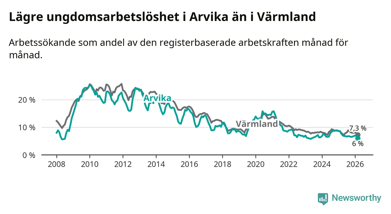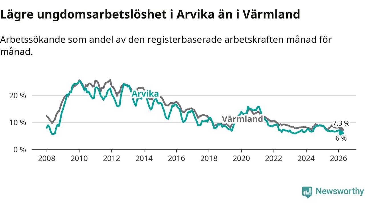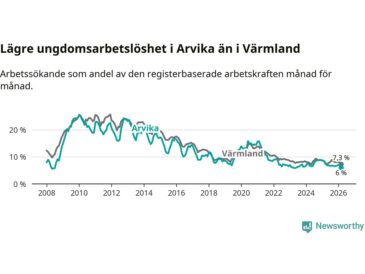 Precis som den totala arbetslösheten ligger ungdomsarbetslösheten i Arvika lägre än i Värmland som helhet. Skillnaden mellan kommunen och länet är 1,3 procentenheter.