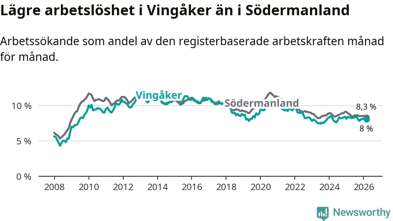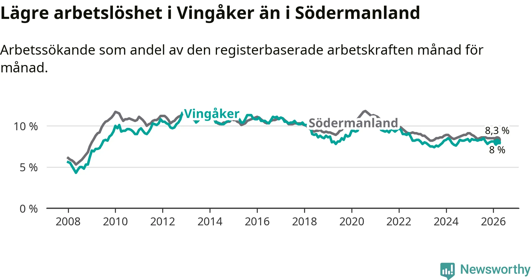 Vingåker hade redan tidigare lägre arbetslöshet än snittet i hela Södermanlands län och nu växer klyftan (8,0 procent i kommunen, jämfört med 8,3 procent i hela länet). Trosa har den lägsta arbetslösheten i länet (3,6 procent), medan Eskilstuna har den högsta (10,5 procent). För att Vingåker skulle komma ner i samma arbetslöshetsnivå som Trosa skulle 172 personer behöva sysselsättas.