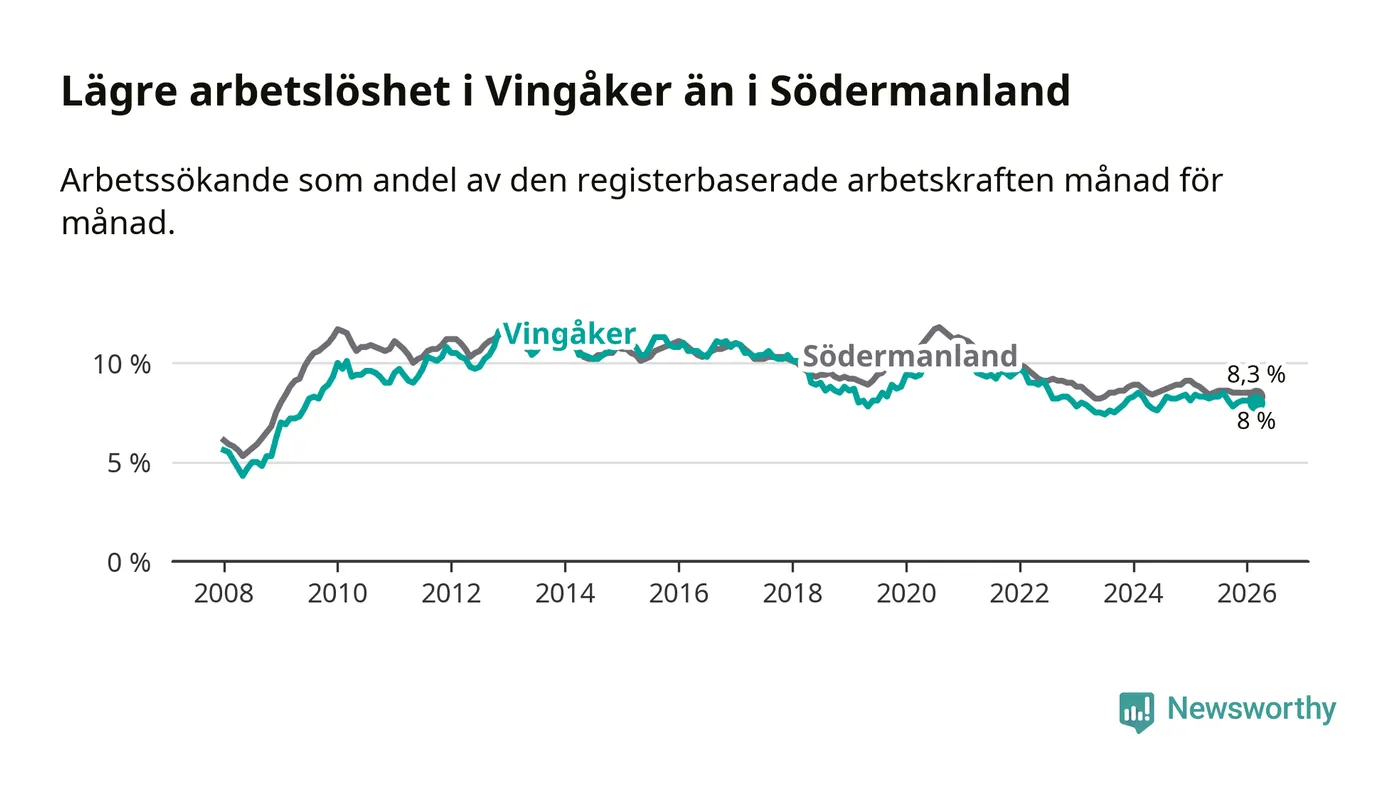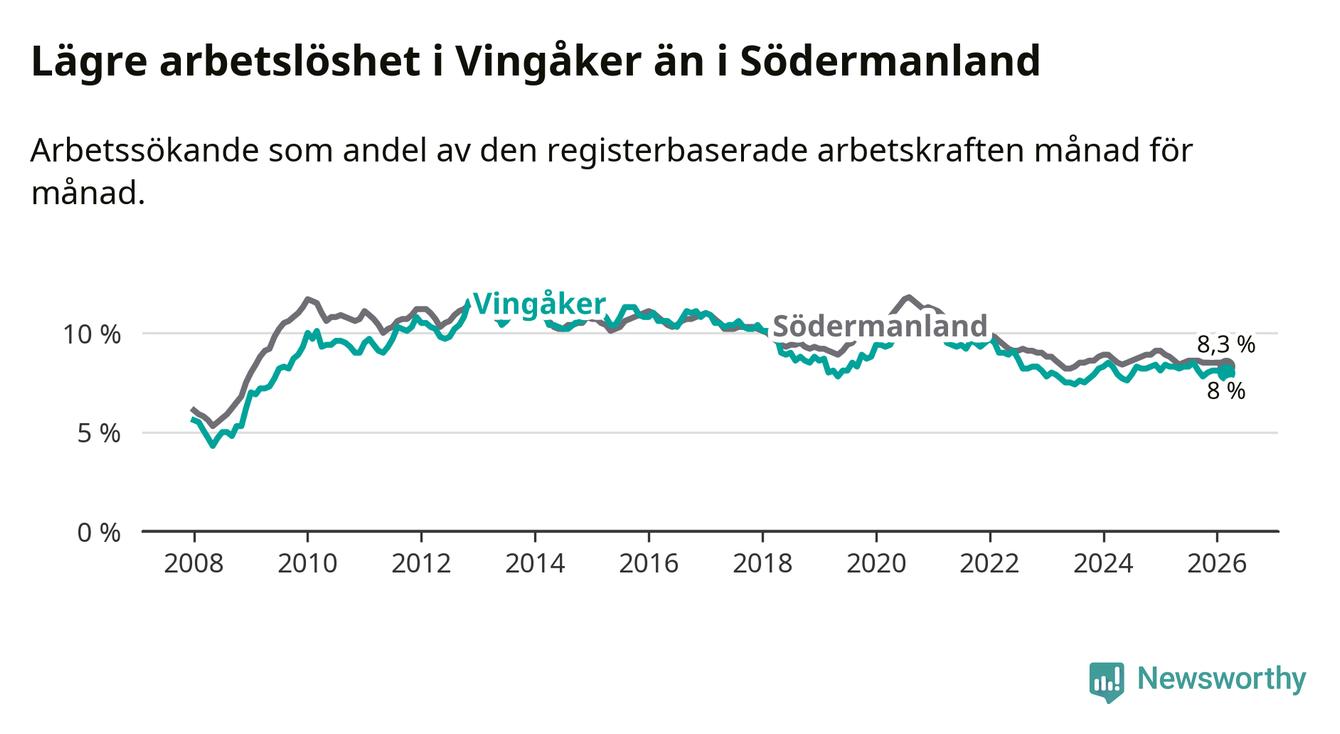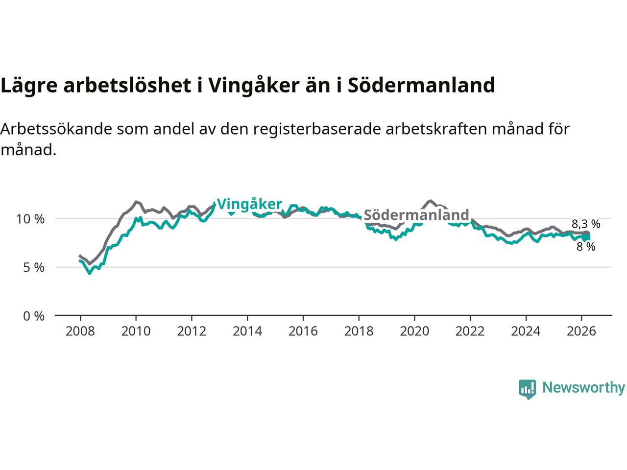 Under mars månad rapporterade Vingåkers kommun en total arbetslöshet på 8,0 procent. Det är en minskning jämfört med samma tidpunkt i fjol (−0,3 procentenheter). Även i Södermanlands län sjunker arbetslösheten .