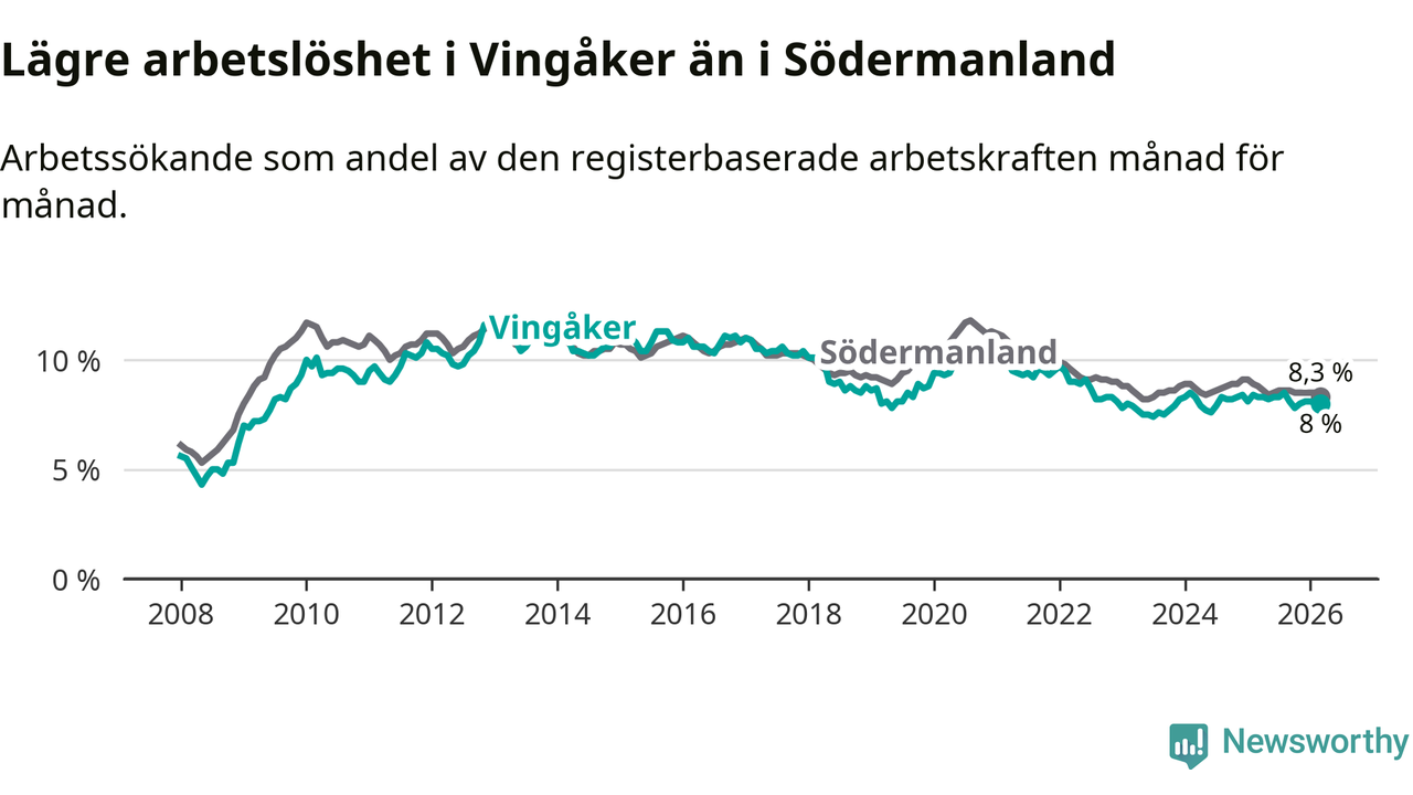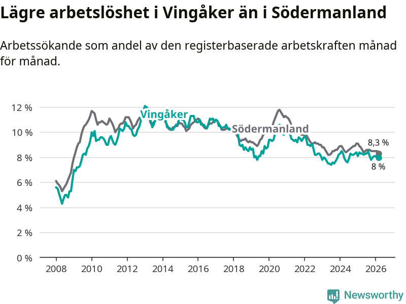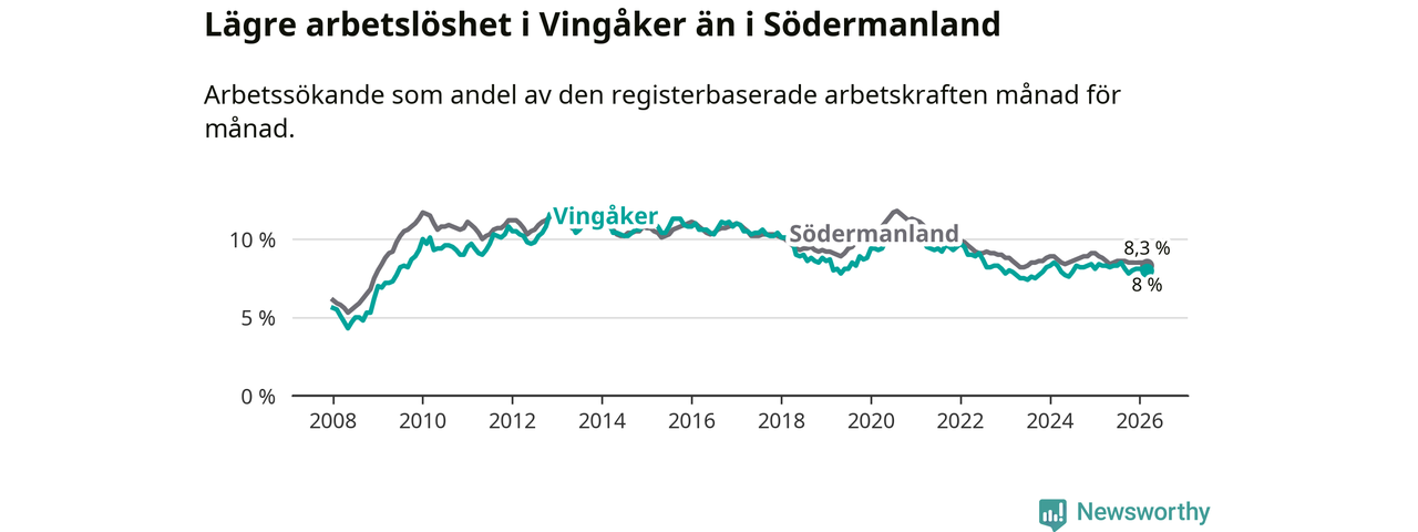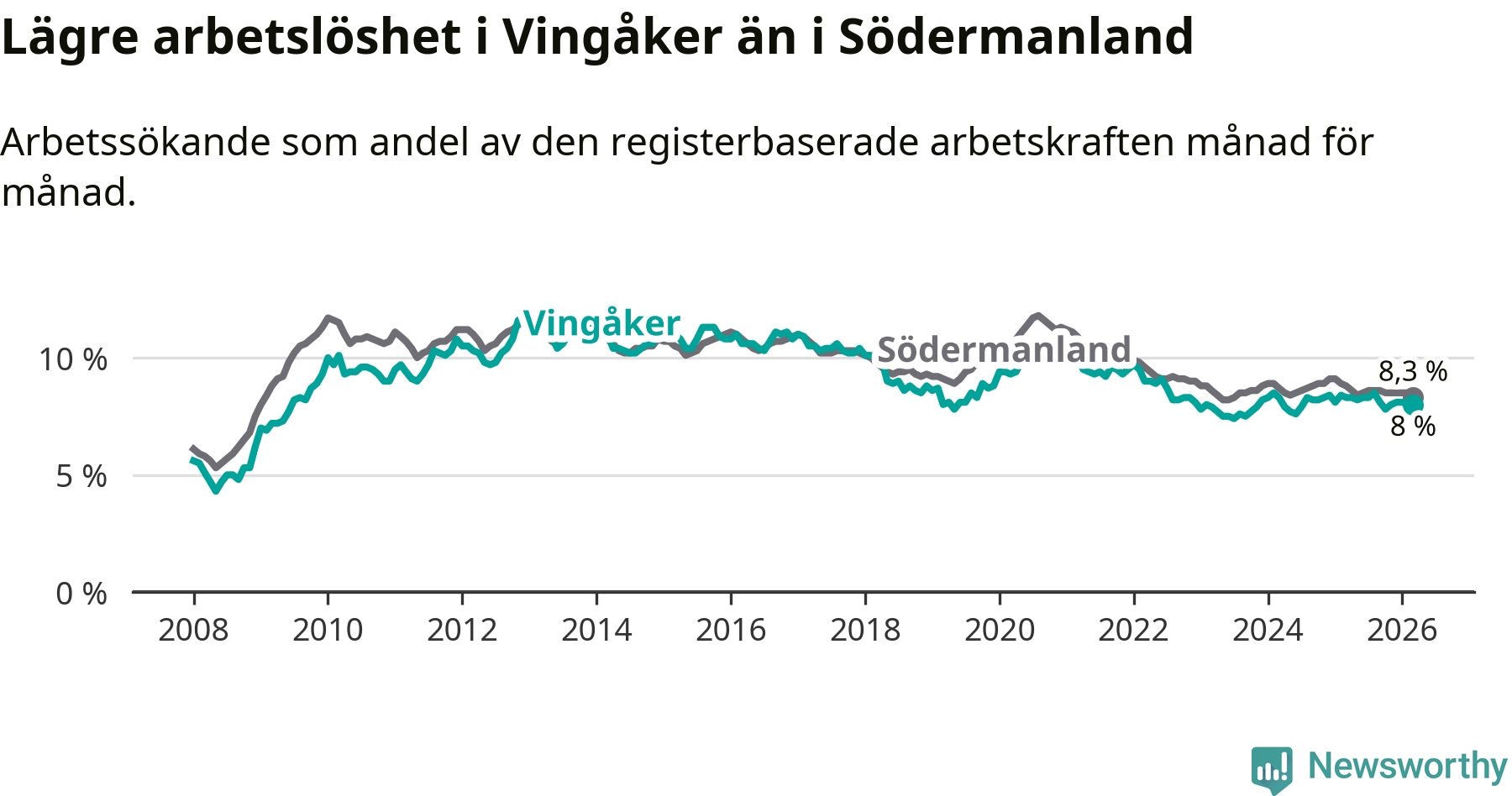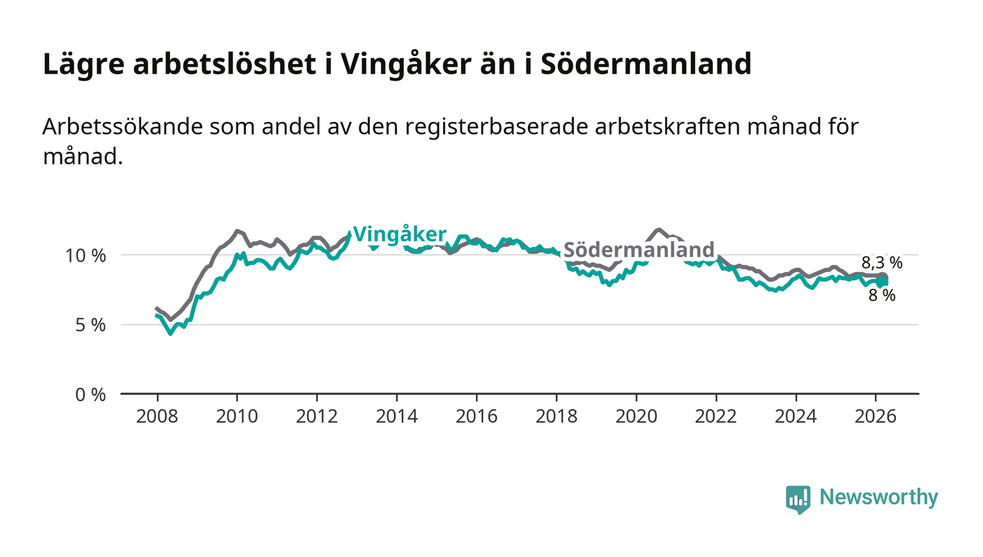 Under mars månad rapporterade Vingåkers kommun en total arbetslöshet på 8,0 procent. Det är en minskning jämfört med samma tidpunkt i fjol (−0,3 procentenheter). Även i Södermanlands län sjunker arbetslösheten .
