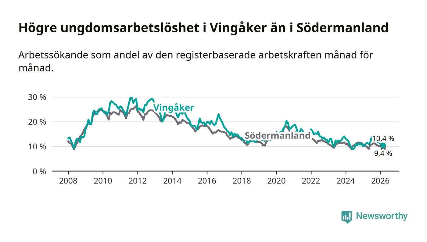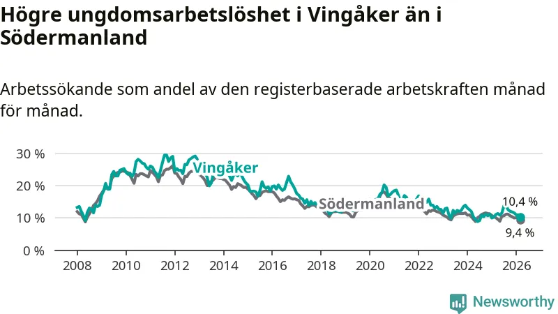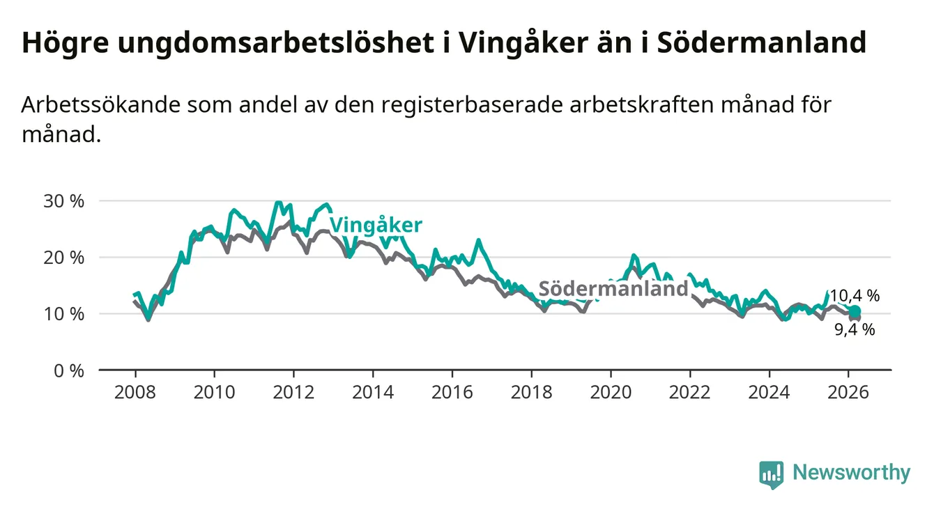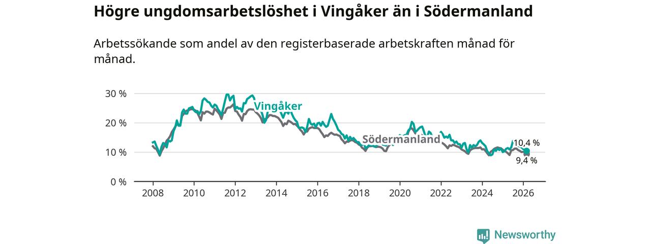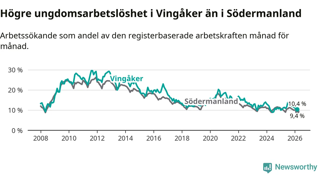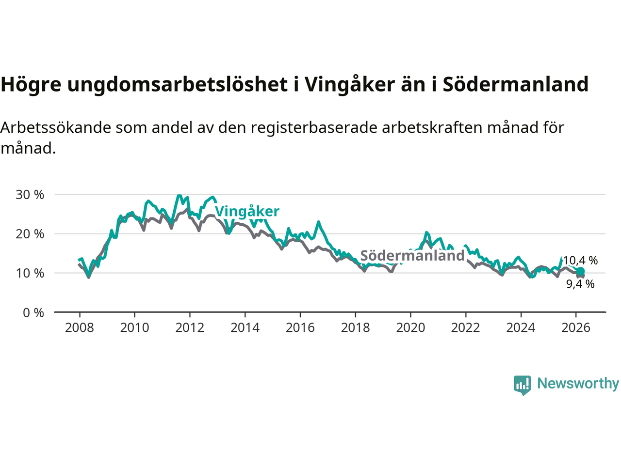 Medan Vingåker har lägre total arbetslöshet än Södermanland, ligger ungdomsarbetslösheten 1,0 procentenheter högre i Vingåker.