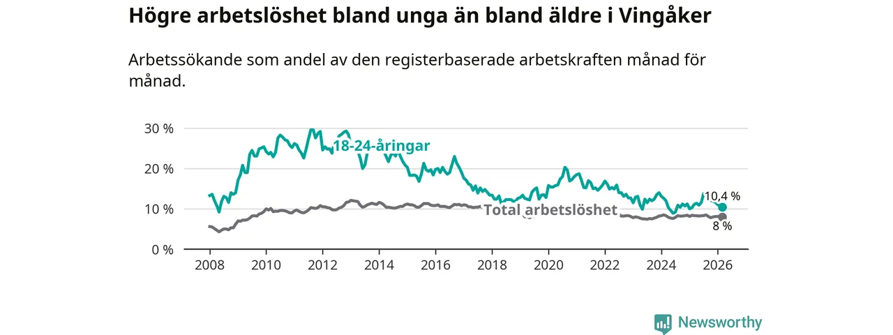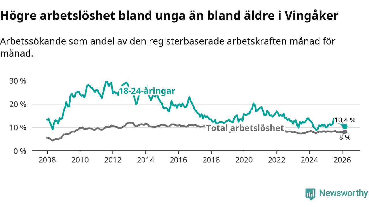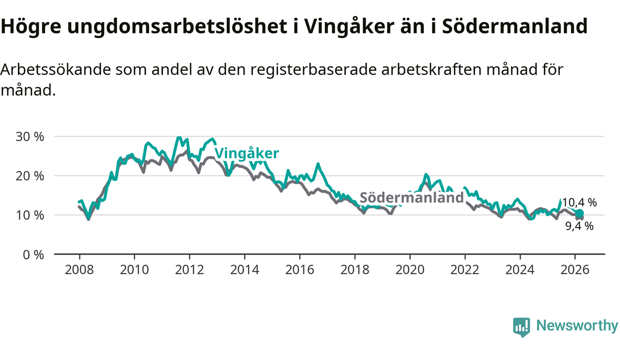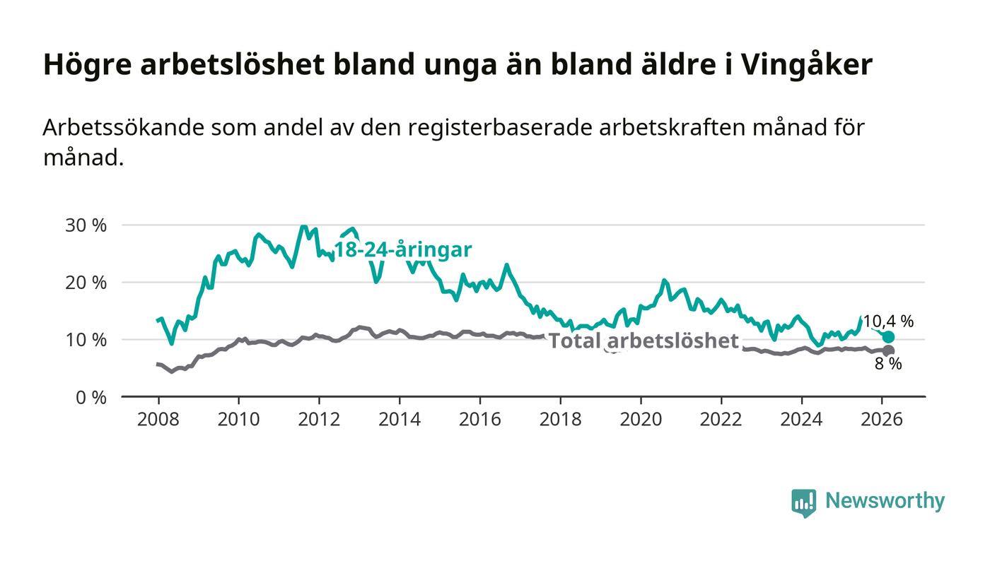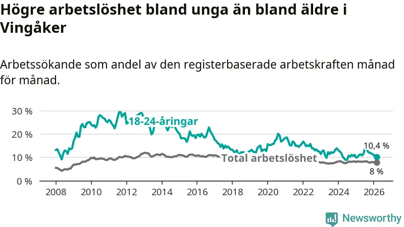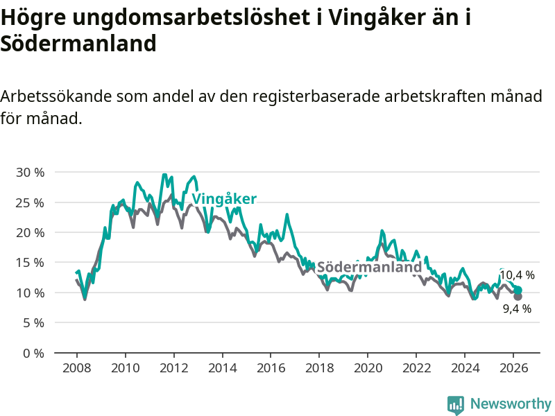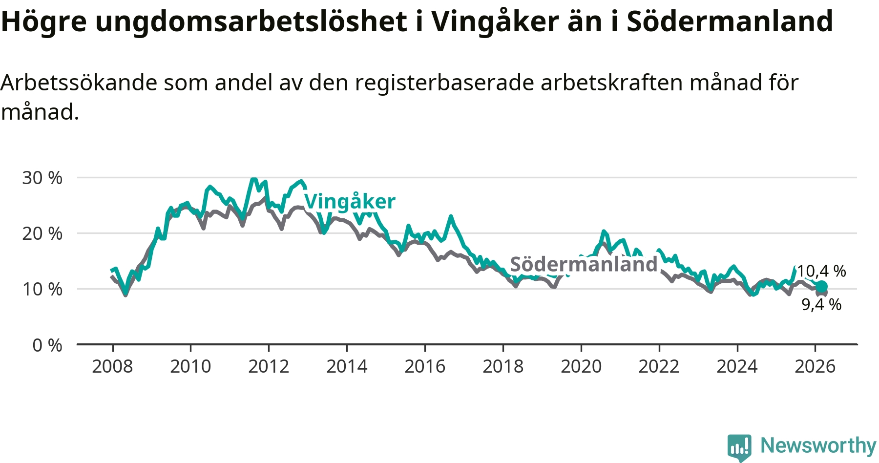 Medan Vingåker har lägre total arbetslöshet än Södermanland, ligger ungdomsarbetslösheten 1,0 procentenheter högre i Vingåker.
