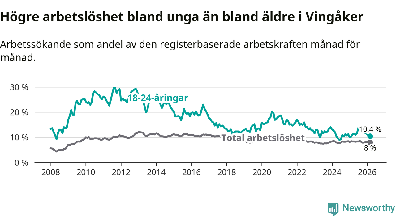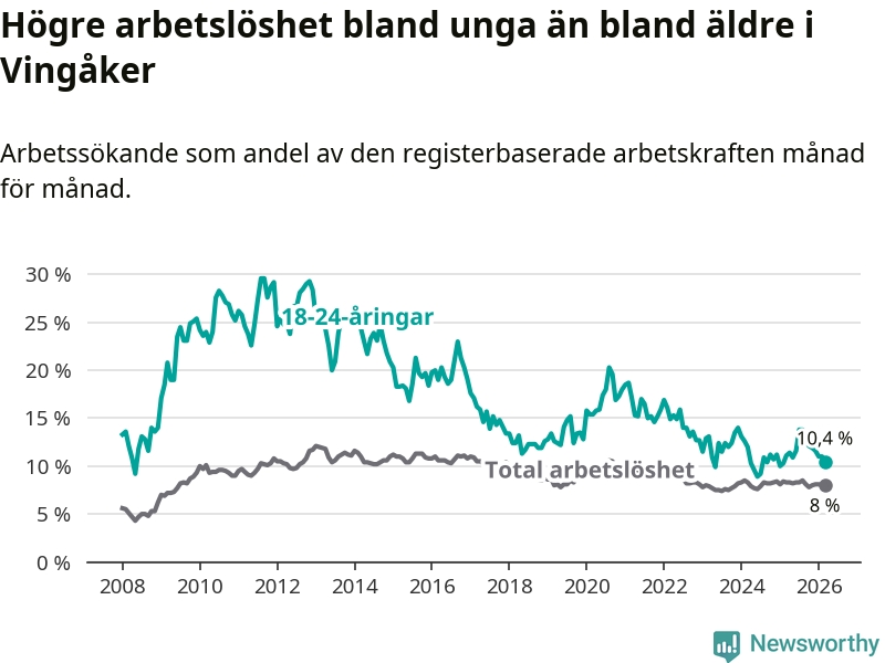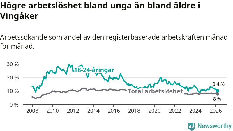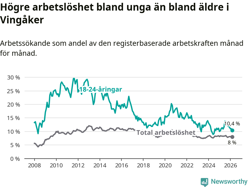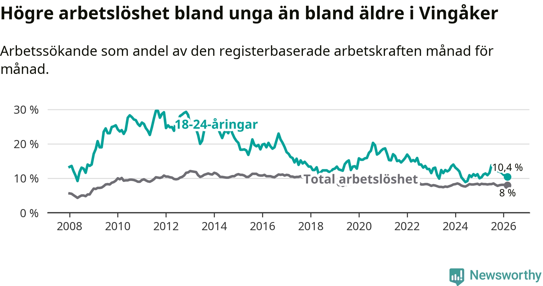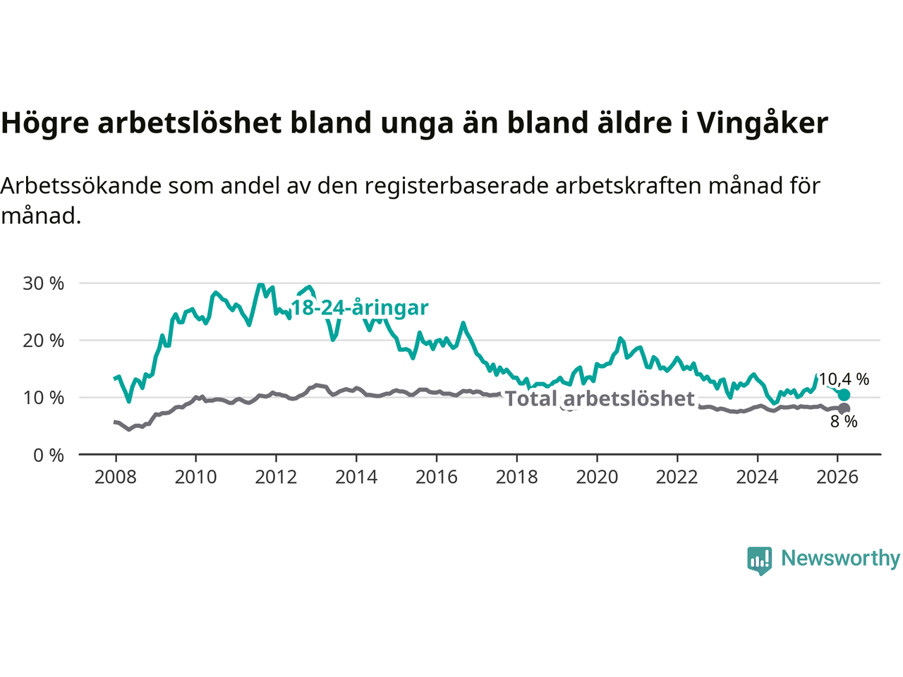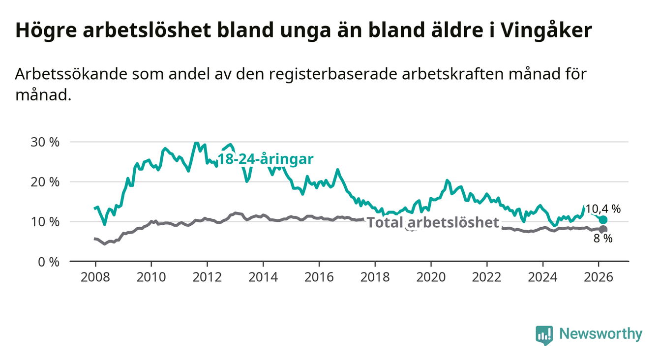 Medan Vingåker har lägre total arbetslöshet än Södermanland, ligger ungdomsarbetslösheten 1,0 procentenheter högre i Vingåker.