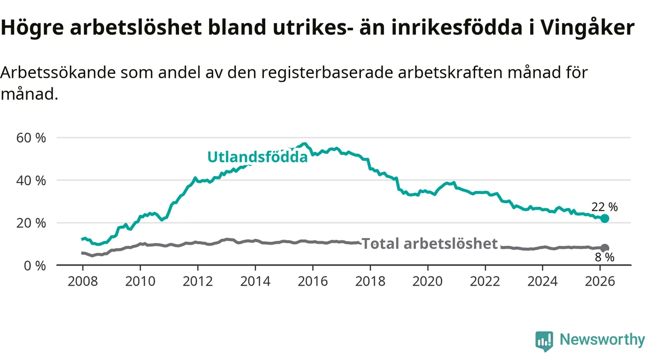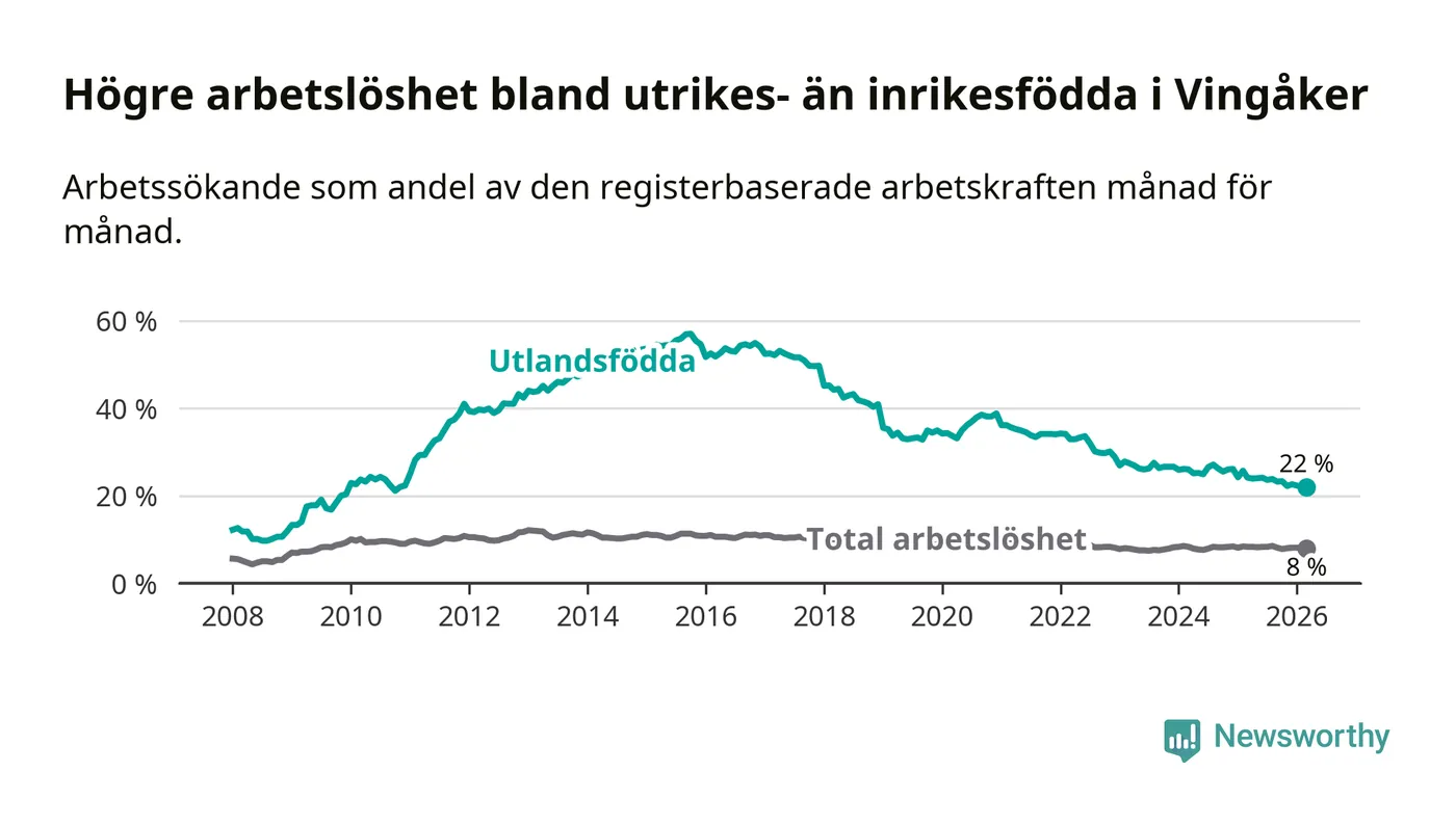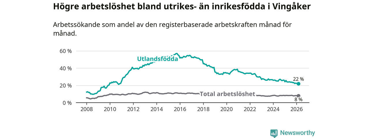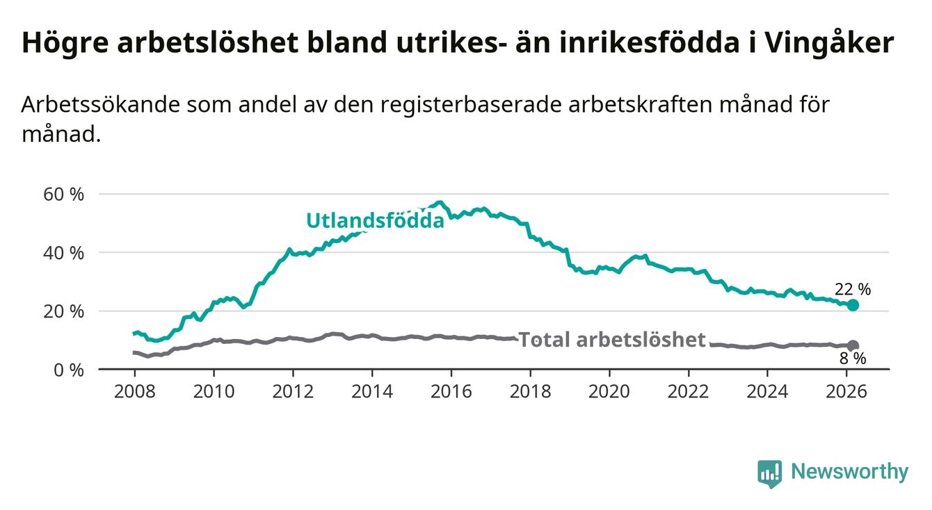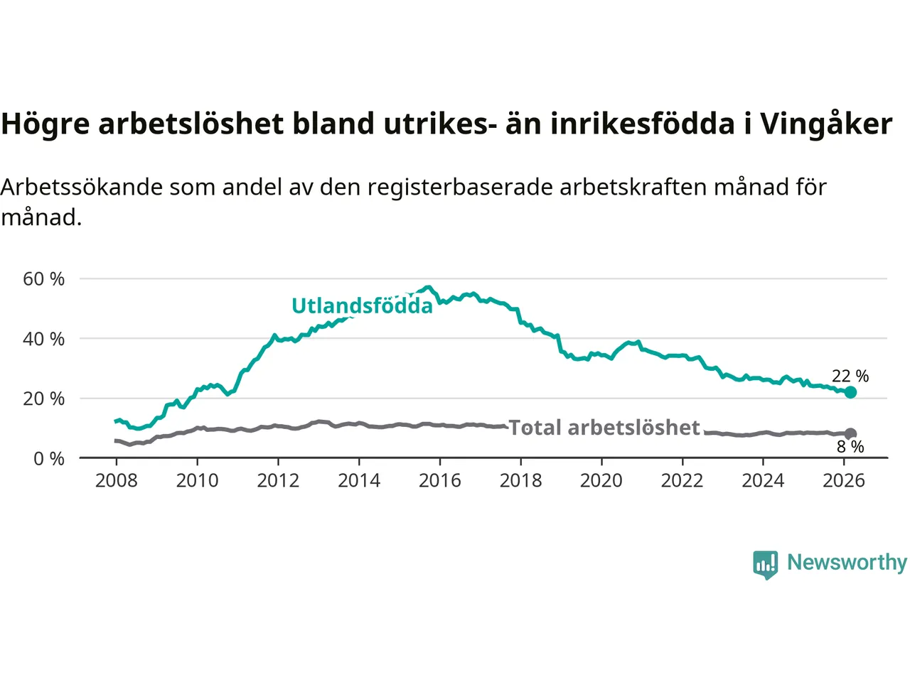 Arbetslösheten bland utlandsfödda var 22,0 procent i Vingåker under mars månad, motsvarande 133 av 605 personer. Det är 2,1 procentenheter färre än vid samma tidpunkt i fjol (−15 om man räknar personer). Därmed är de utlandsföddas arbetslöshet lägre än vid samma tidpunkt i fjol för 20:e månaden i följd. Sedan juli 2024 har arbetslösheten bland utlandsfödda minskat från 26,5 till 22,0 procent.
