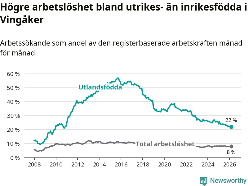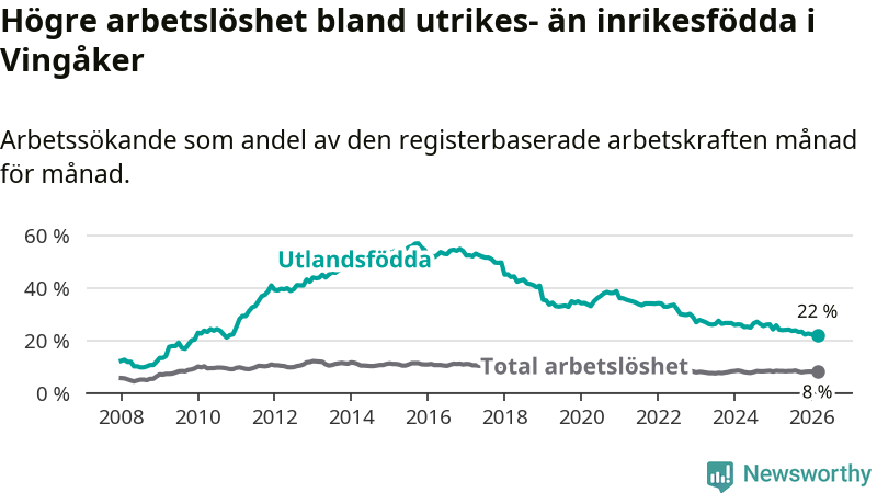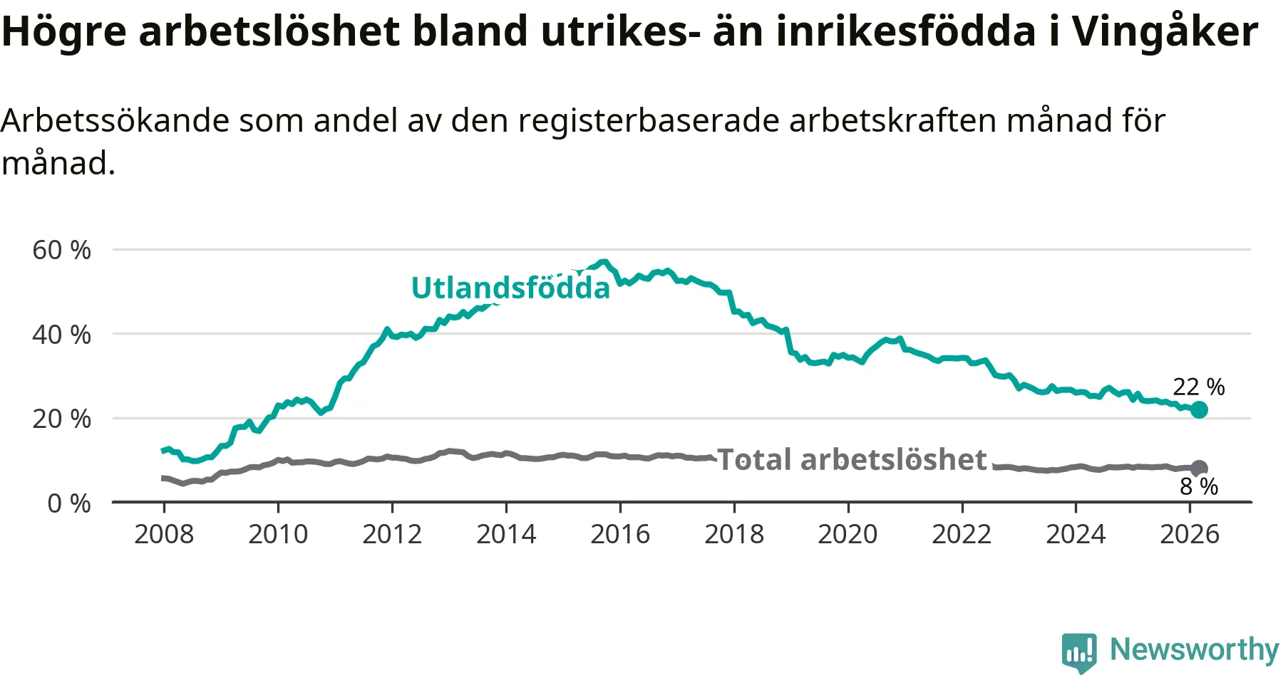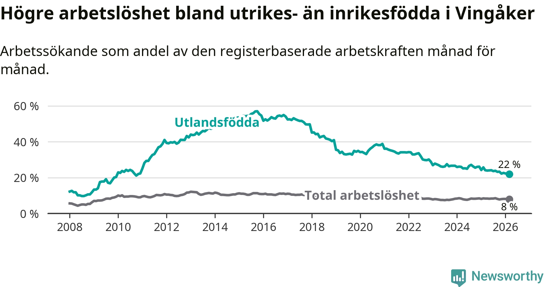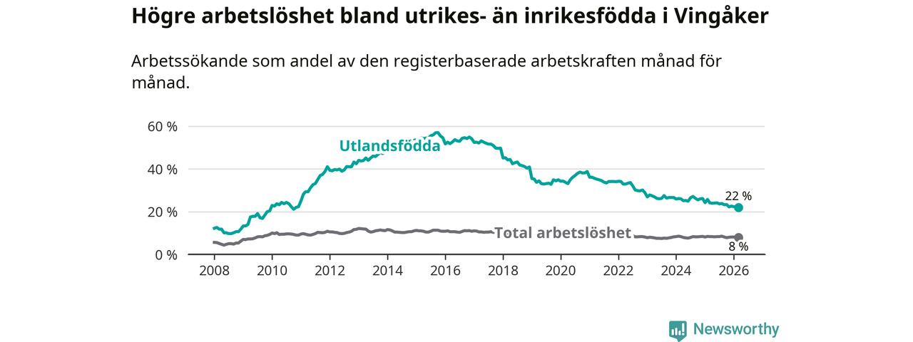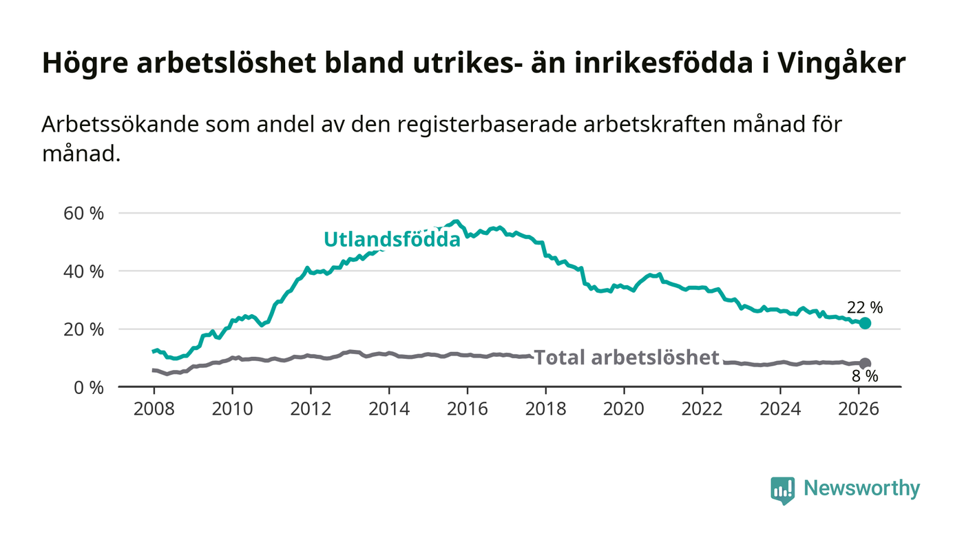 Arbetslösheten bland utlandsfödda var 22,0 procent i Vingåker under mars månad, motsvarande 133 av 605 personer. Det är 2,1 procentenheter färre än vid samma tidpunkt i fjol (−15 om man räknar personer). Därmed är de utlandsföddas arbetslöshet lägre än vid samma tidpunkt i fjol för 20:e månaden i följd. Sedan juli 2024 har arbetslösheten bland utlandsfödda minskat från 26,5 till 22,0 procent.