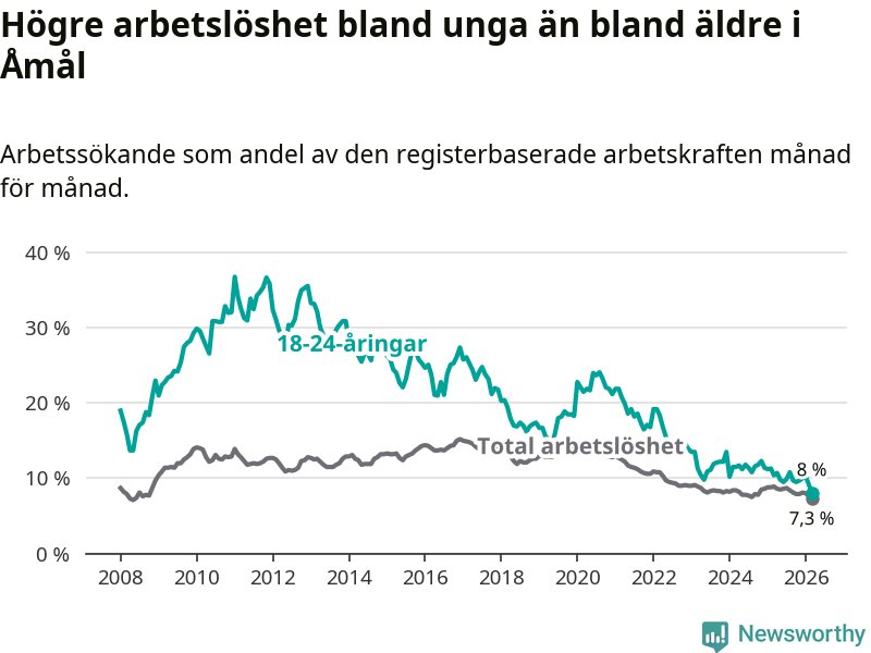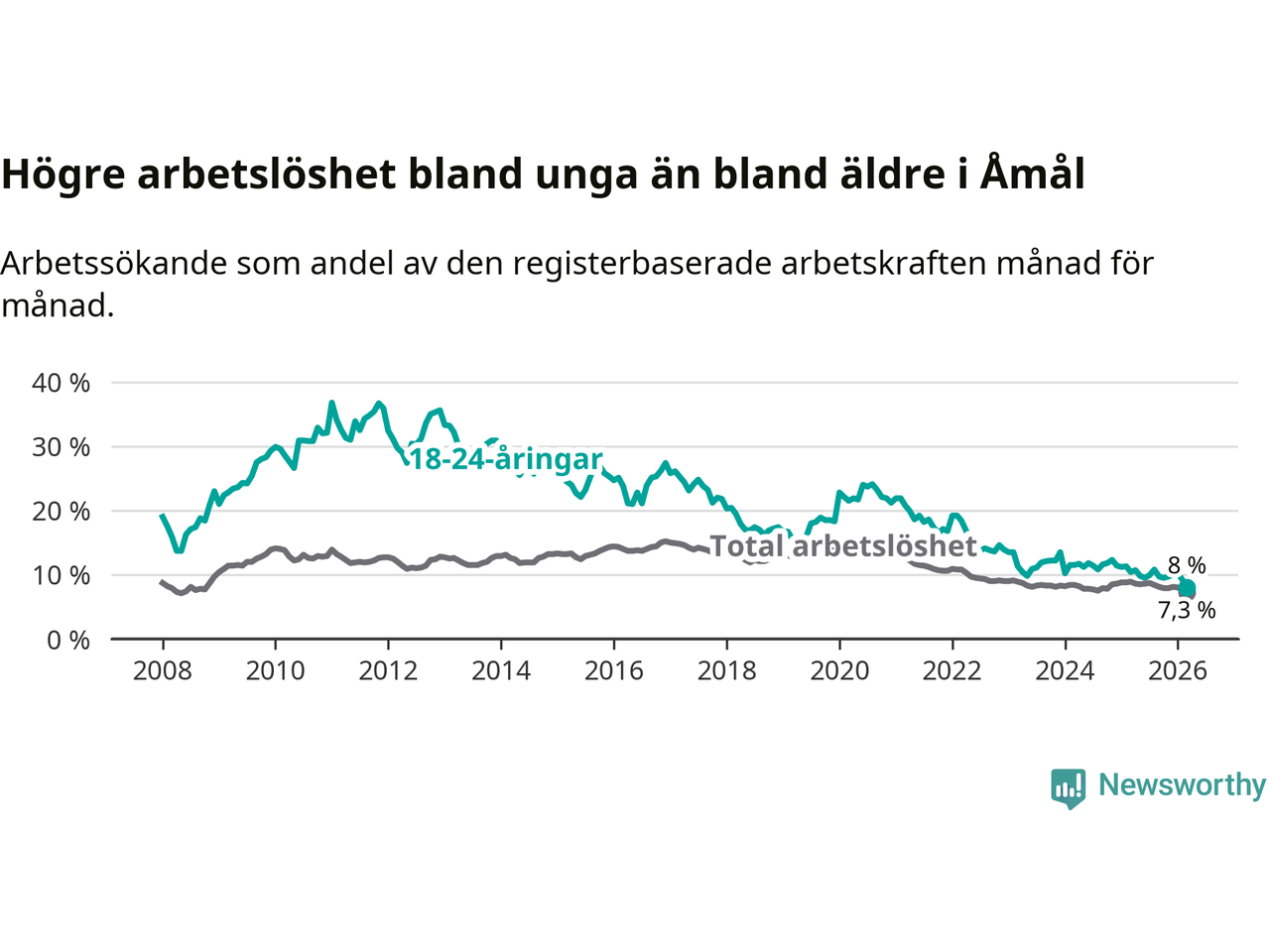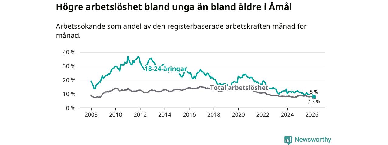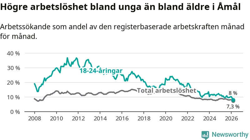 I och med den senaste månadens nedgång har de ungas arbetslöshet i Åmål sjunkit sju månader i följd (ner från 10,8 procent i augusti 2025 till 8,0 procent nu). Den nuvarande arbetslöshetsnivån är den lägsta sedan januari 2008.