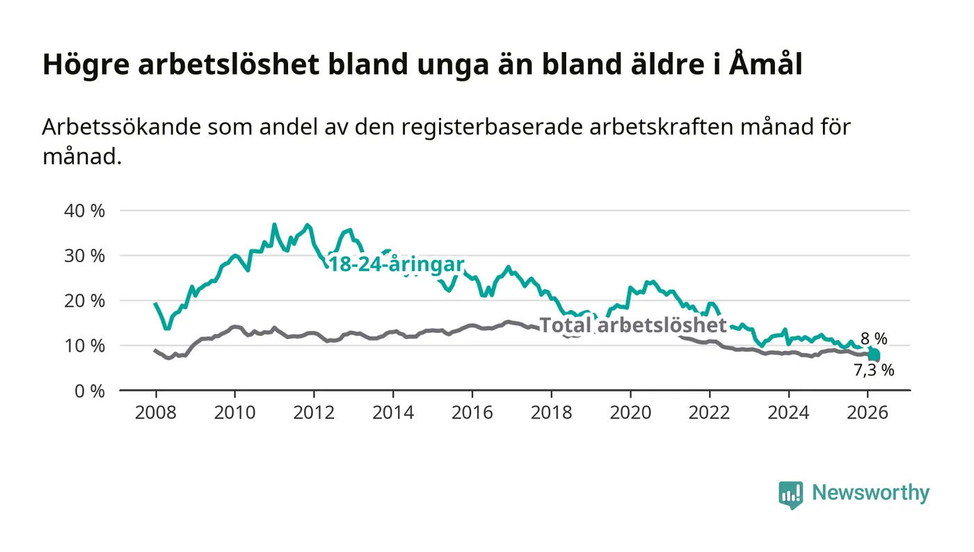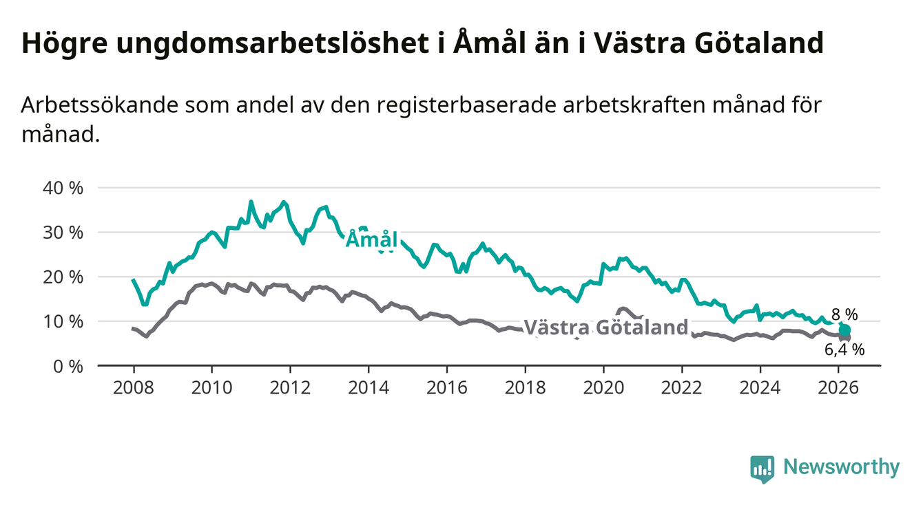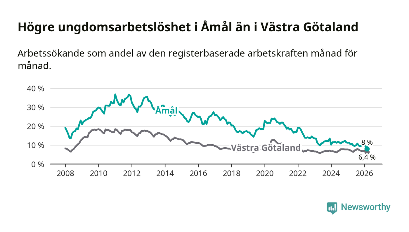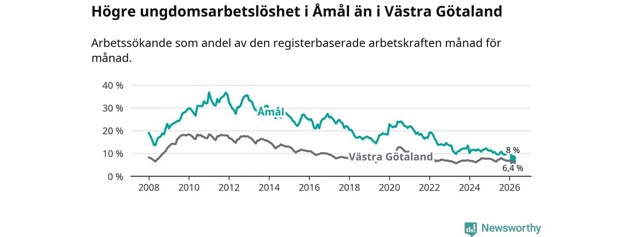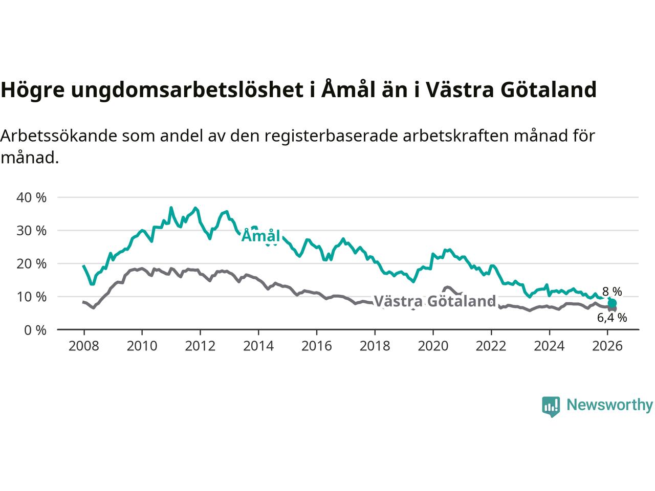 Precis som den totala arbetslösheten ligger ungdomsarbetslösheten i Åmål högre än i Västra Götaland som helhet. Skillnaden mellan kommunen och länet är 1,6 procentenheter.