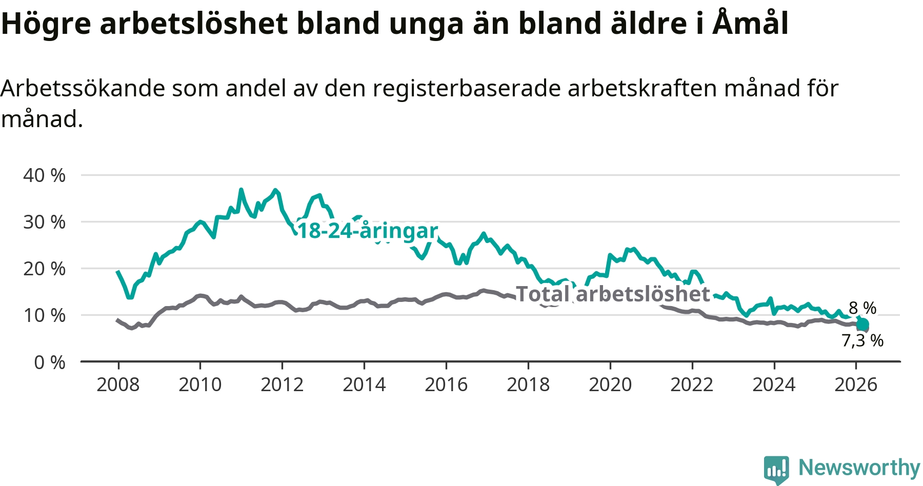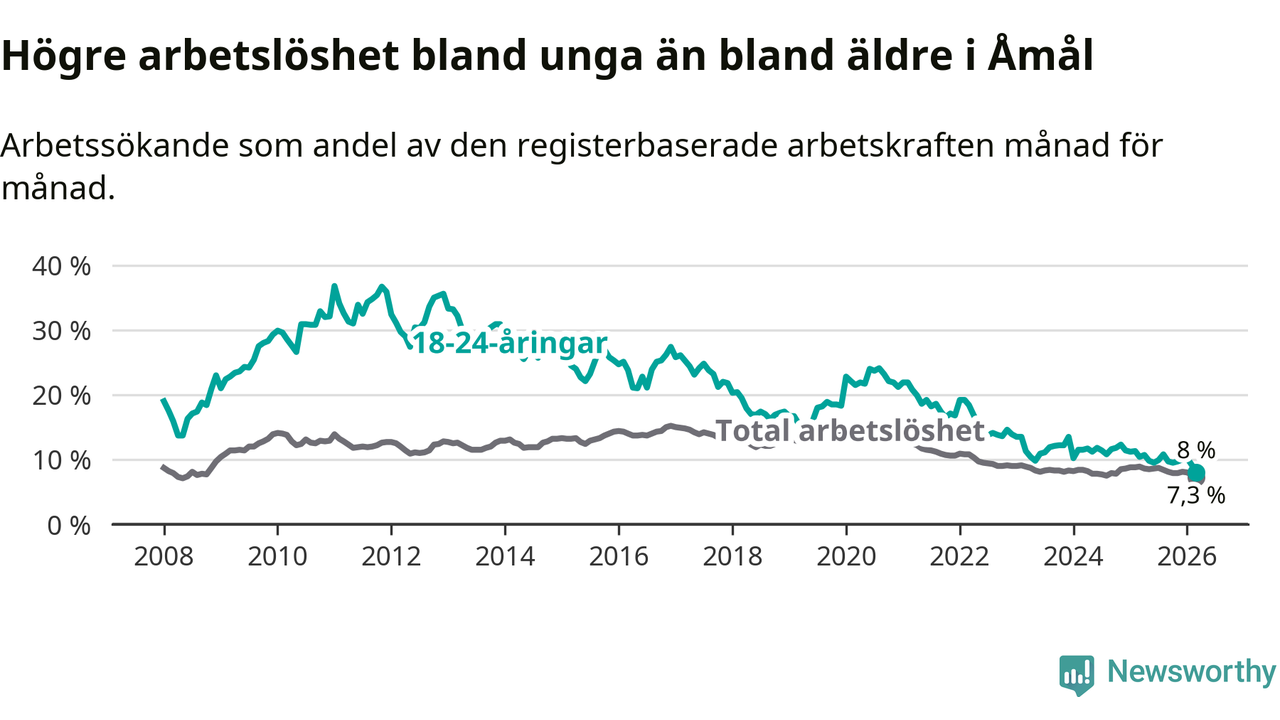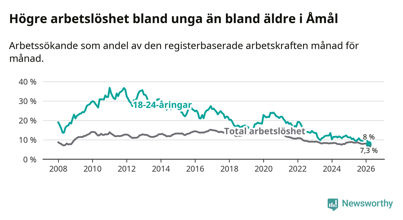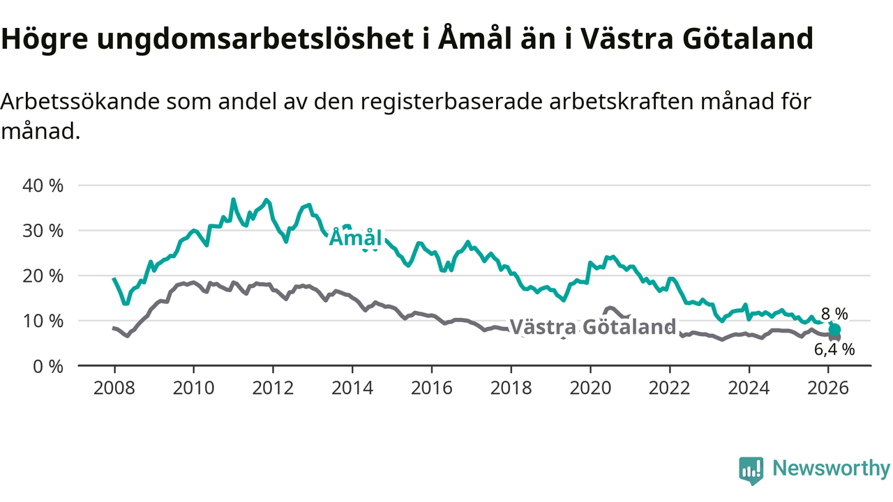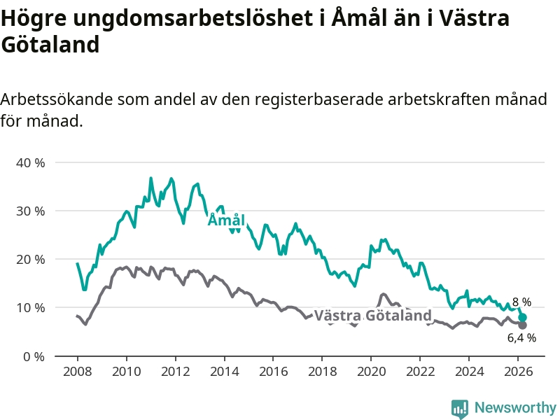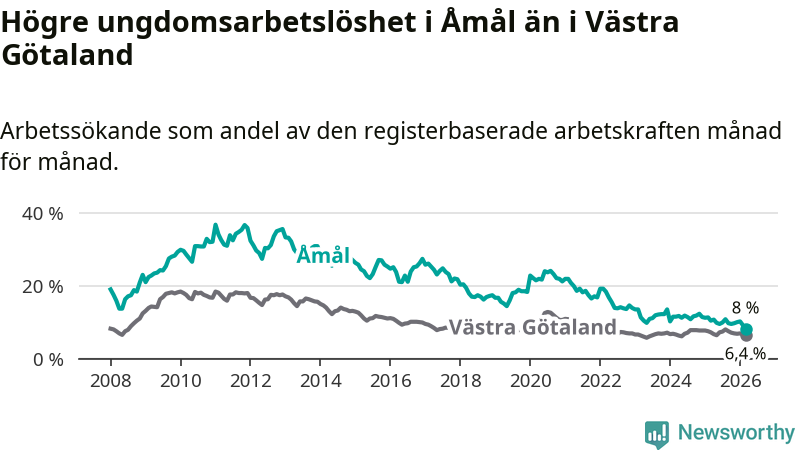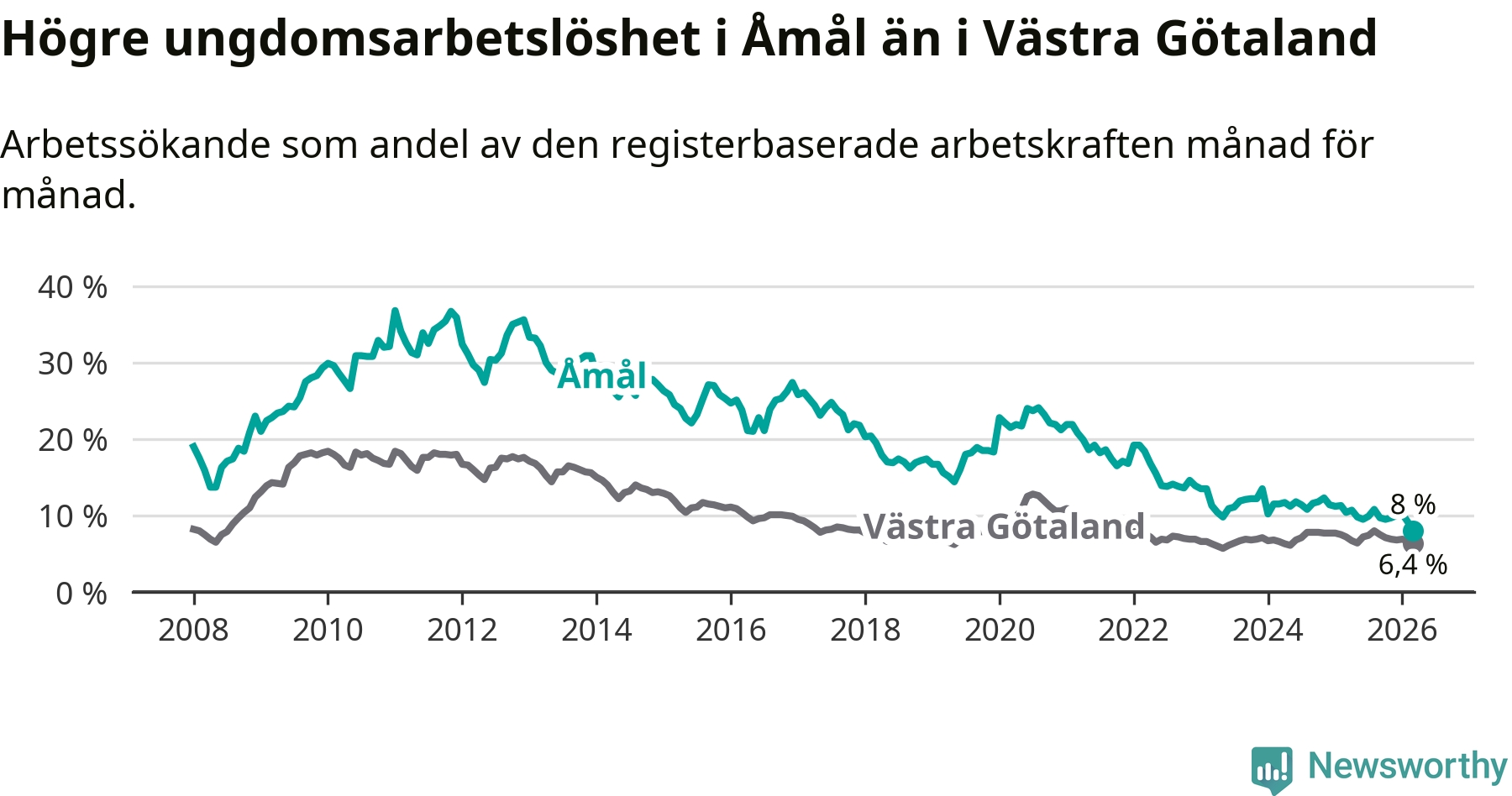 Precis som den totala arbetslösheten ligger ungdomsarbetslösheten i Åmål högre än i Västra Götaland som helhet. Skillnaden mellan kommunen och länet är 1,6 procentenheter.