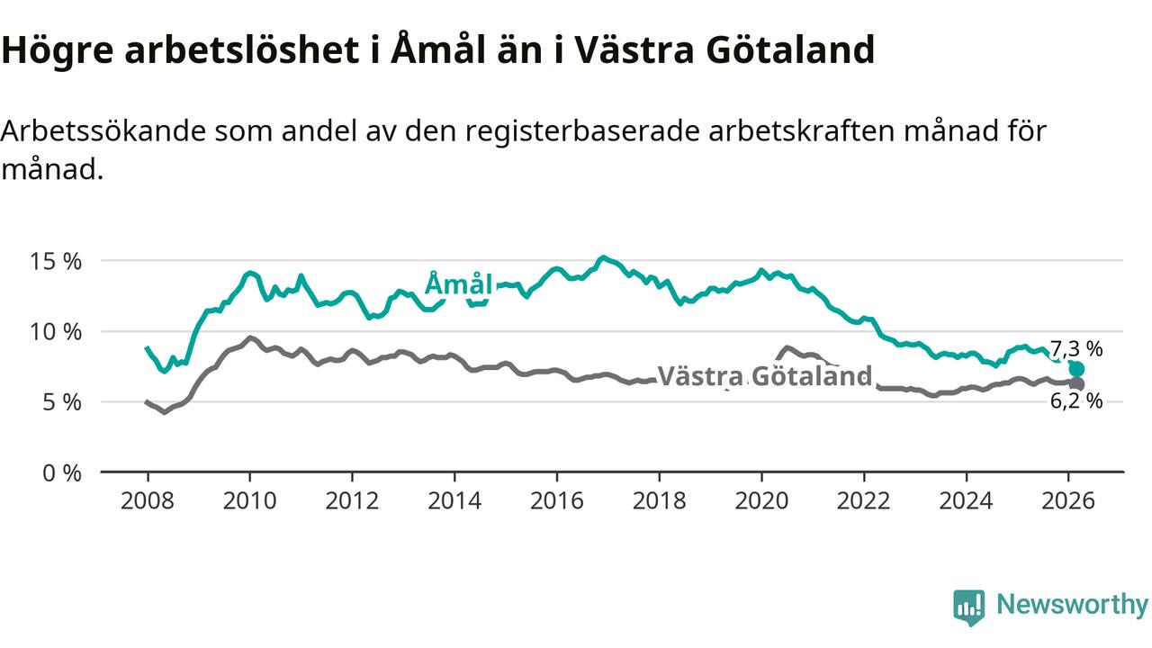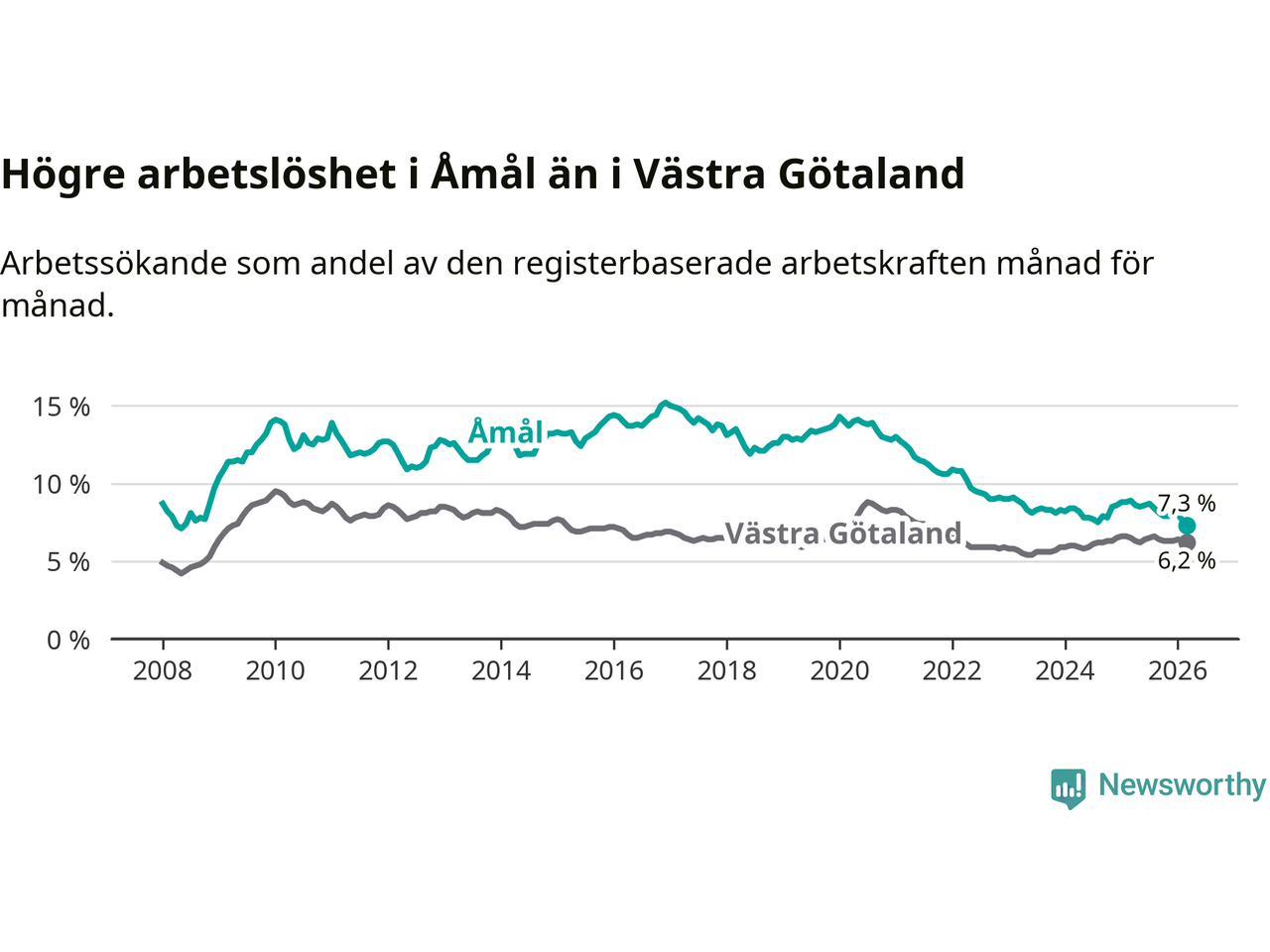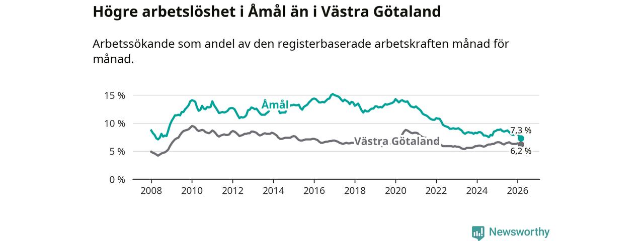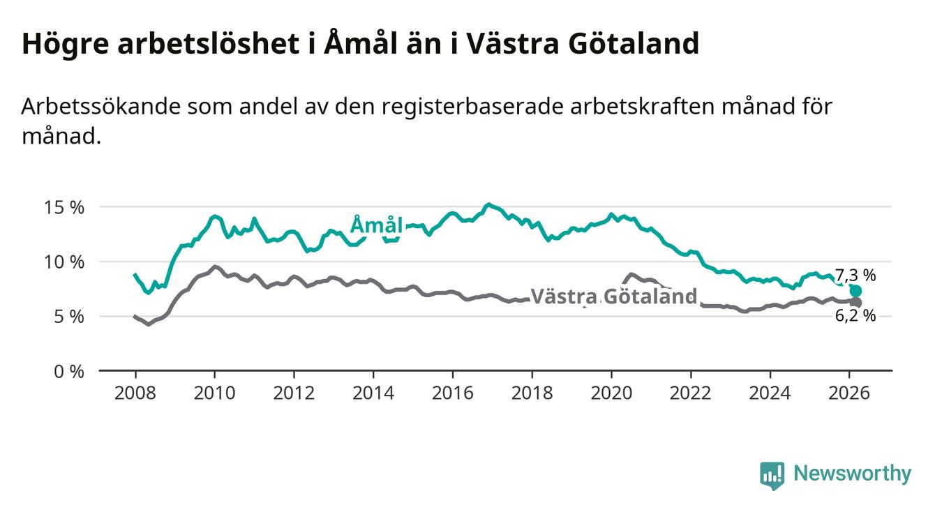Under mars månad rapporterade Åmåls kommun en total arbetslöshet på 7,3 procent. Det är en minskning jämfört med samma tidpunkt i fjol (−1,6 procentenheter). Även i Västra Götalands län sjunker arbetslösheten .