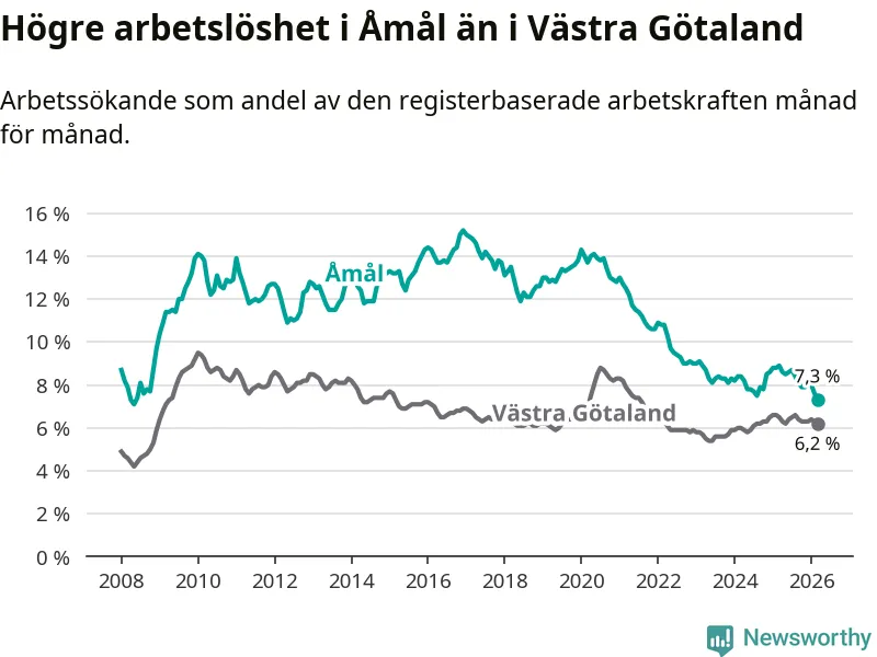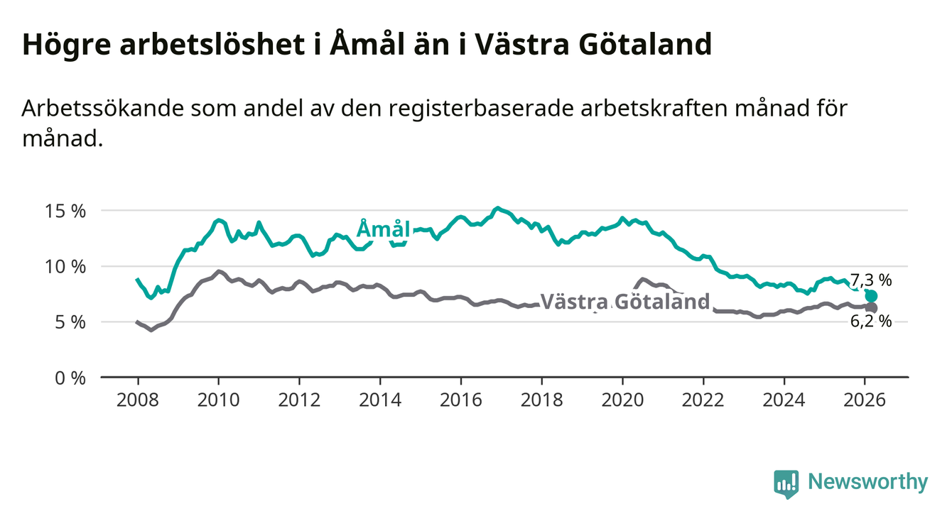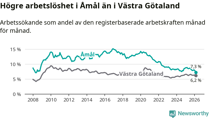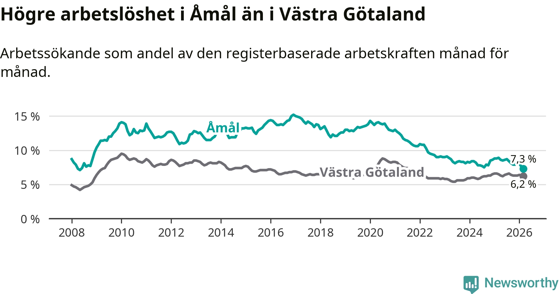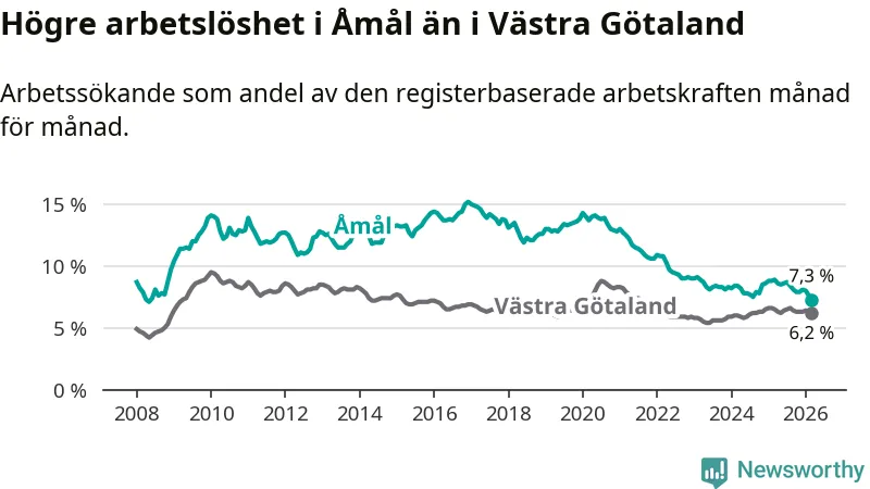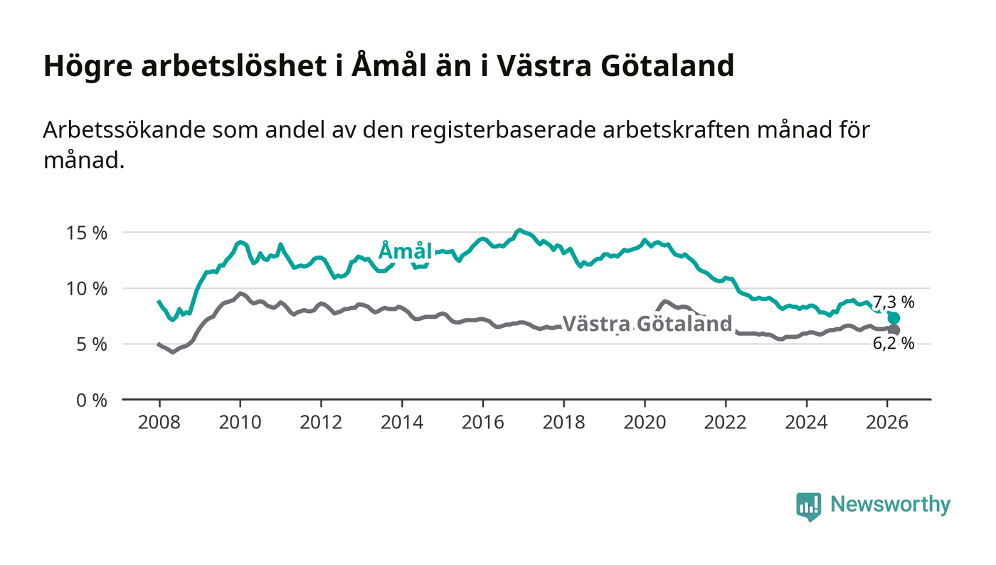 Under mars månad rapporterade Åmåls kommun en total arbetslöshet på 7,3 procent. Det är en minskning jämfört med samma tidpunkt i fjol (−1,6 procentenheter). Även i Västra Götalands län sjunker arbetslösheten .