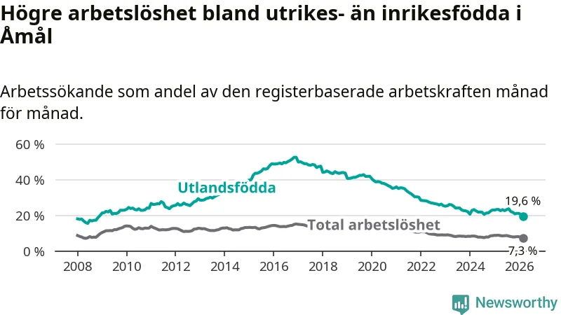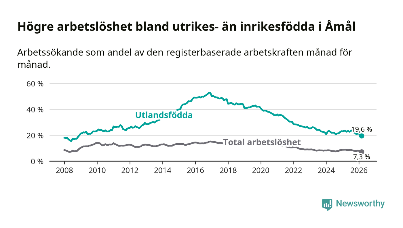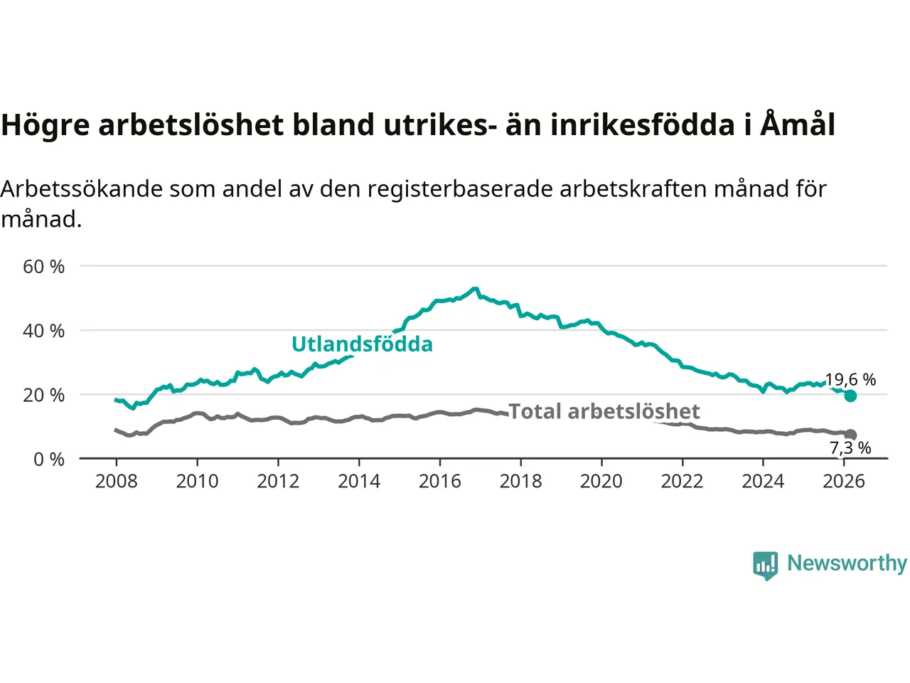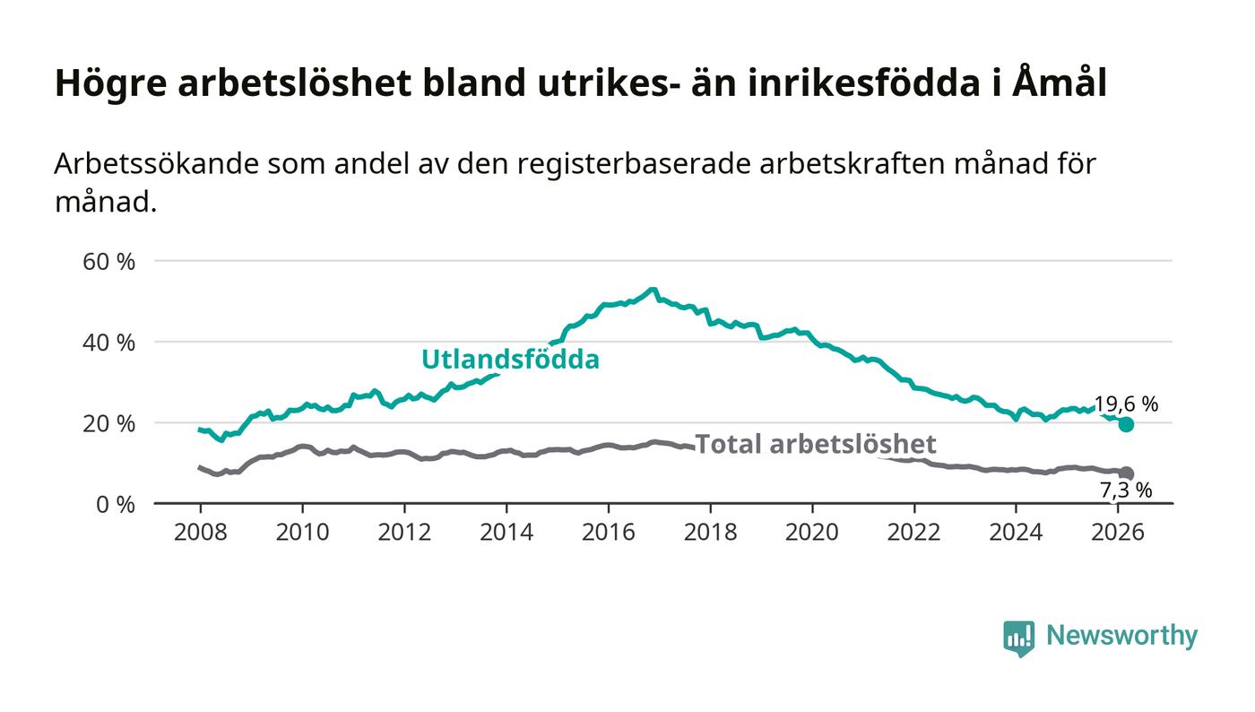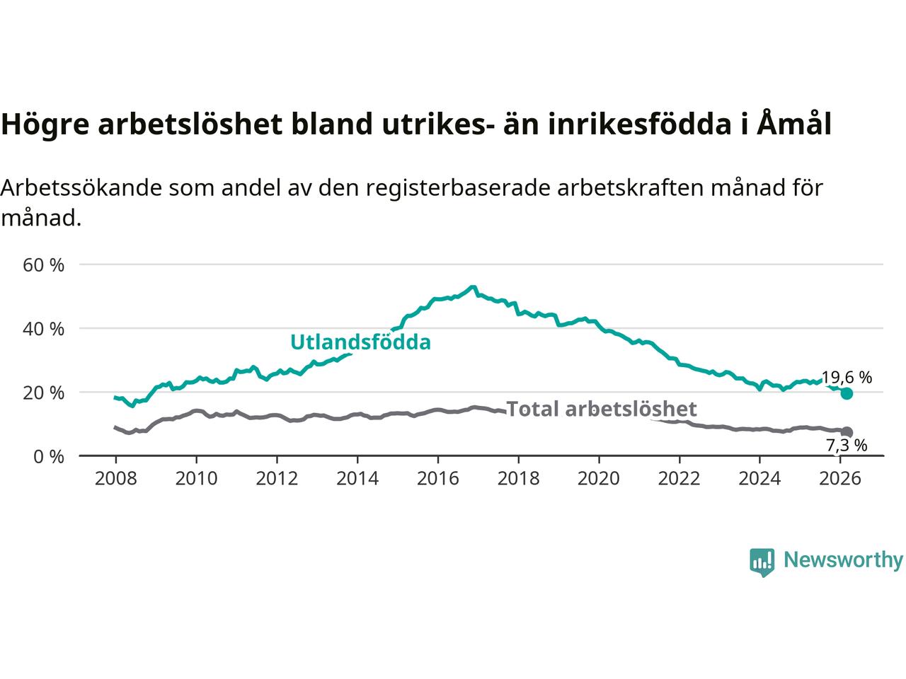 Skillnaden i arbetslöshet mellan utrikesfödda och hela befolkningen är 12,3 procentenheter i Åmål. Det är en betydligt mindre skillnad än för ett år sedan (−2,2 procentenheter).