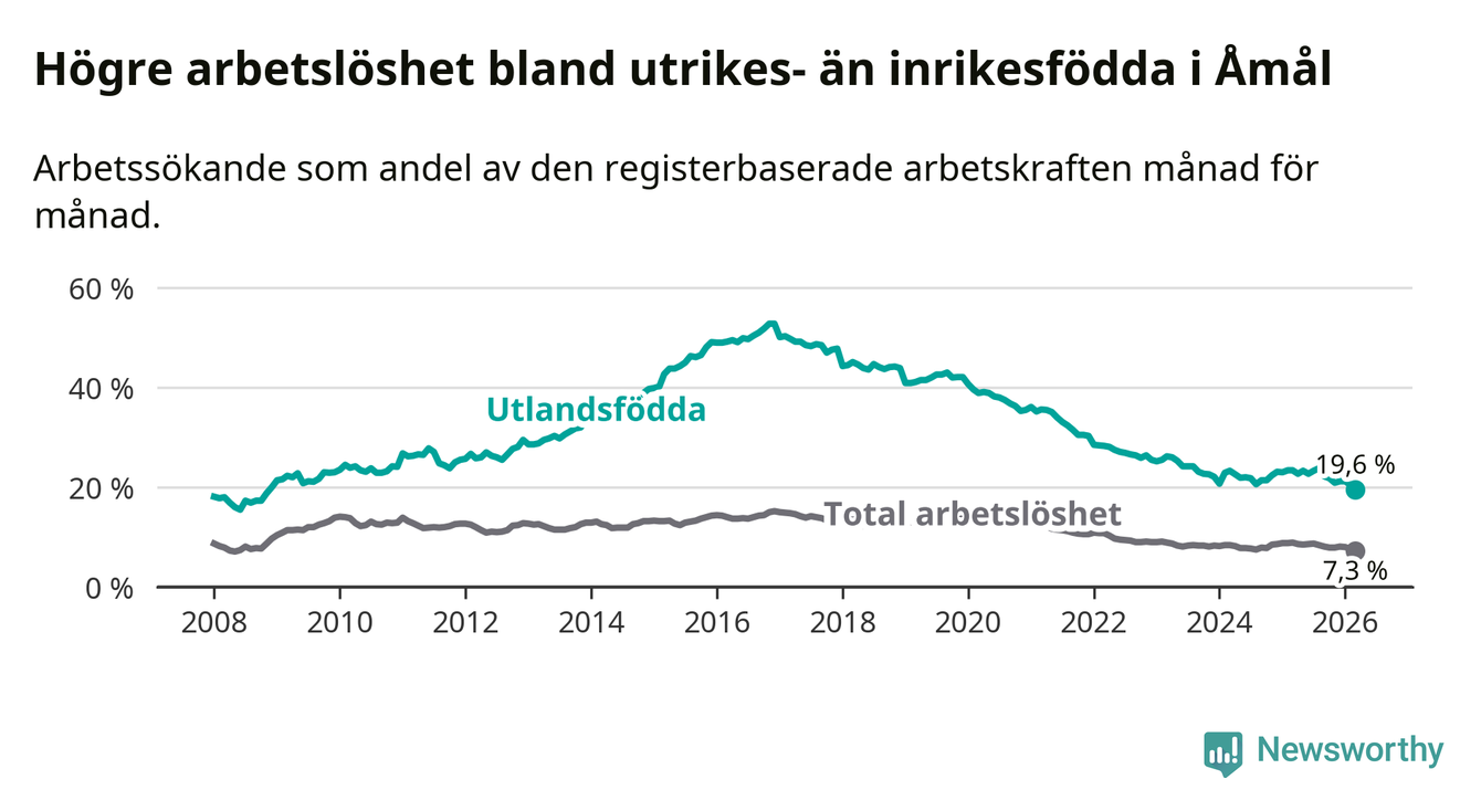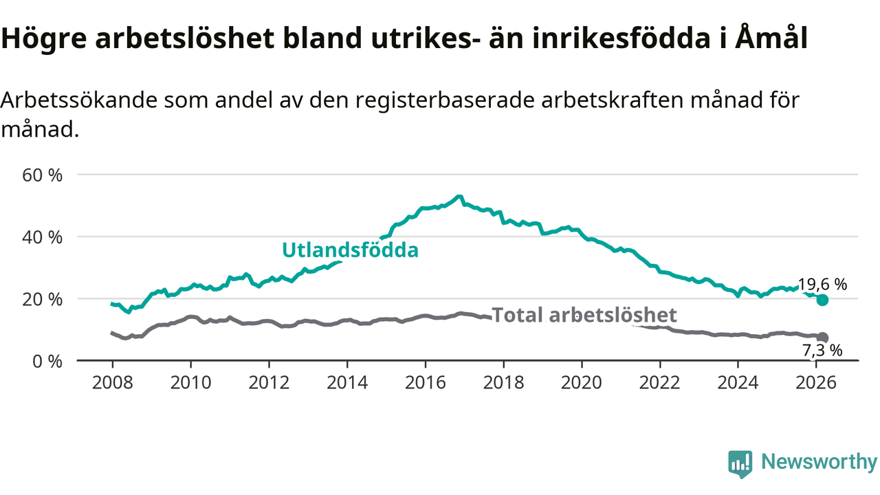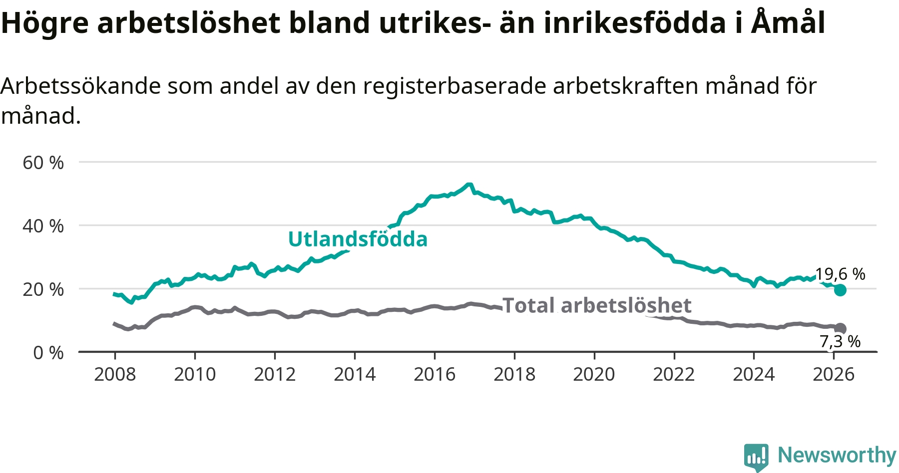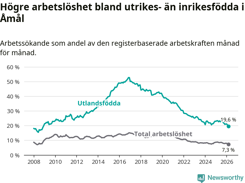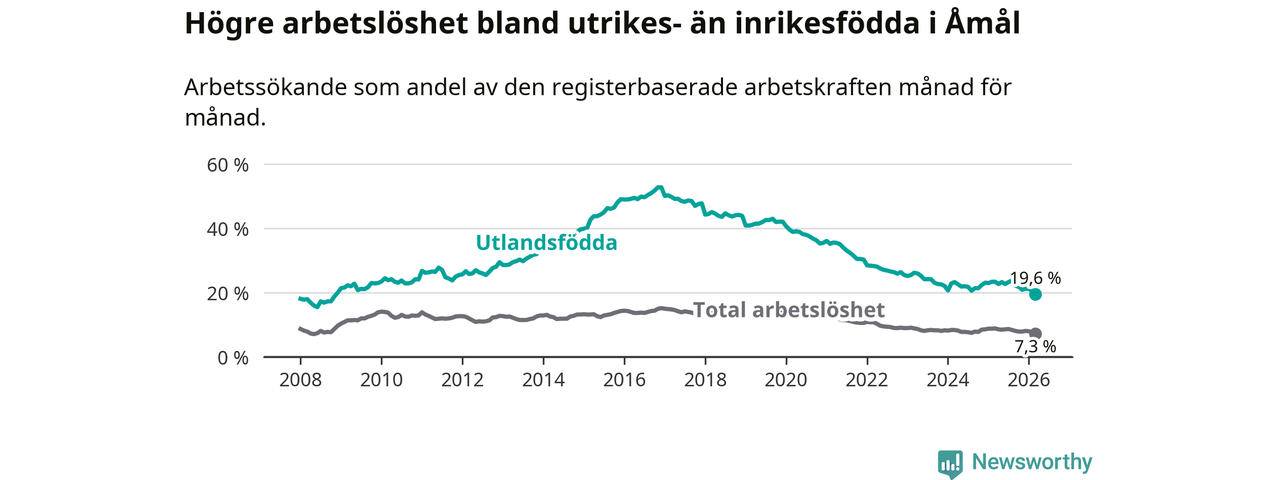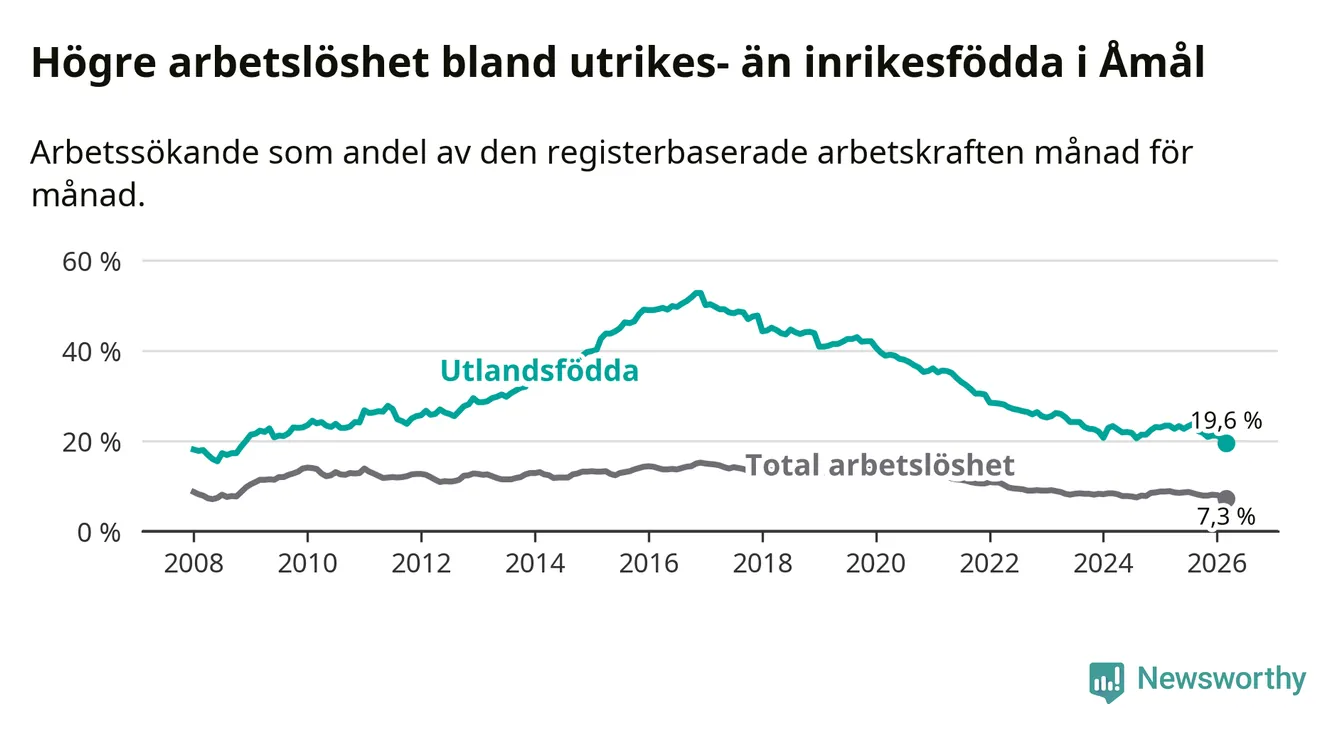 Skillnaden i arbetslöshet mellan utrikesfödda och hela befolkningen är 12,3 procentenheter i Åmål. Det är en betydligt mindre skillnad än för ett år sedan (−2,2 procentenheter).