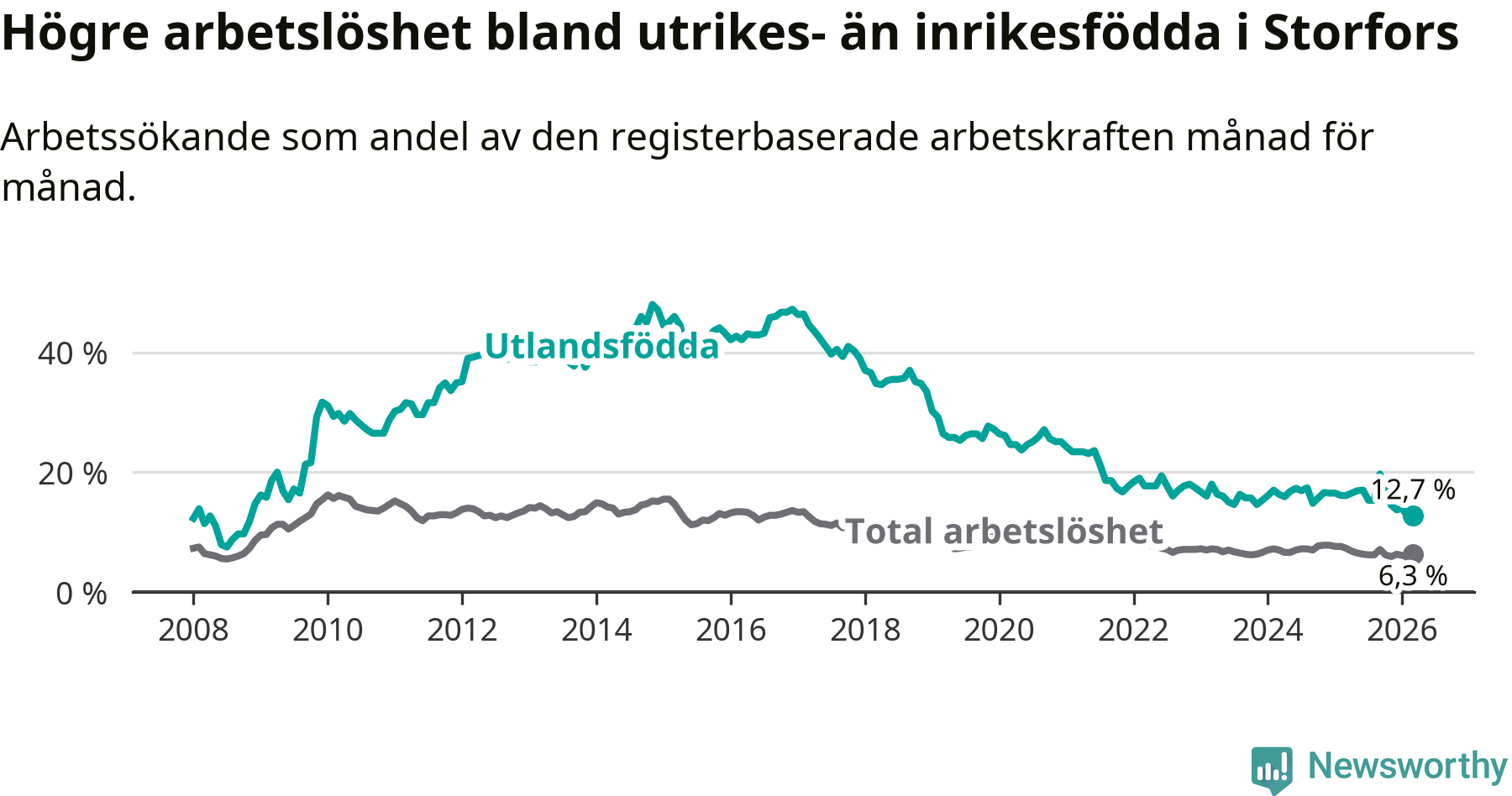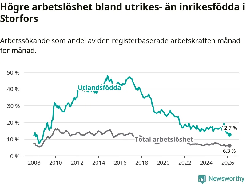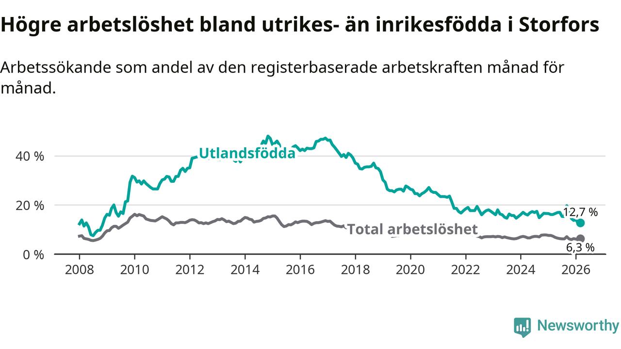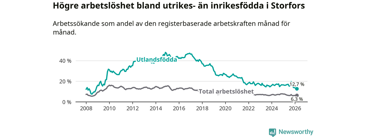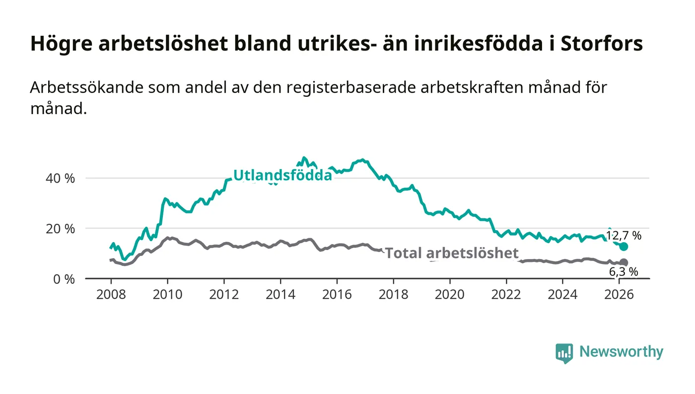 Skillnaden i arbetslöshet mellan utrikesfödda och hela befolkningen är 6,4 procentenheter i Storfors. Det är en betydligt mindre skillnad än för ett år sedan (−2,4 procentenheter).
