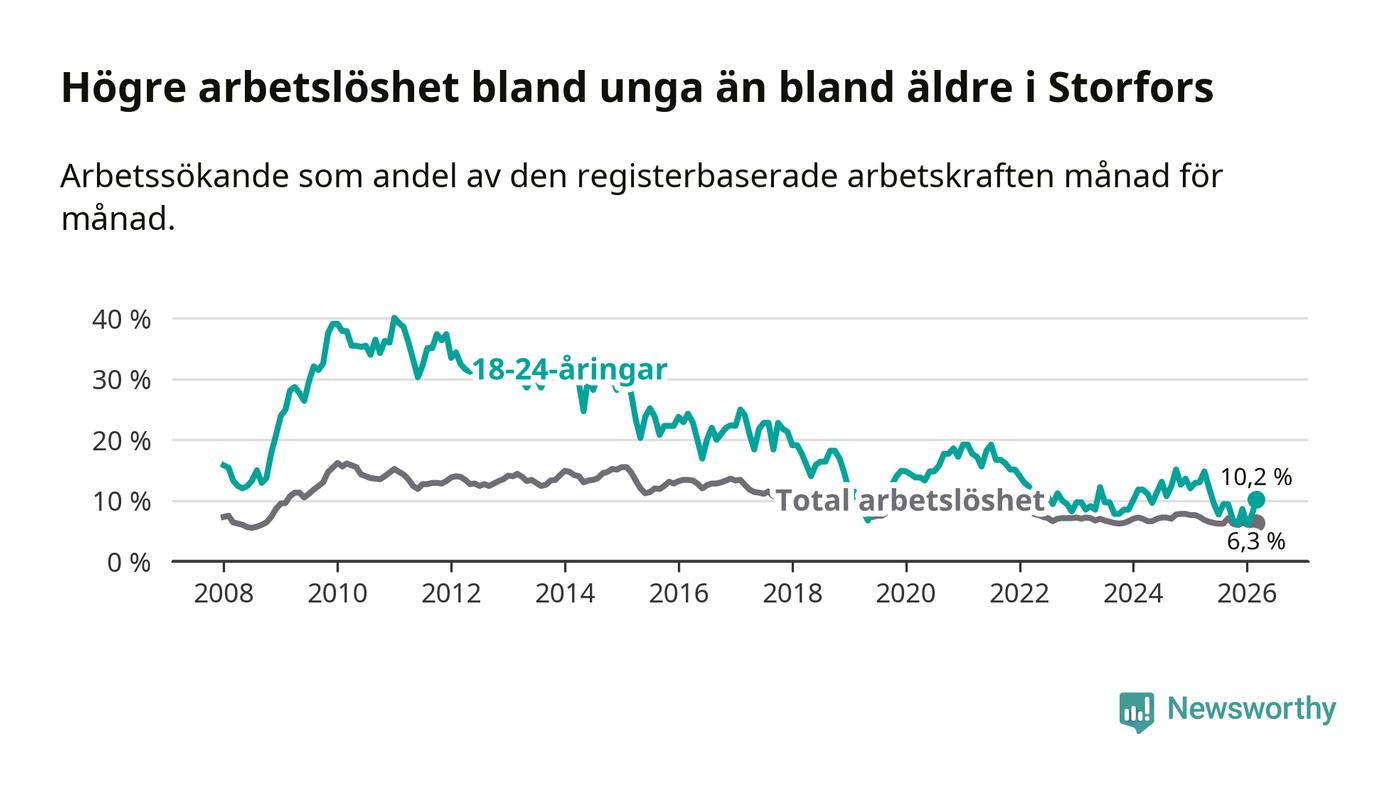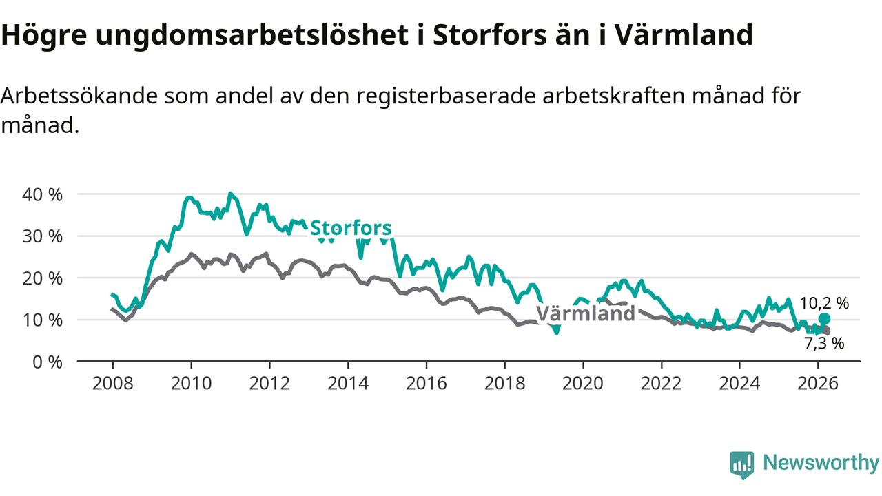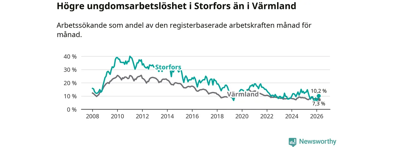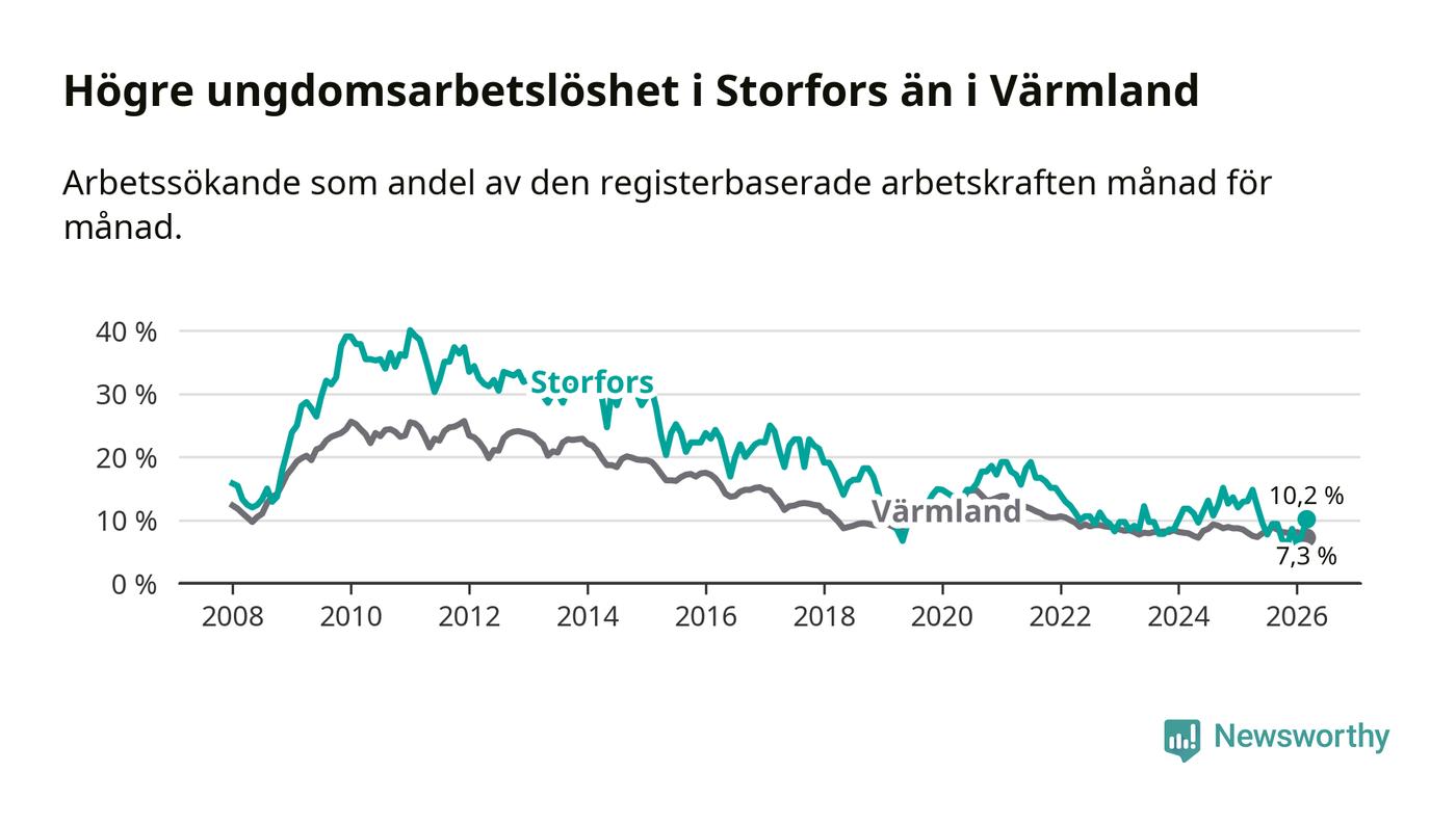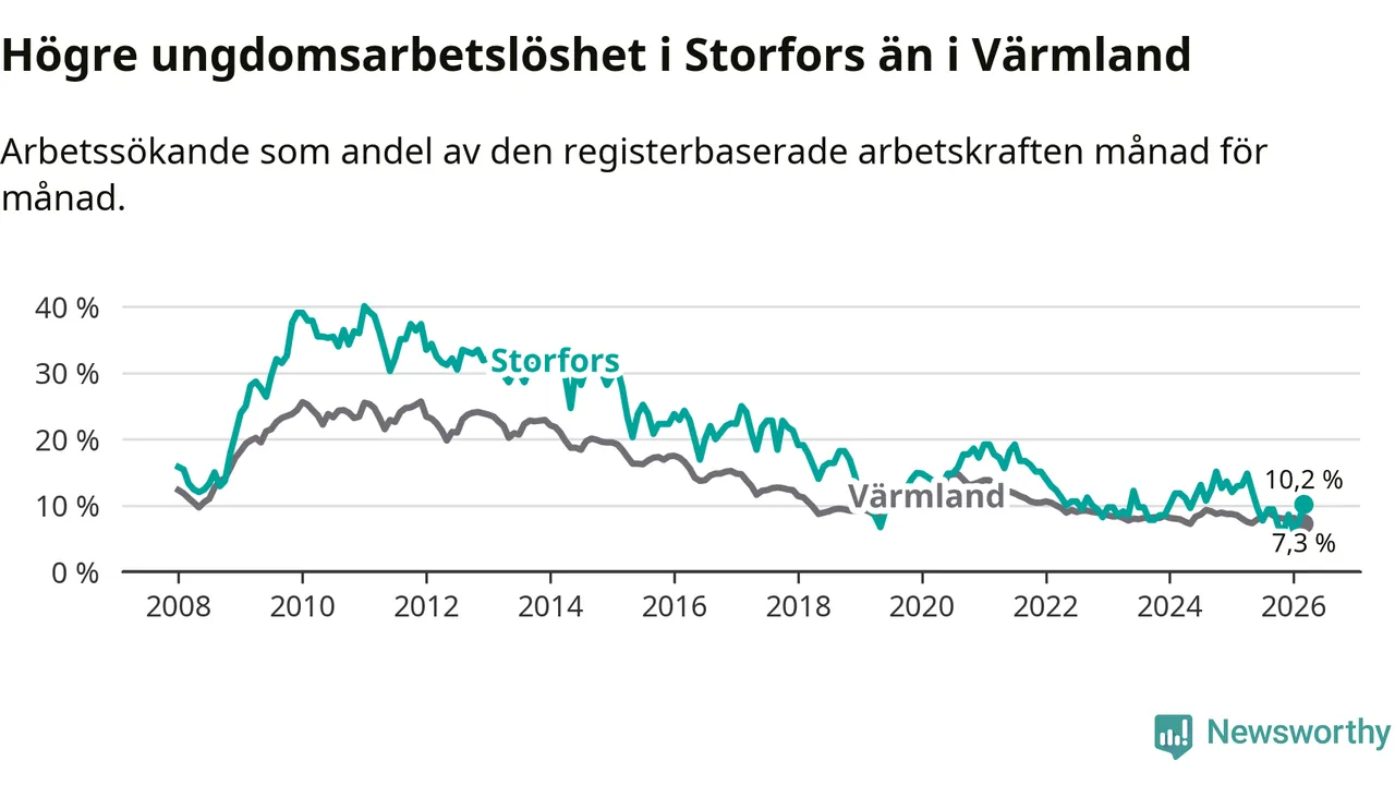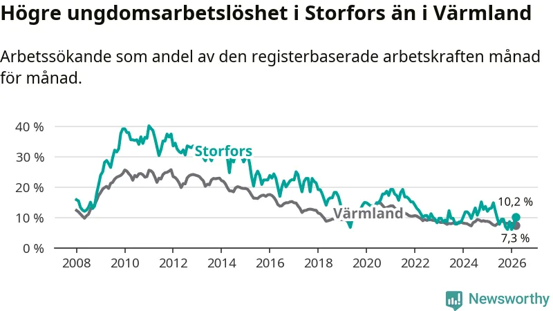 I och med den senaste månadens nedgång har de ungas arbetslöshet i Storfors sjunkit tio månader i följd (ner från 12,1 procent i maj 2025 till 10,2 procent nu).