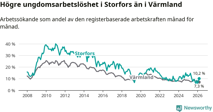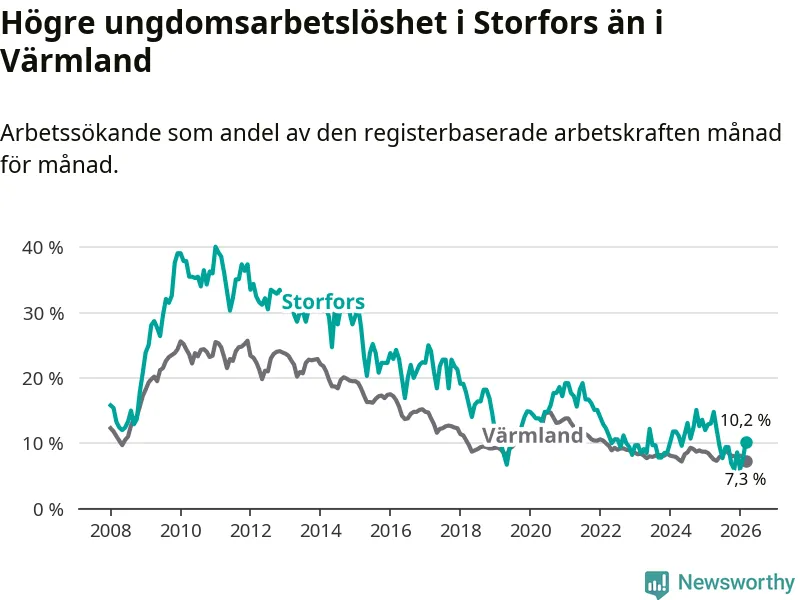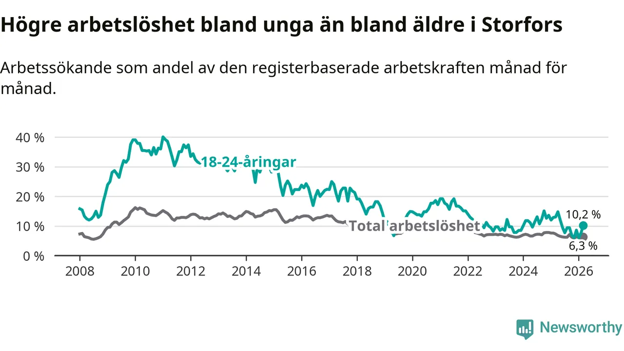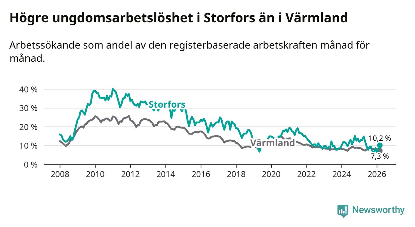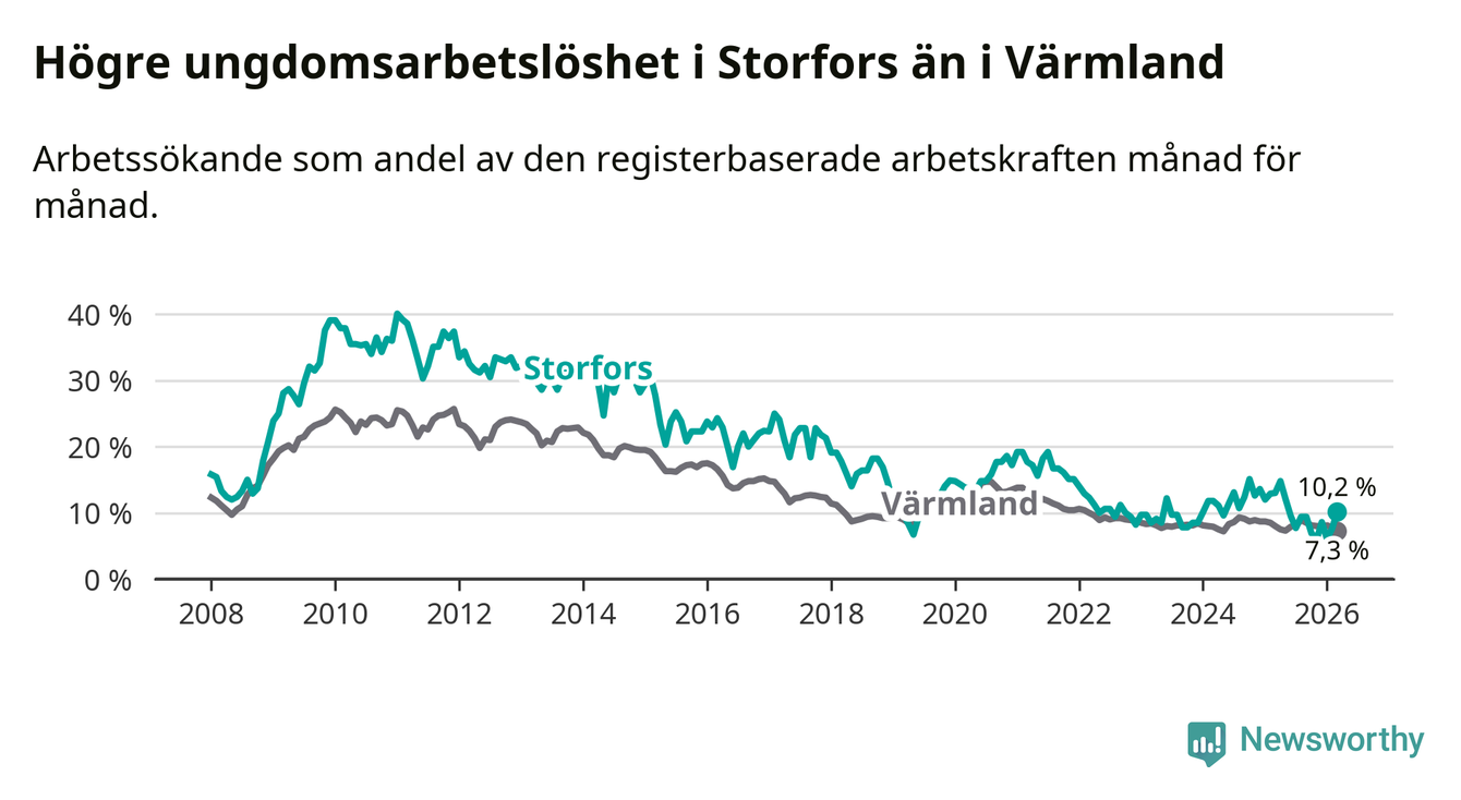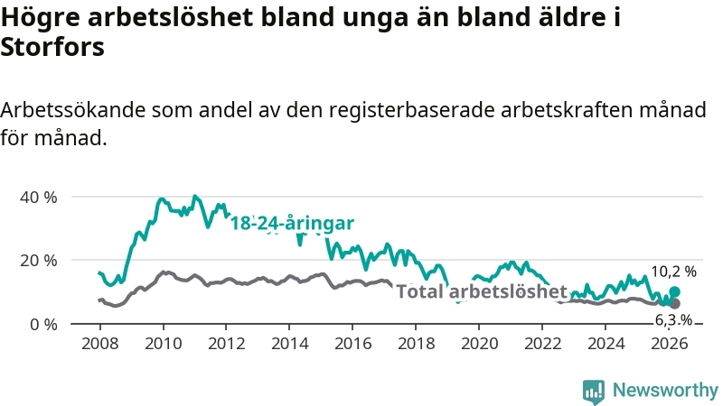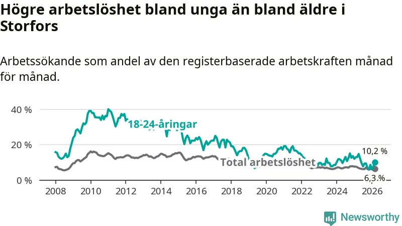 I och med den senaste månadens nedgång har de ungas arbetslöshet i Storfors sjunkit tio månader i följd (ner från 12,1 procent i maj 2025 till 10,2 procent nu).