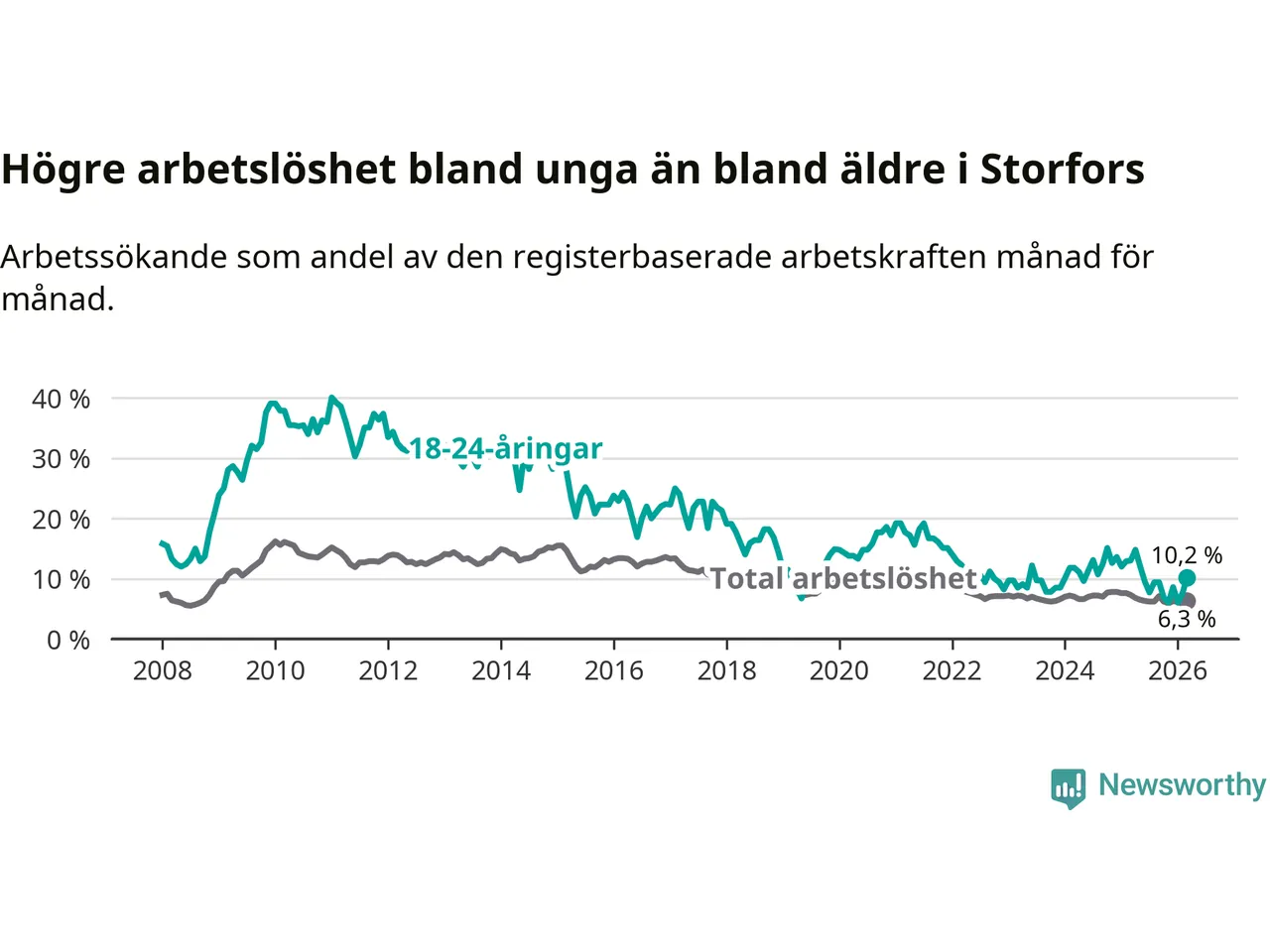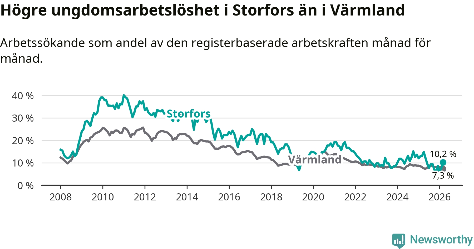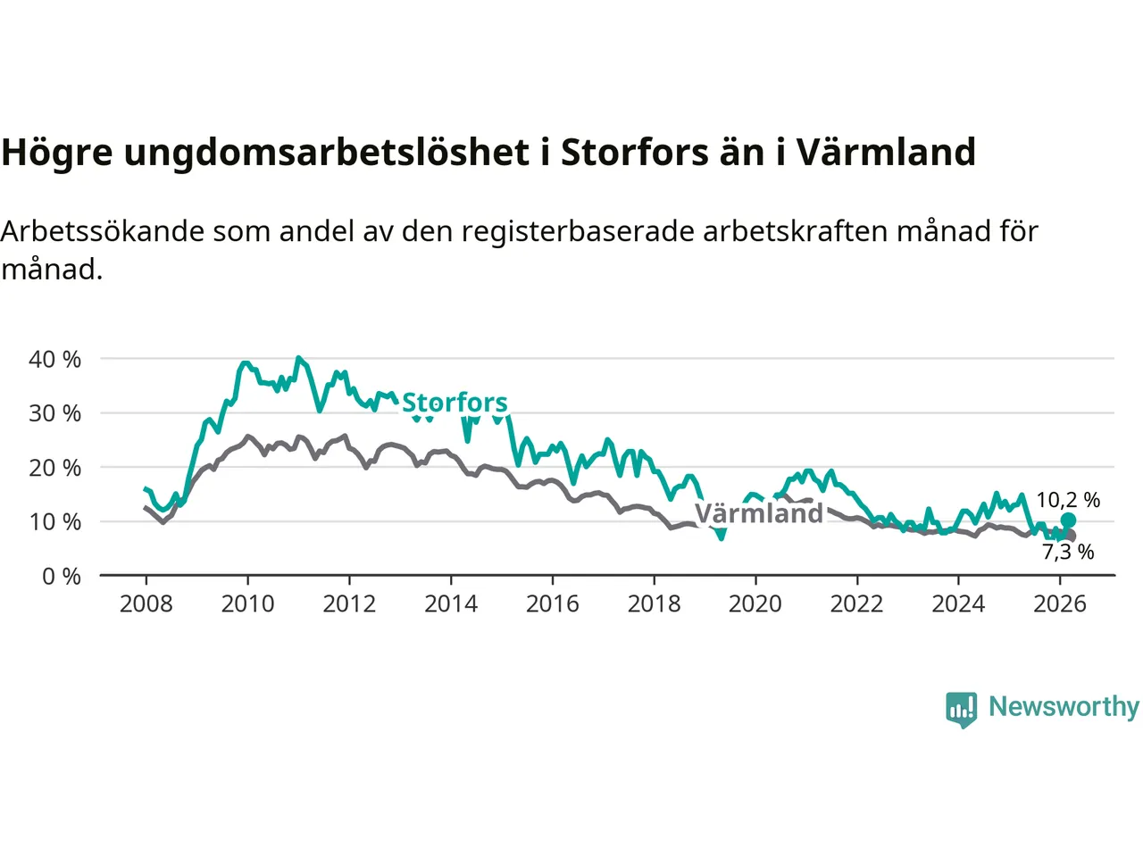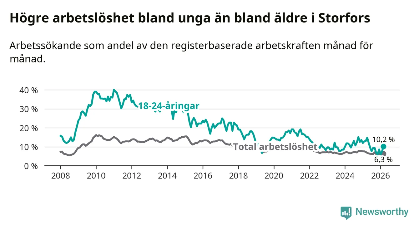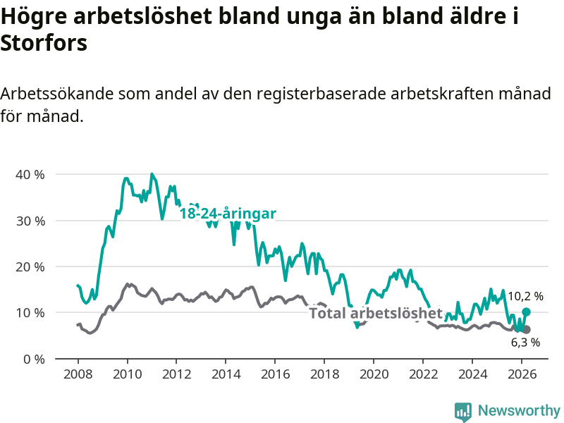 I och med den senaste månadens nedgång har de ungas arbetslöshet i Storfors sjunkit tio månader i följd (ner från 12,1 procent i maj 2025 till 10,2 procent nu).