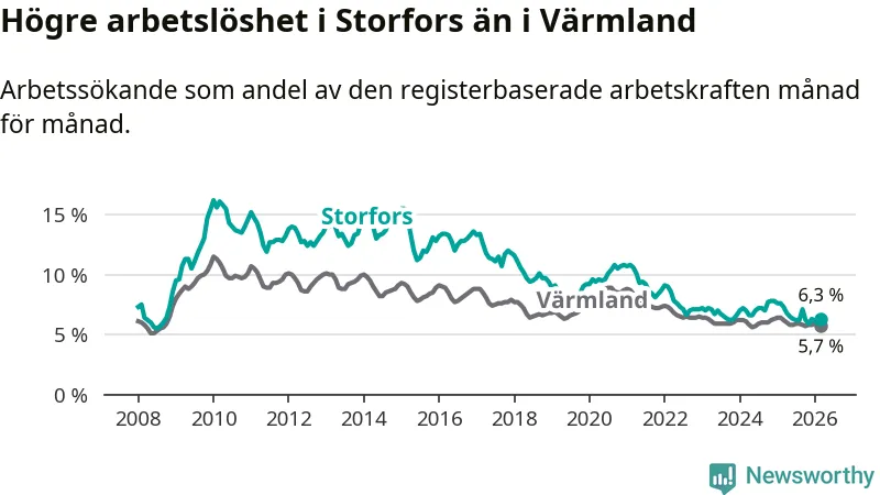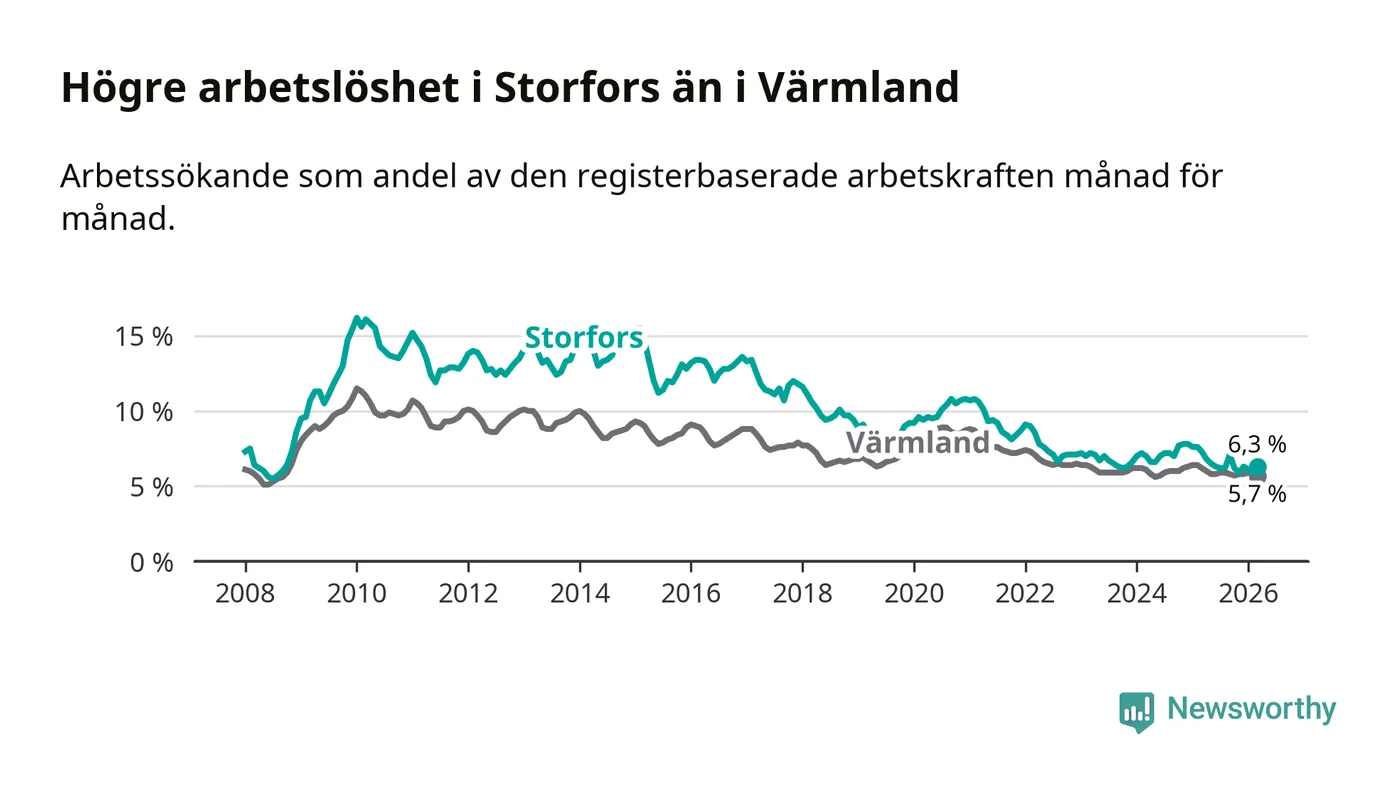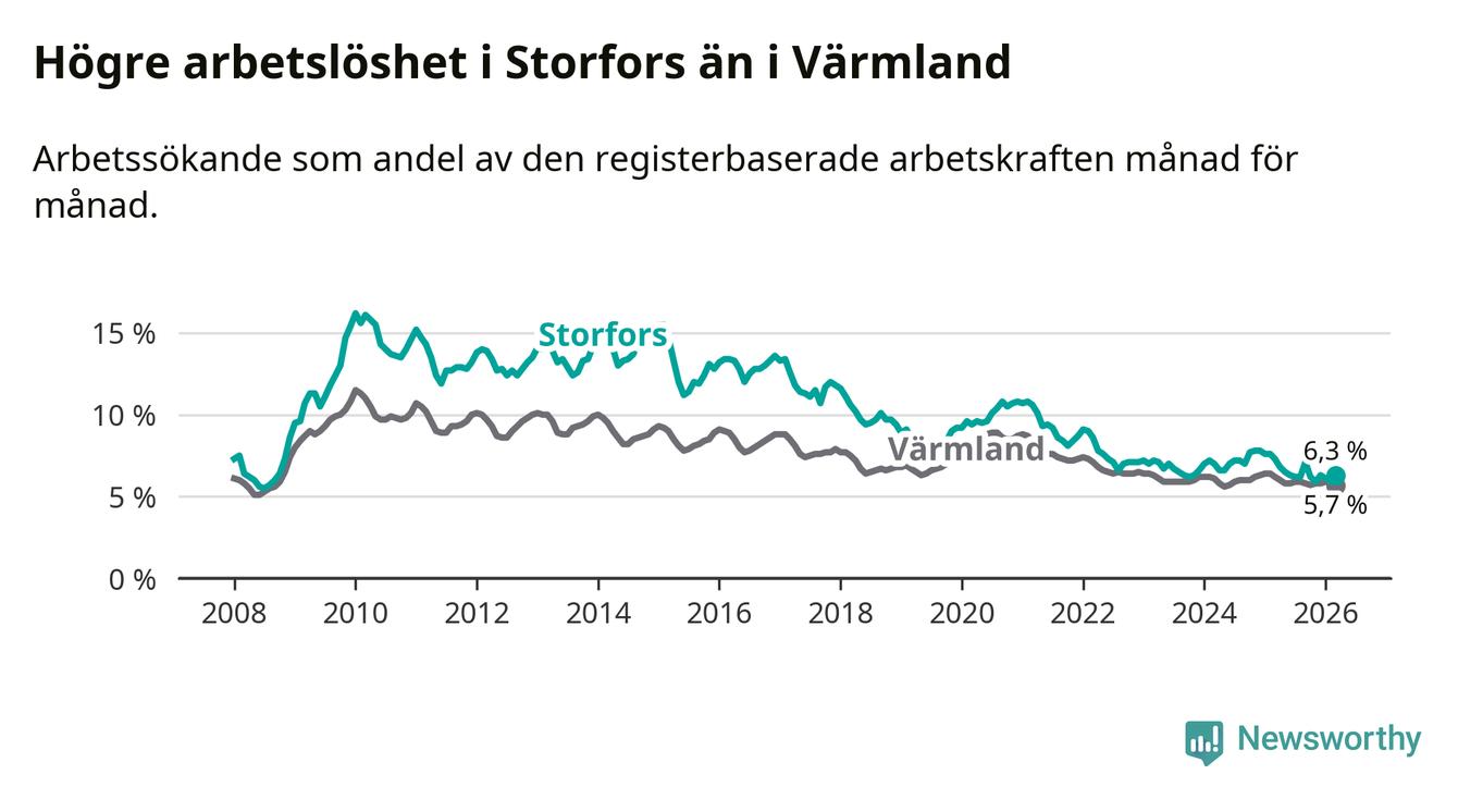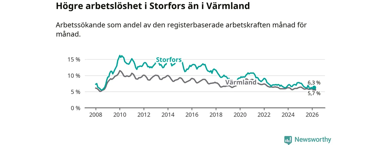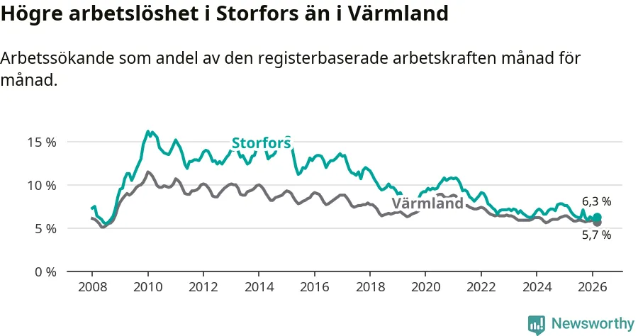 Under mars månad rapporterade Storfors kommun en total arbetslöshet på 6,3 procent. Det är en minskning jämfört med samma tidpunkt i fjol (−1,0 procentenheter). Även i Värmlands län sjunker arbetslösheten .