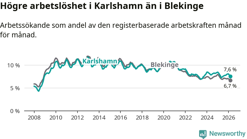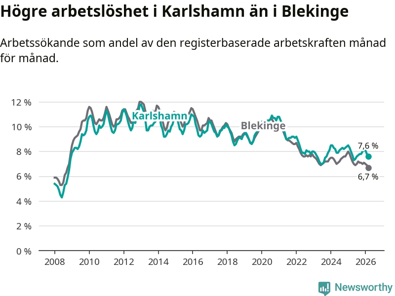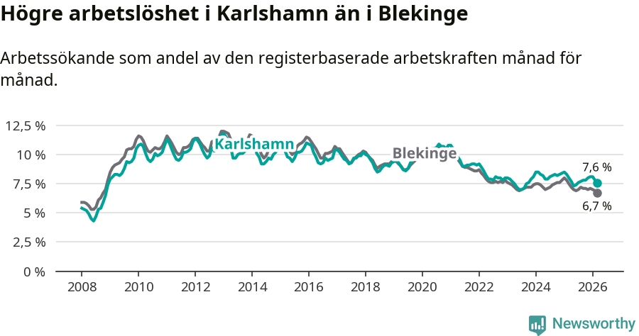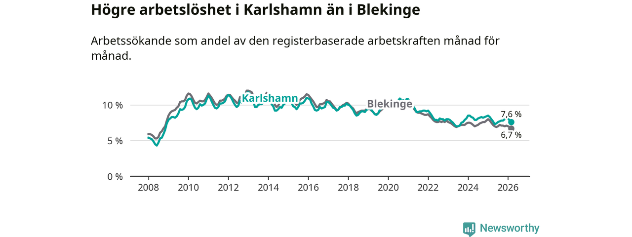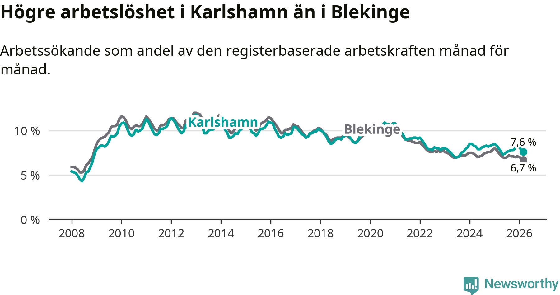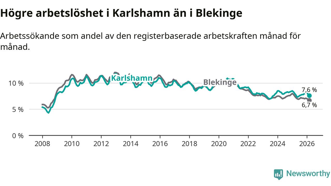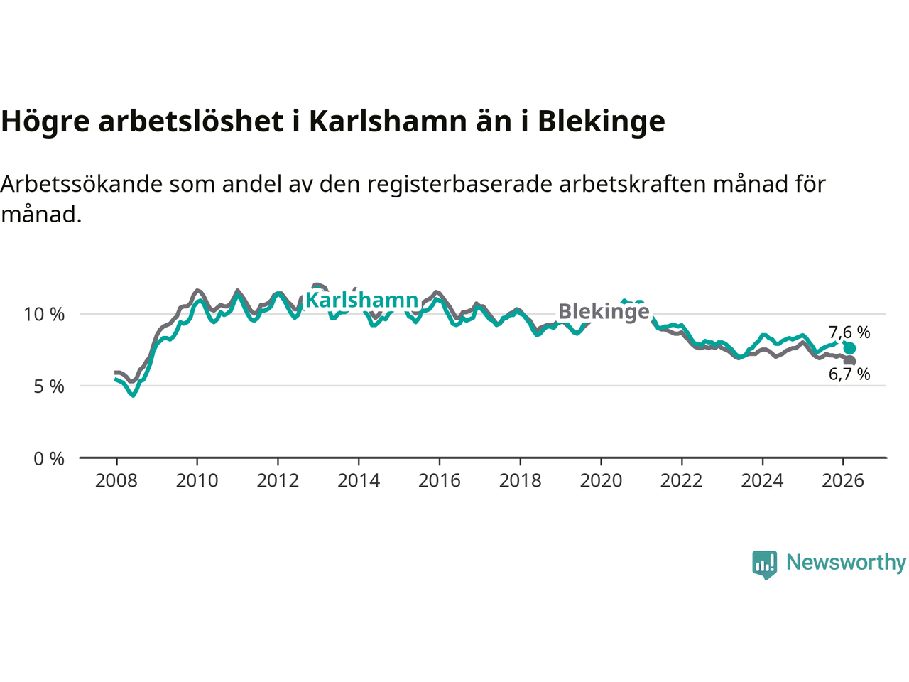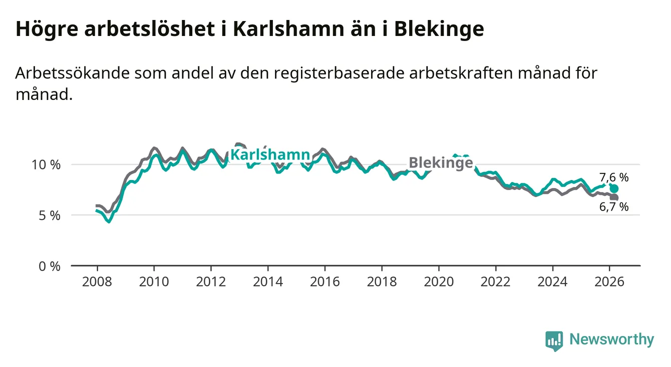 Under mars månad rapporterade Karlshamns kommun en total arbetslöshet på 7,6 procent. Det är en minskning jämfört med samma tidpunkt i fjol (−0,4 procentenheter). Även i Blekinge län sjunker arbetslösheten .