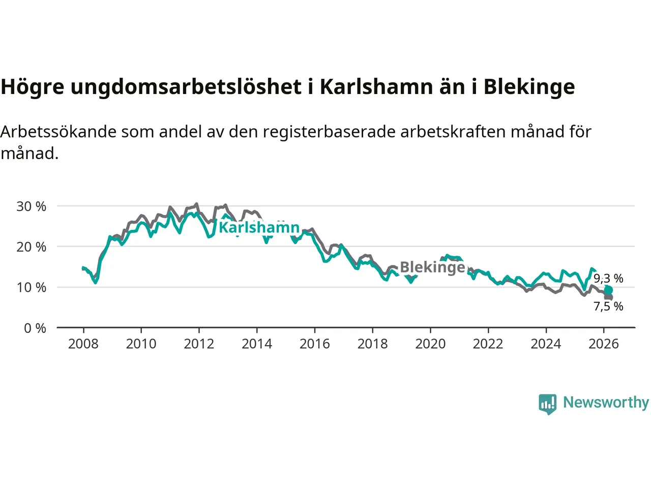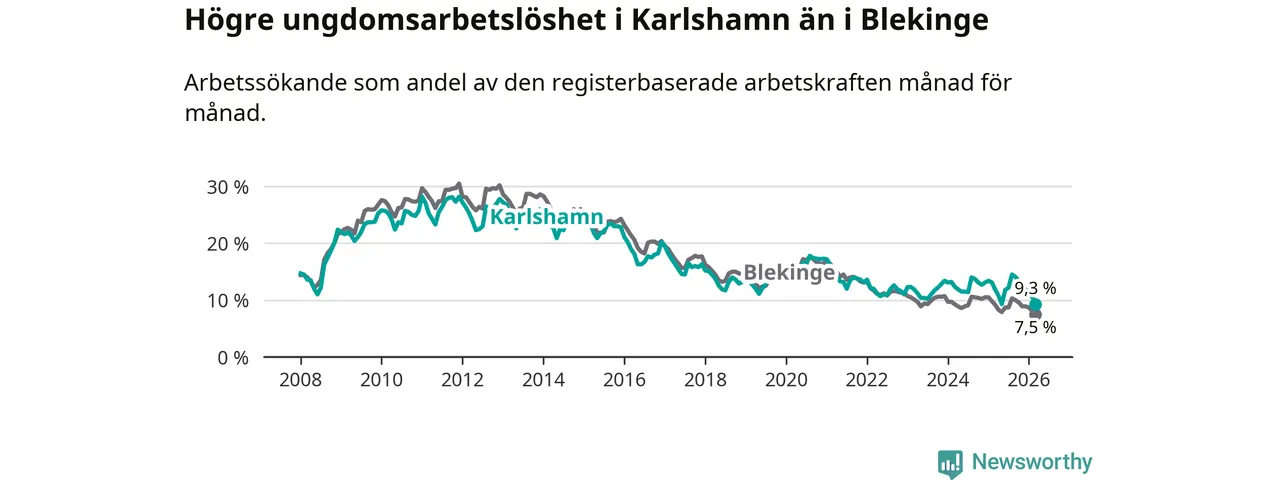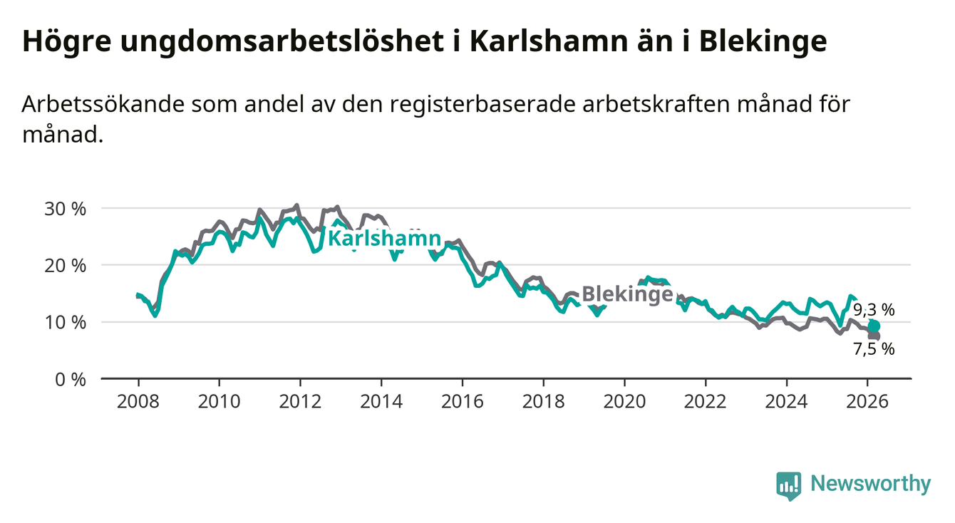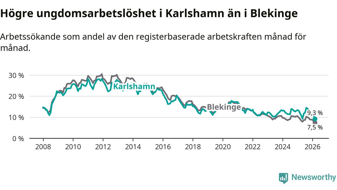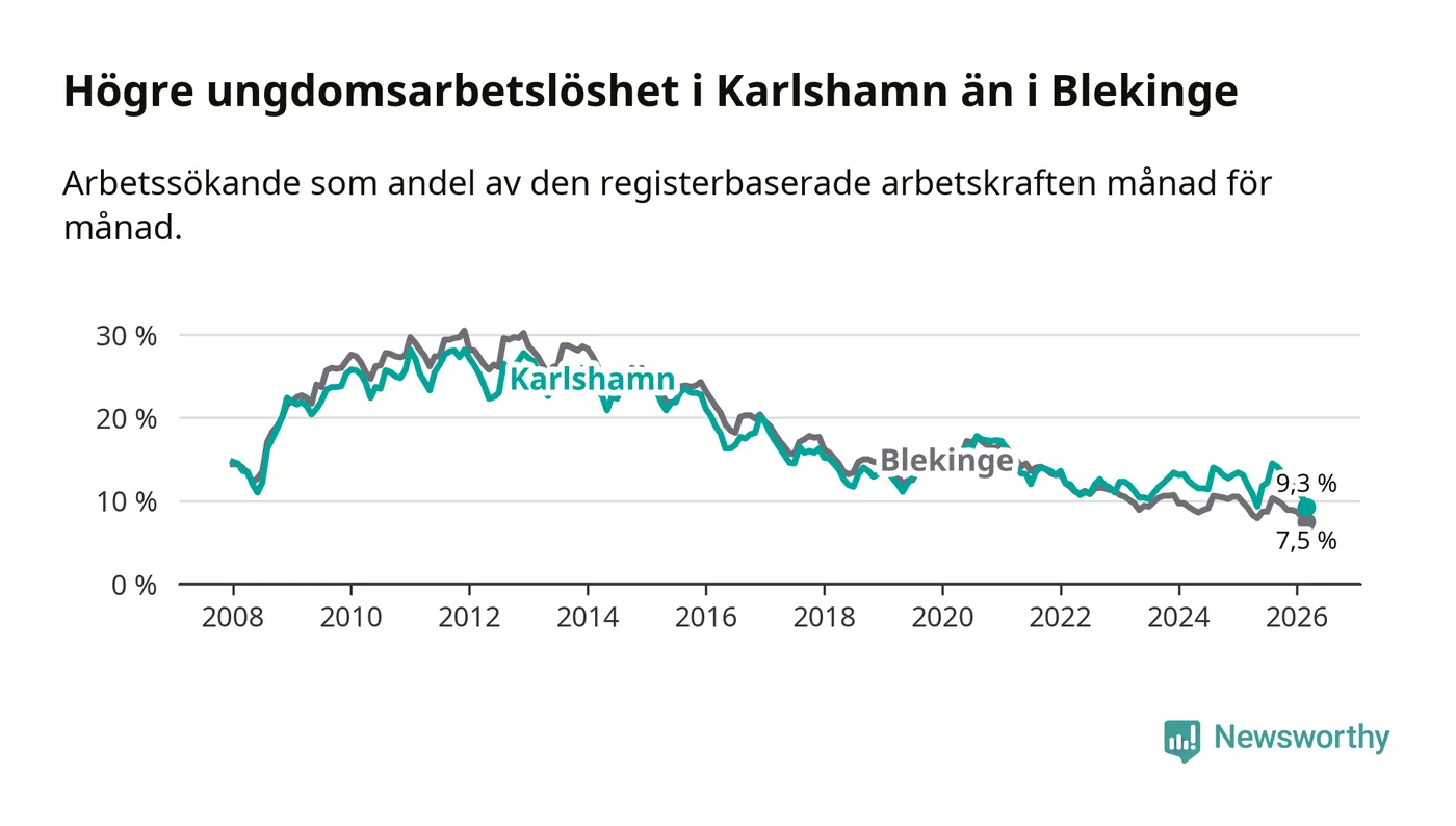 Precis som den totala arbetslösheten ligger ungdomsarbetslösheten i Karlshamn högre än i Blekinge som helhet. Skillnaden mellan kommunen och länet är 1,8 procentenheter.
