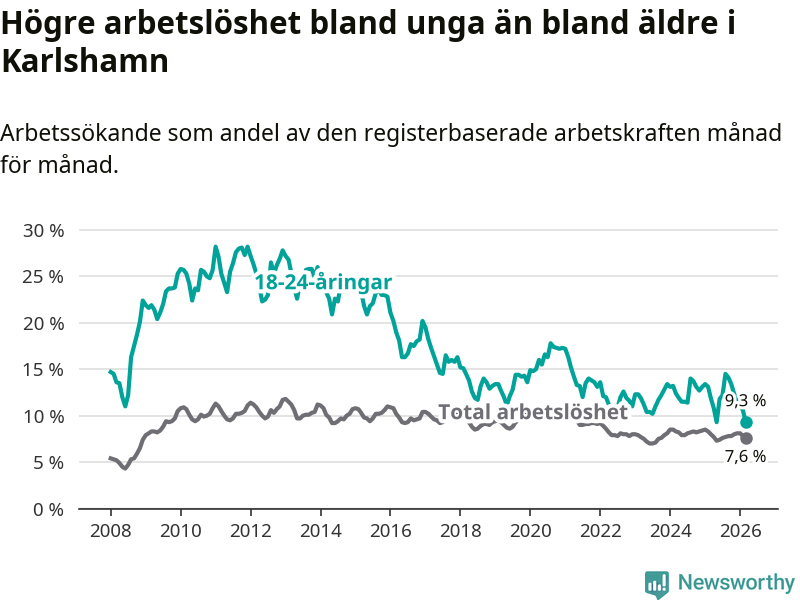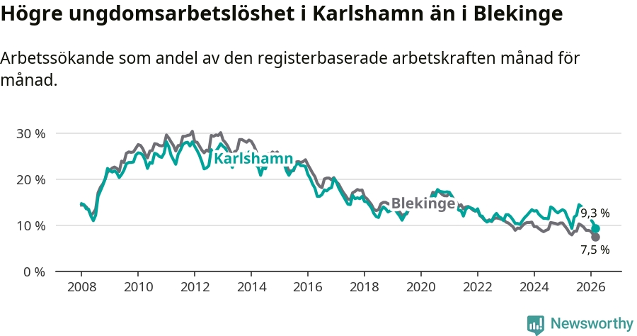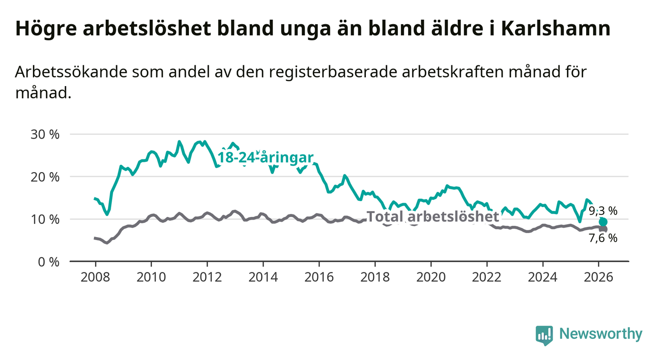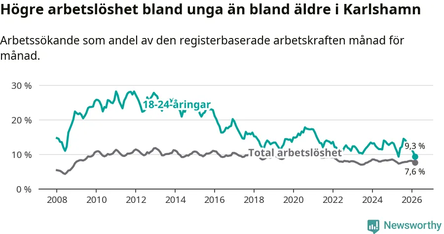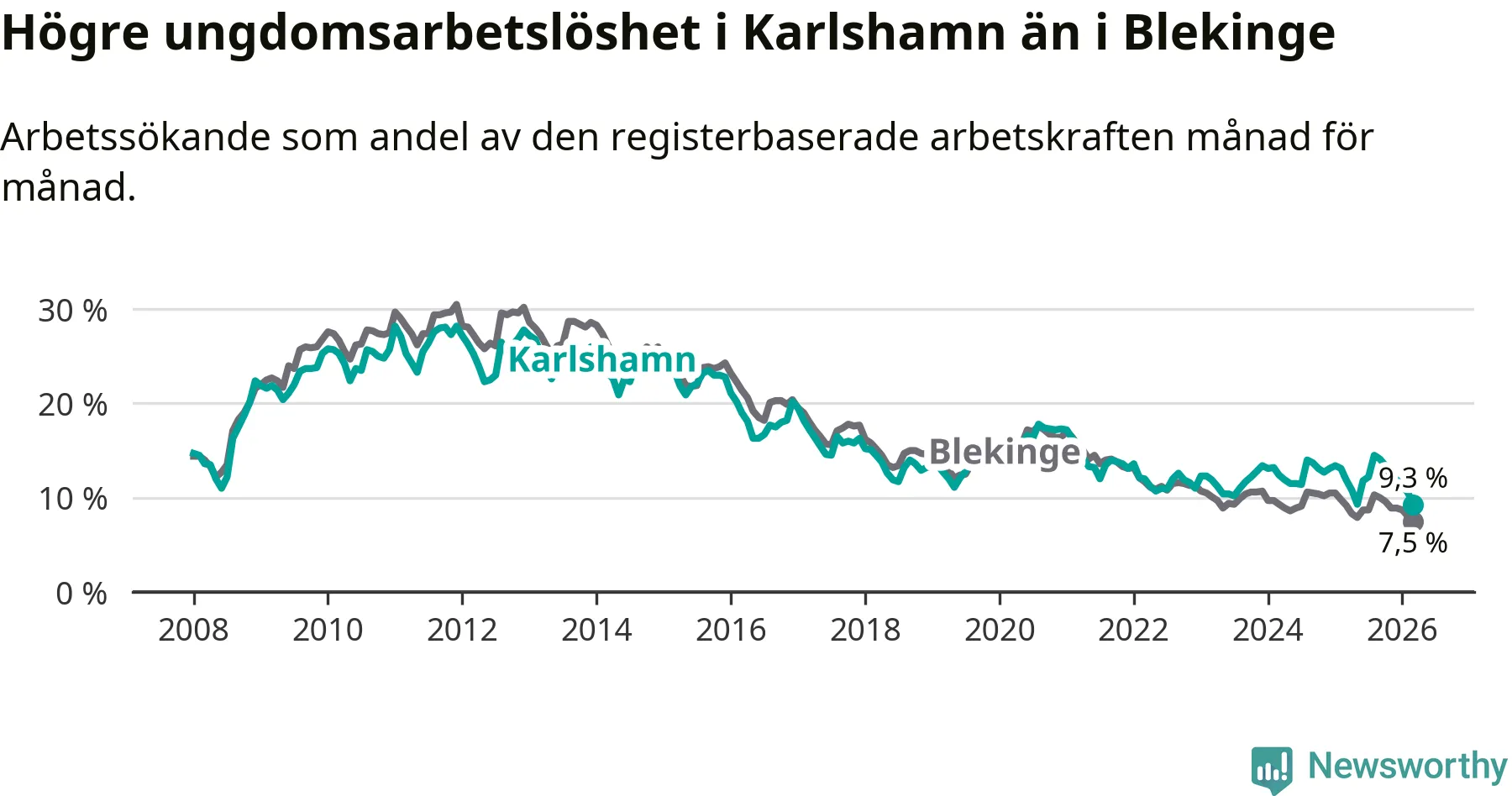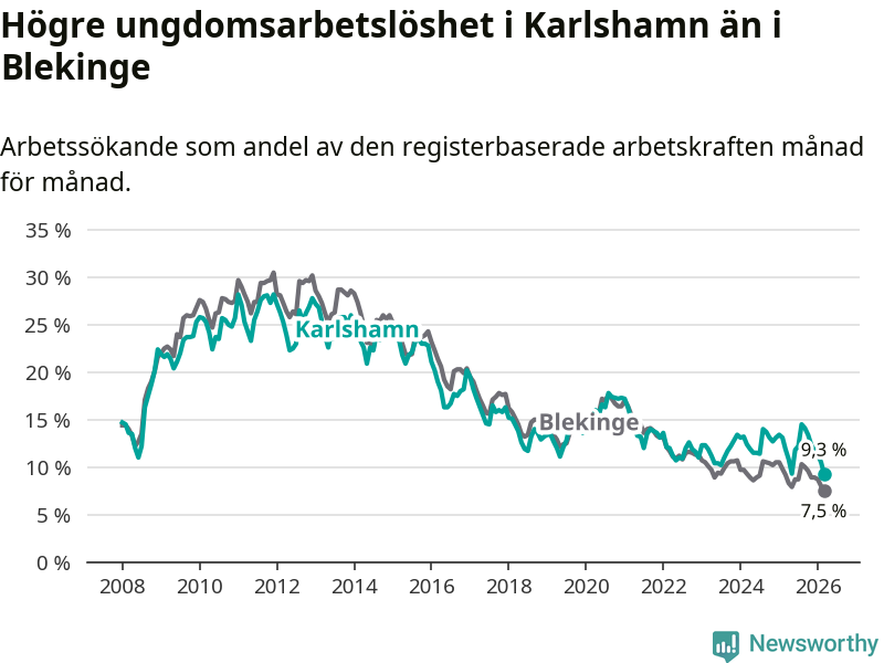 Precis som den totala arbetslösheten ligger ungdomsarbetslösheten i Karlshamn högre än i Blekinge som helhet. Skillnaden mellan kommunen och länet är 1,8 procentenheter.