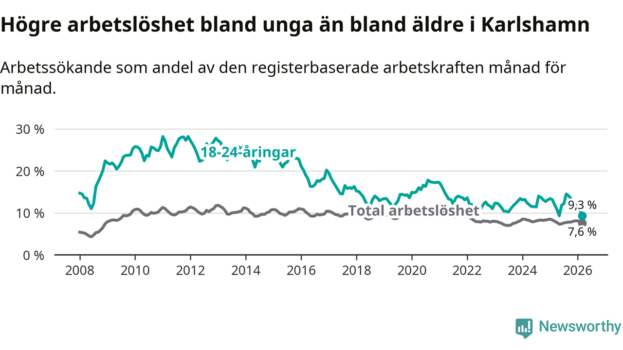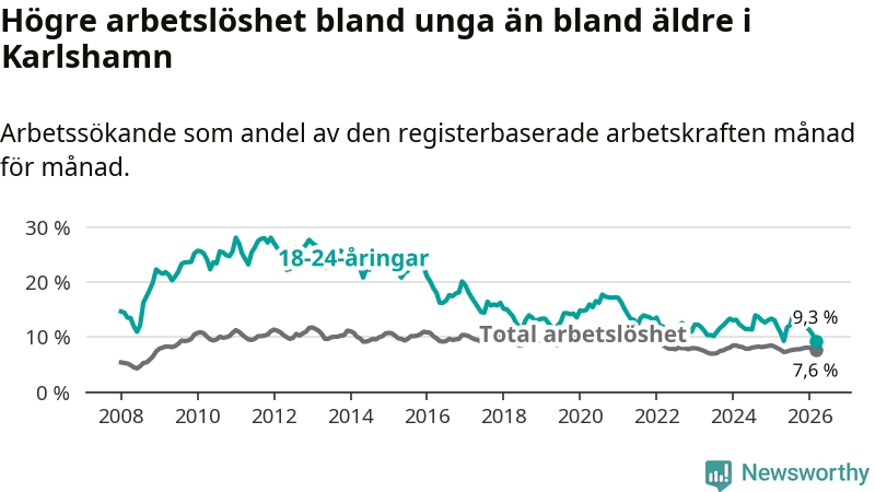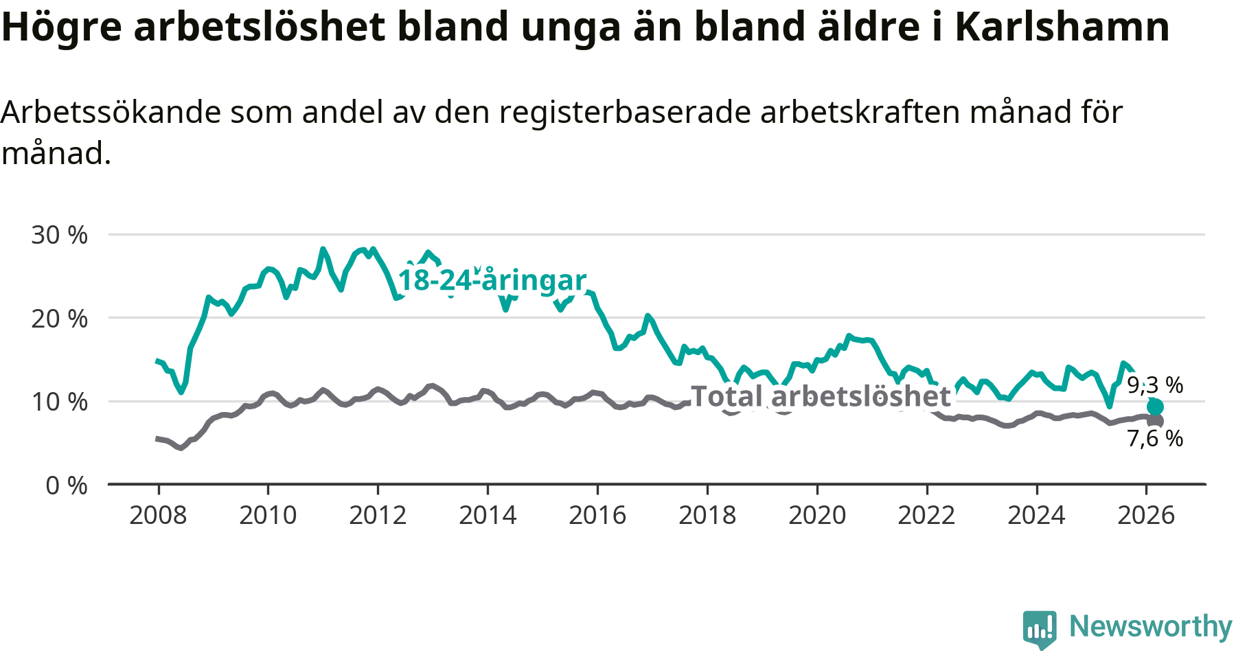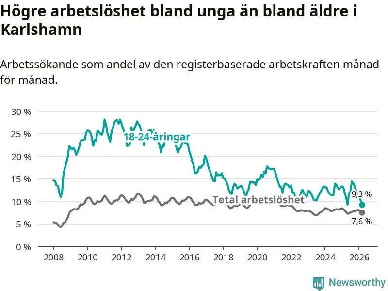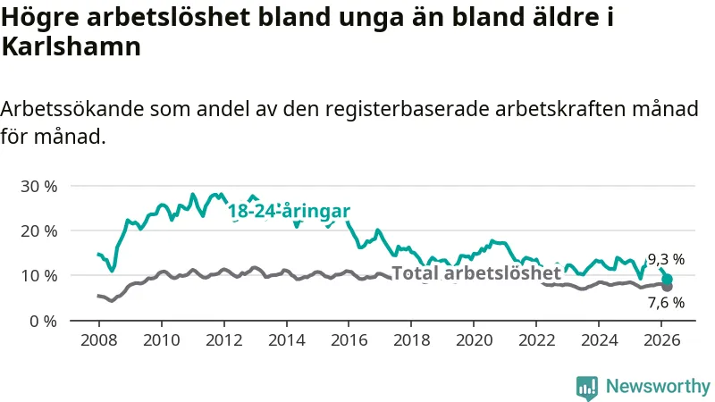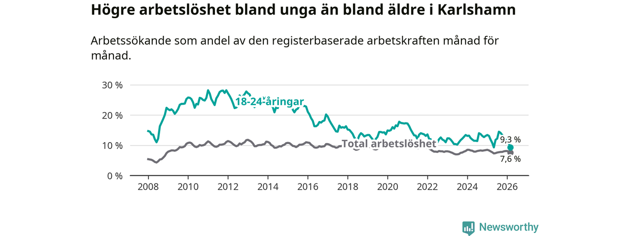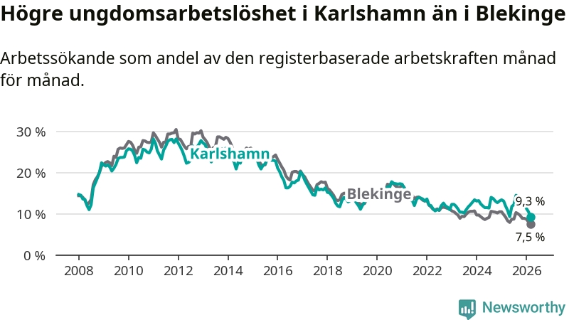 Precis som den totala arbetslösheten ligger ungdomsarbetslösheten i Karlshamn högre än i Blekinge som helhet. Skillnaden mellan kommunen och länet är 1,8 procentenheter.