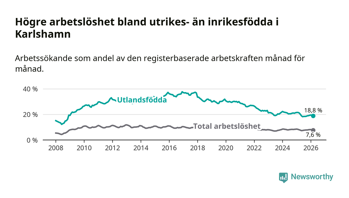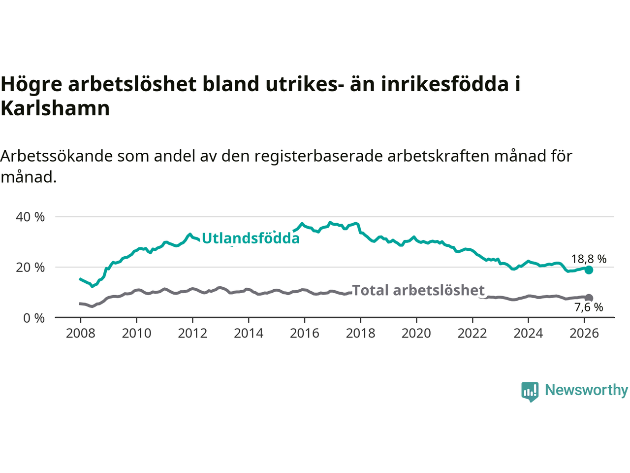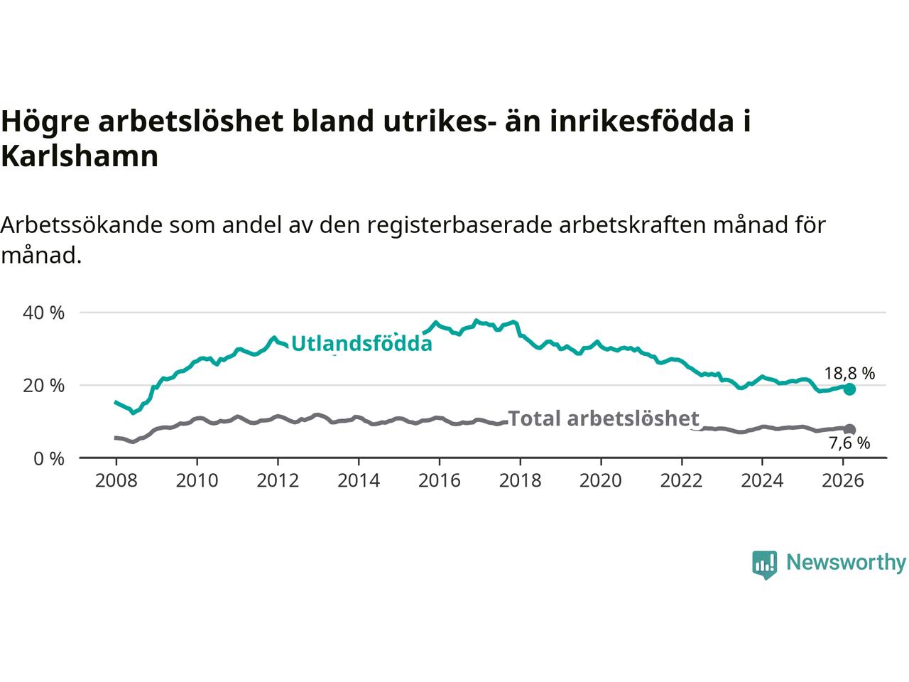 Arbetslösheten bland utlandsfödda var 18,8 procent i Karlshamn under mars månad, motsvarande 500 av 2 660 personer. Det är 2,4 procentenheter färre än vid samma tidpunkt i fjol (−56 om man räknar personer). Därmed är de utlandsföddas arbetslöshet lägre än vid samma tidpunkt i fjol för 16:e månaden i följd. Sedan november 2024 har arbetslösheten bland utlandsfödda minskat från 20,9 till 18,8 procent.