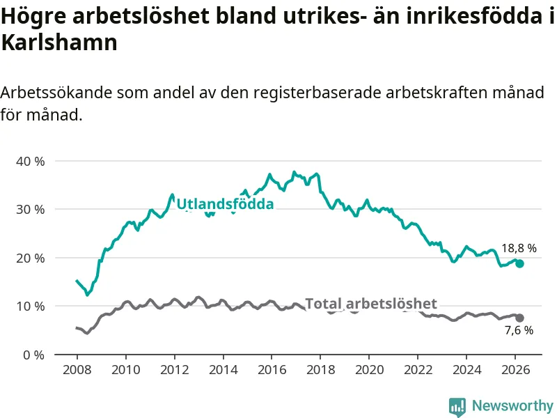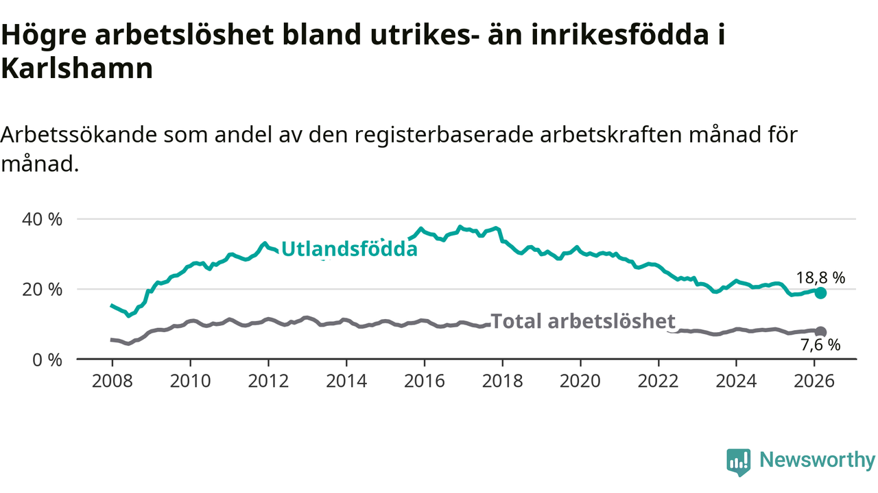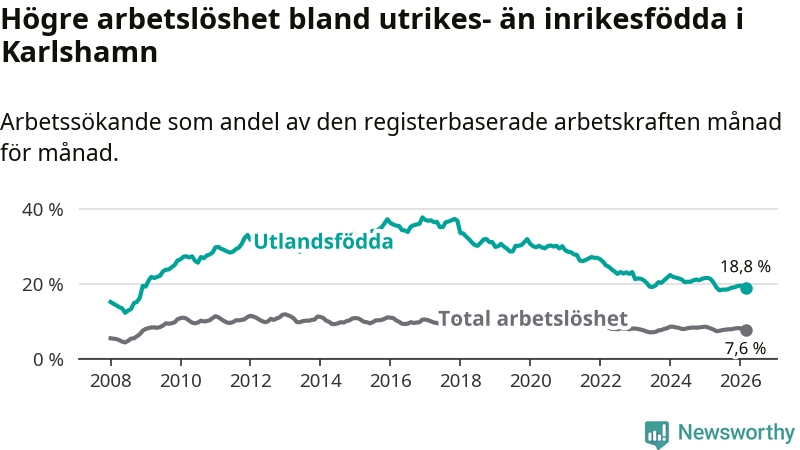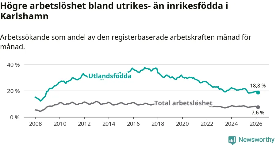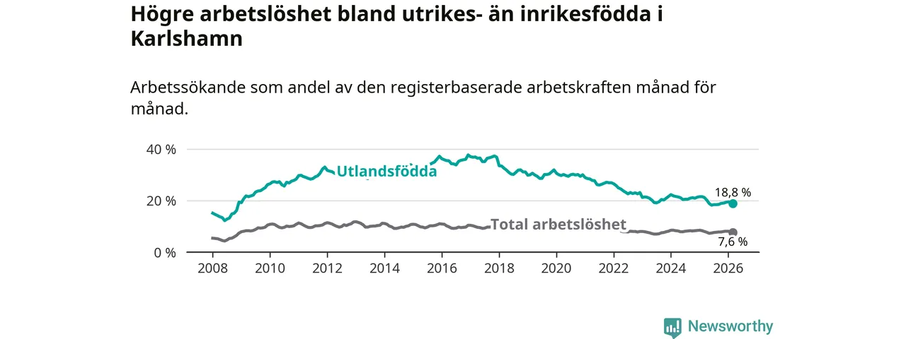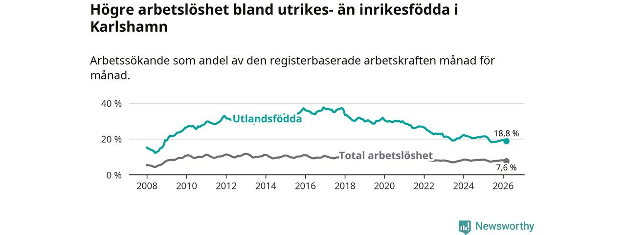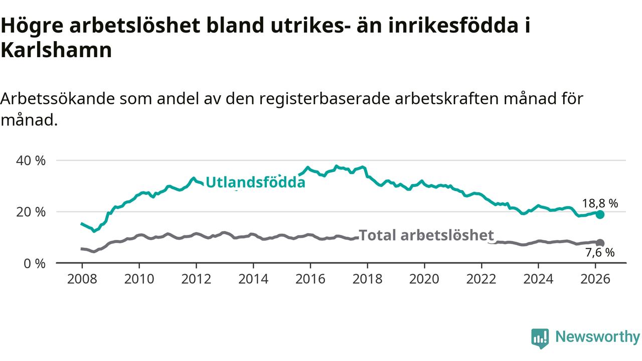 Arbetslösheten bland utlandsfödda var 18,8 procent i Karlshamn under mars månad, motsvarande 500 av 2 660 personer. Det är 2,4 procentenheter färre än vid samma tidpunkt i fjol (−56 om man räknar personer). Därmed är de utlandsföddas arbetslöshet lägre än vid samma tidpunkt i fjol för 16:e månaden i följd. Sedan november 2024 har arbetslösheten bland utlandsfödda minskat från 20,9 till 18,8 procent.