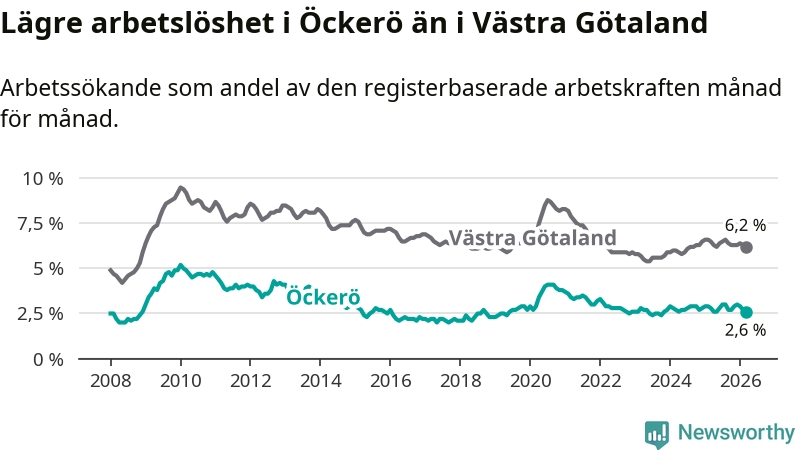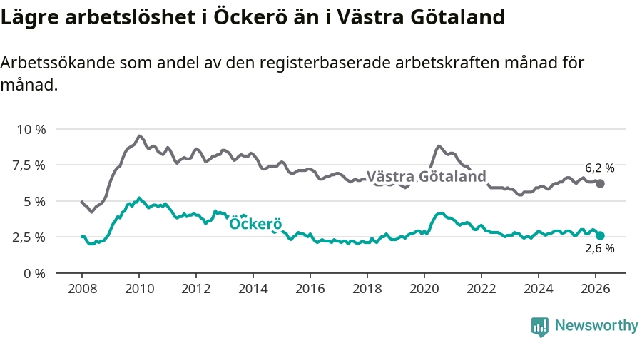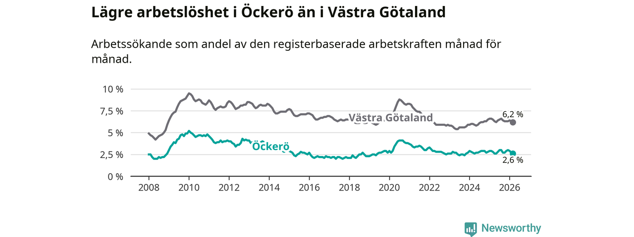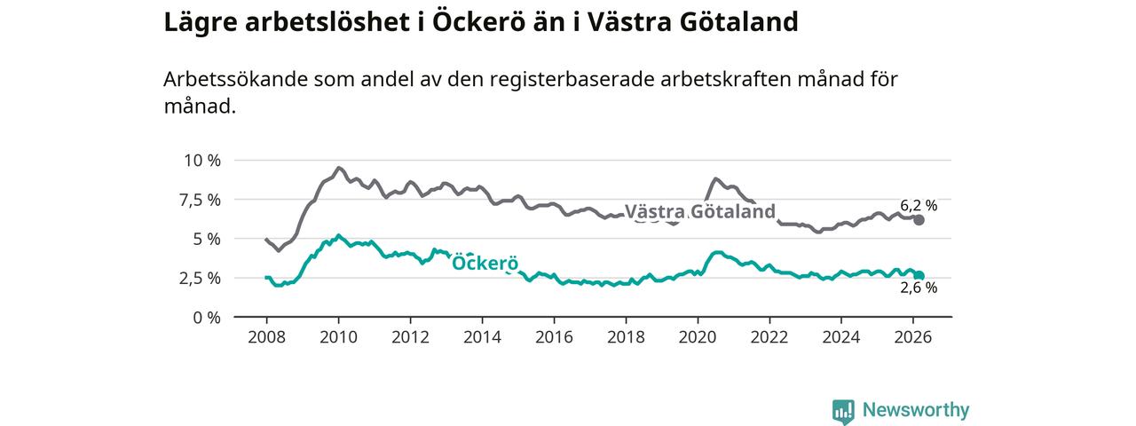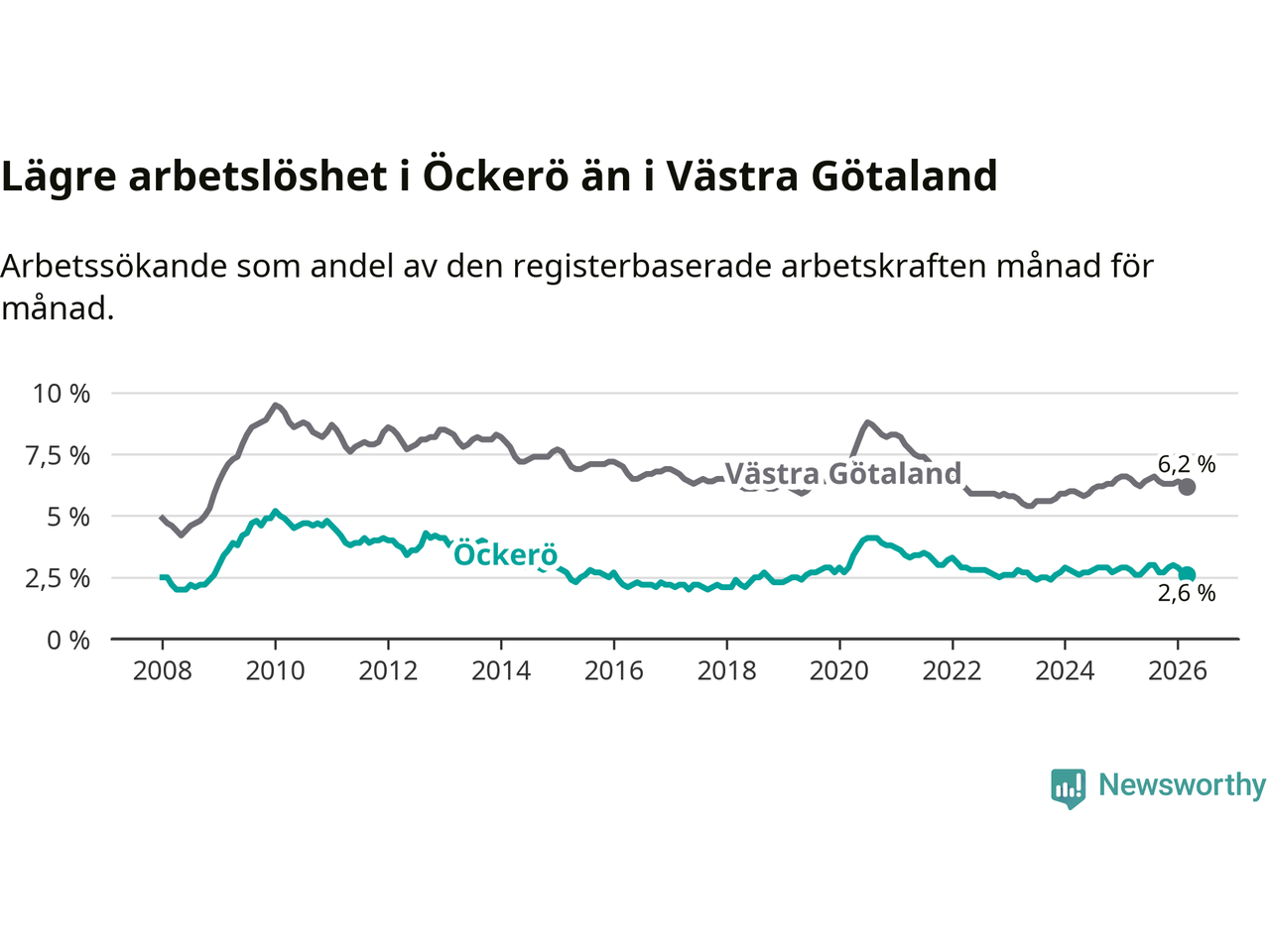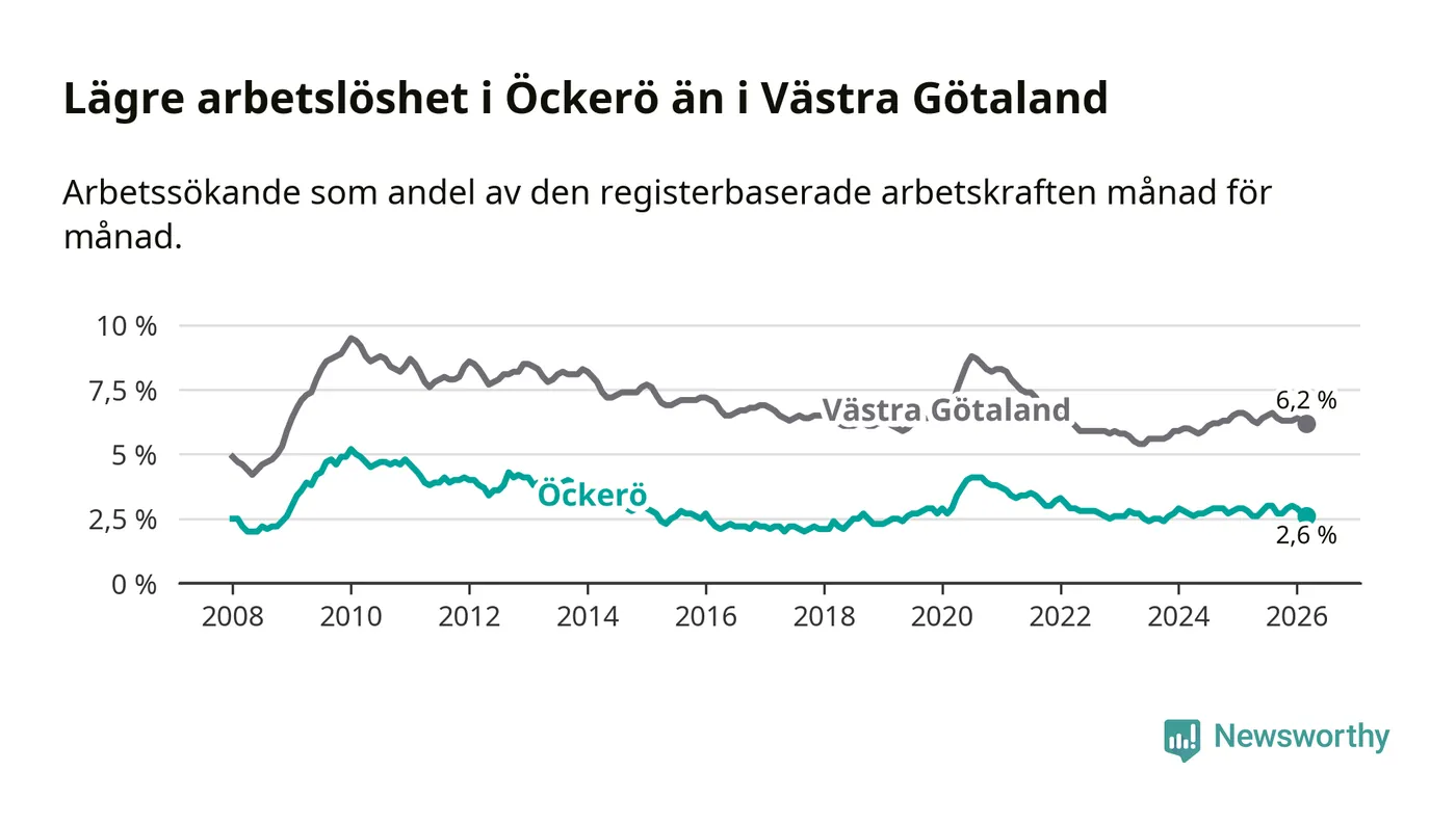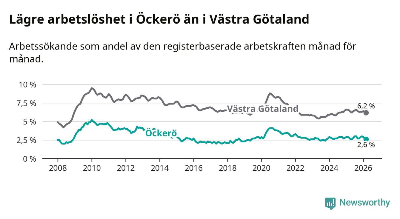 Under mars månad rapporterade Öckerö kommun en total arbetslöshet på 2,6 procent. Det är en minskning jämfört med samma tidpunkt i fjol (−0,2 procentenheter). Även i Västra Götalands län sjunker arbetslösheten .