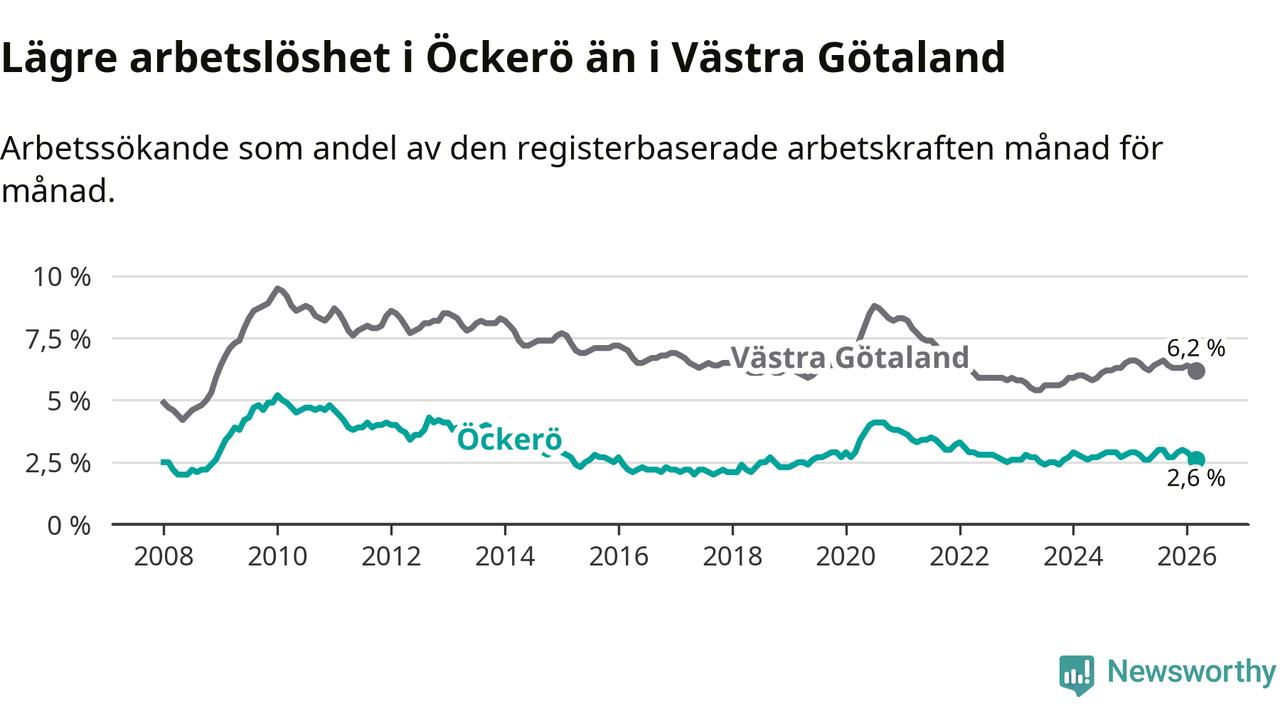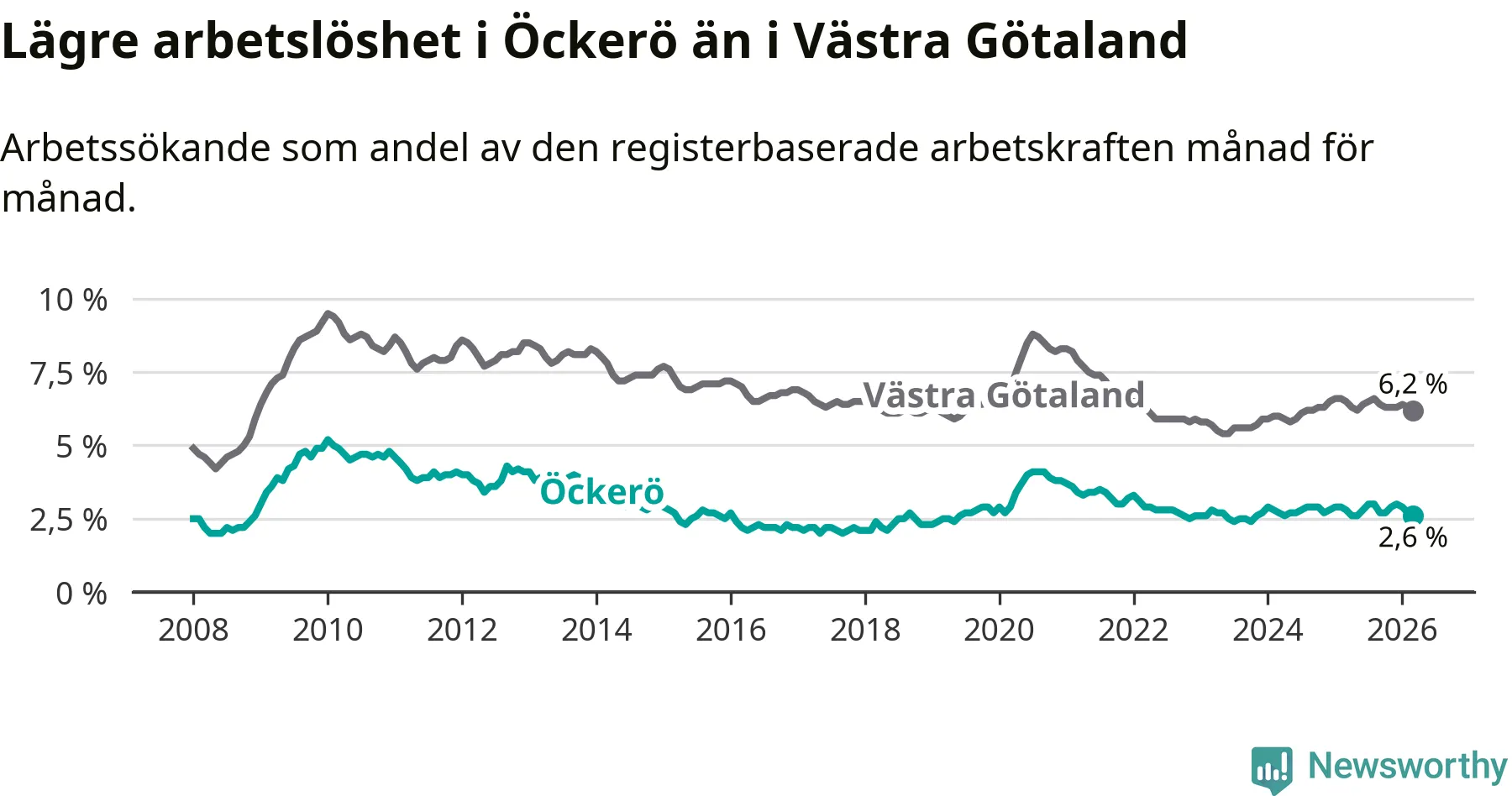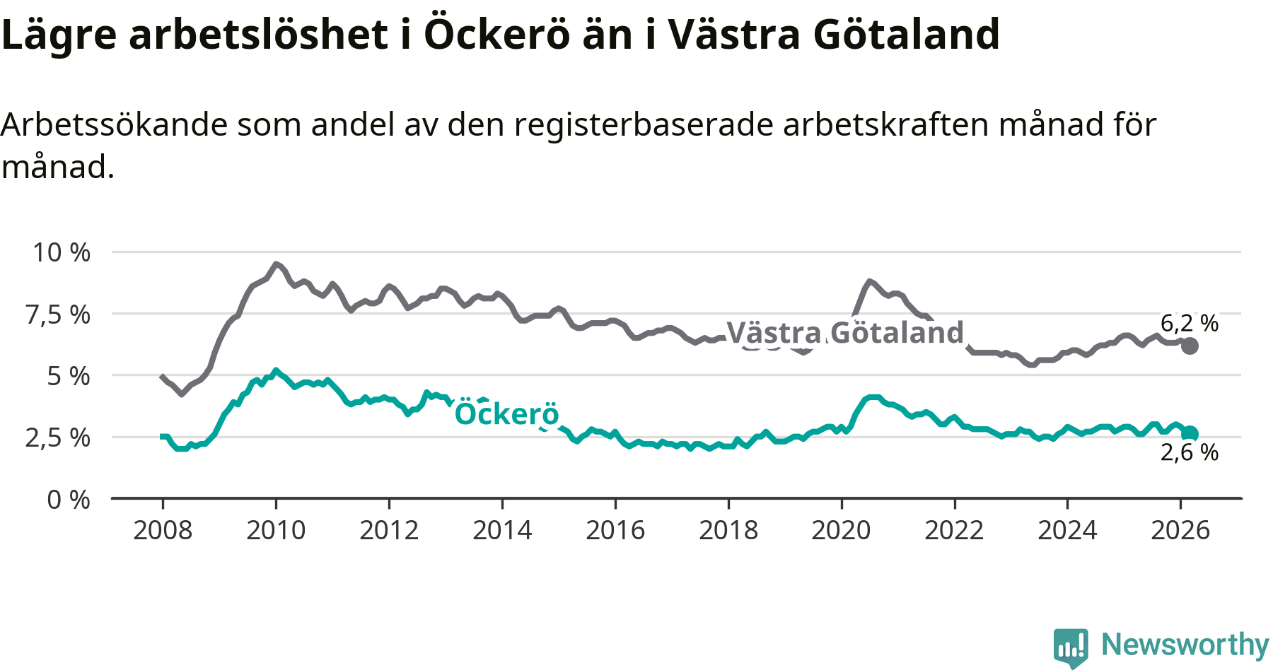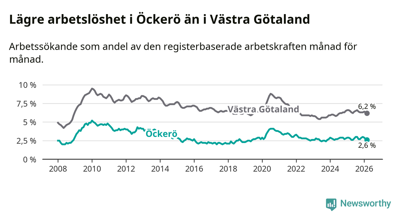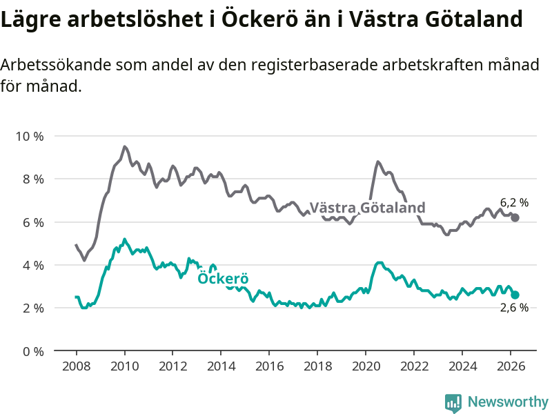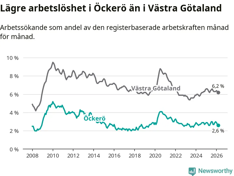 Under mars månad rapporterade Öckerö kommun en total arbetslöshet på 2,6 procent. Det är en minskning jämfört med samma tidpunkt i fjol (−0,2 procentenheter). Även i Västra Götalands län sjunker arbetslösheten .
