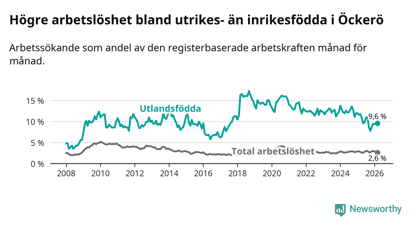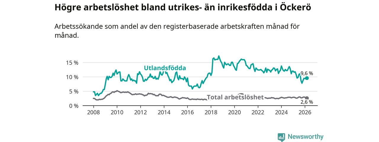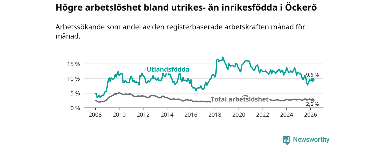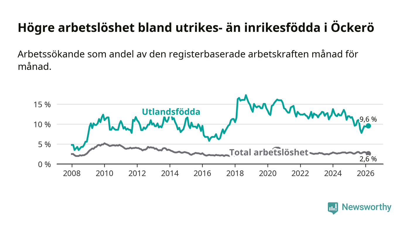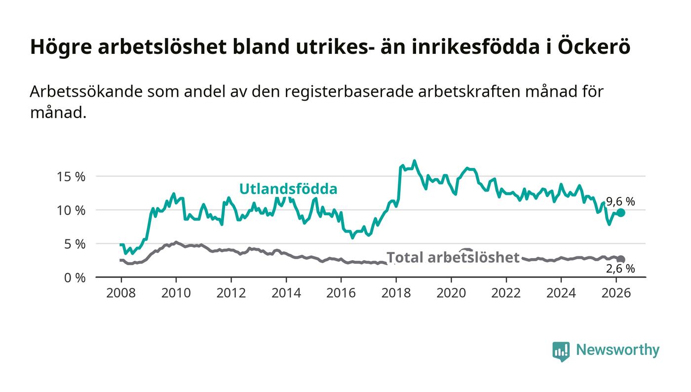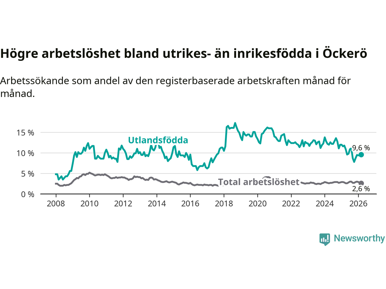 Arbetslösheten bland utlandsfödda var 9,6 procent på Öckerö under mars månad, motsvarande 45 av 469 personer. Det är 2,2 procentenheter färre än vid samma tidpunkt i fjol (−9 om man räknar personer). Därmed är de utlandsföddas arbetslöshet lägre än vid samma tidpunkt i fjol för 17:e månaden i följd. Sedan oktober 2024 har arbetslösheten bland utlandsfödda minskat från 12,8 till 9,6 procent.