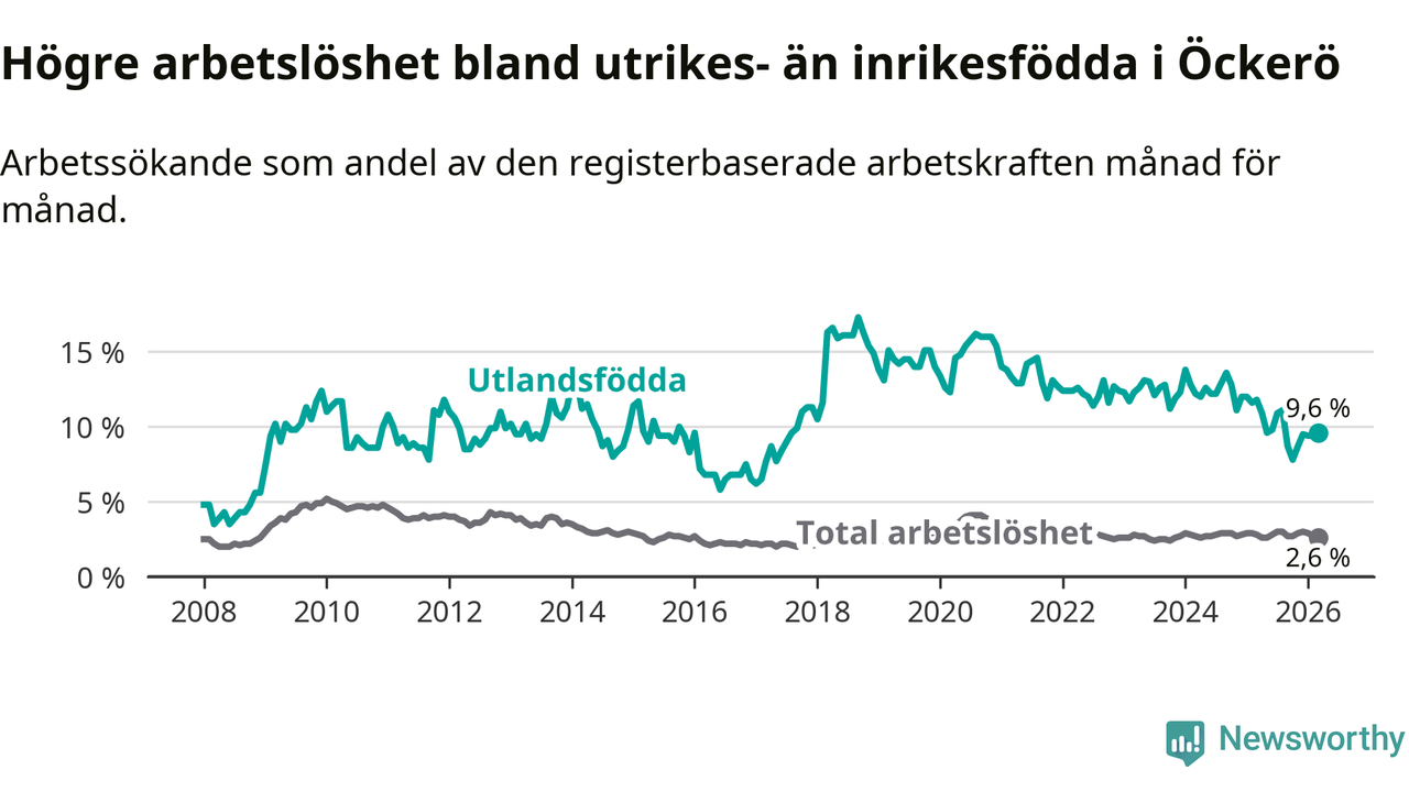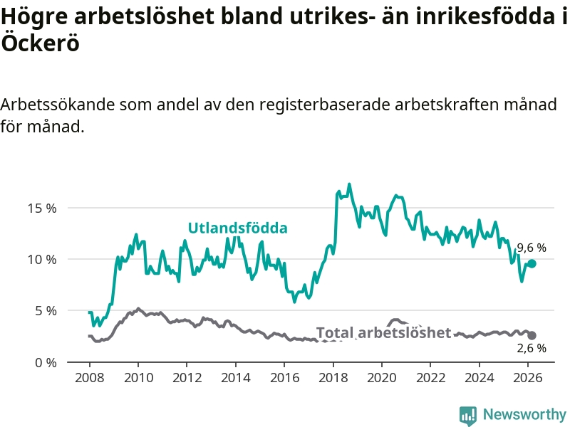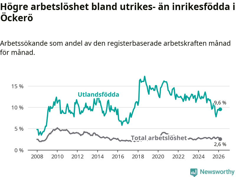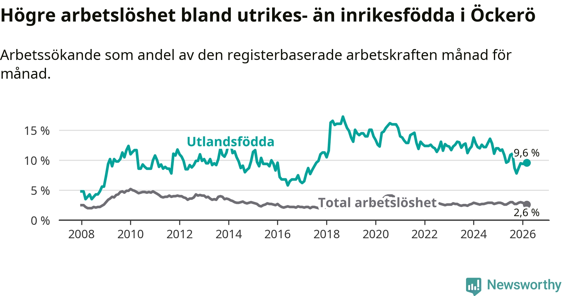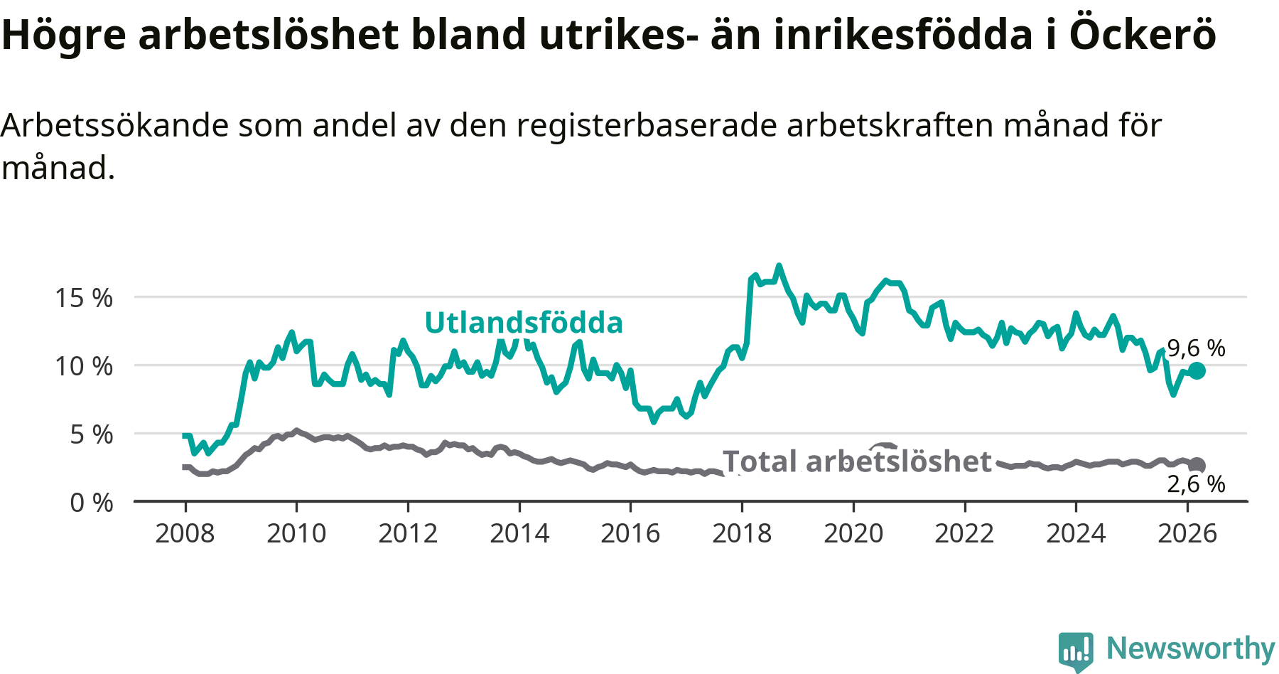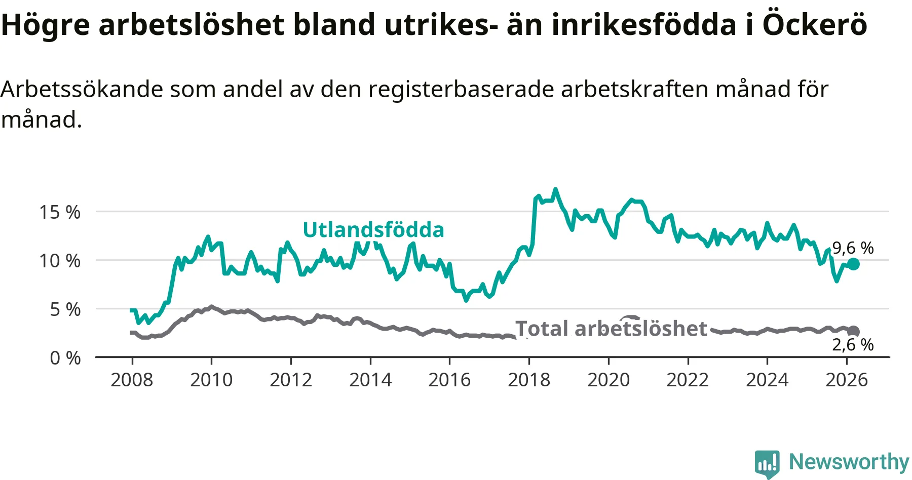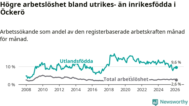 Arbetslösheten bland utlandsfödda var 9,6 procent på Öckerö under mars månad, motsvarande 45 av 469 personer. Det är 2,2 procentenheter färre än vid samma tidpunkt i fjol (−9 om man räknar personer). Därmed är de utlandsföddas arbetslöshet lägre än vid samma tidpunkt i fjol för 17:e månaden i följd. Sedan oktober 2024 har arbetslösheten bland utlandsfödda minskat från 12,8 till 9,6 procent.