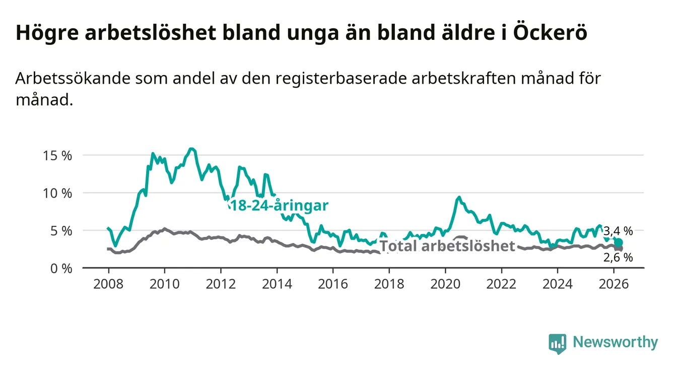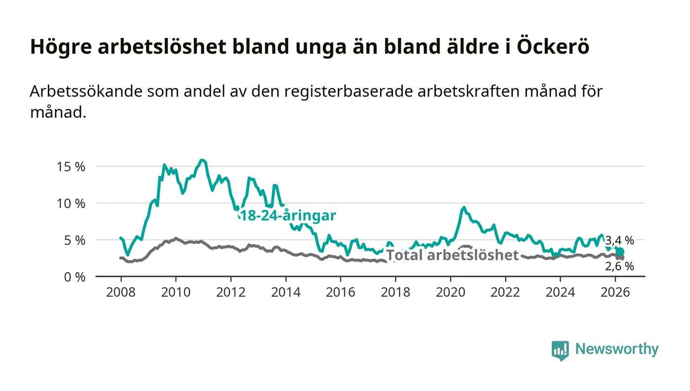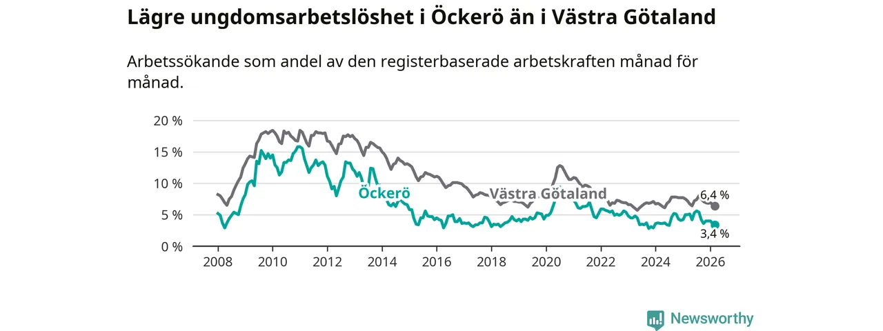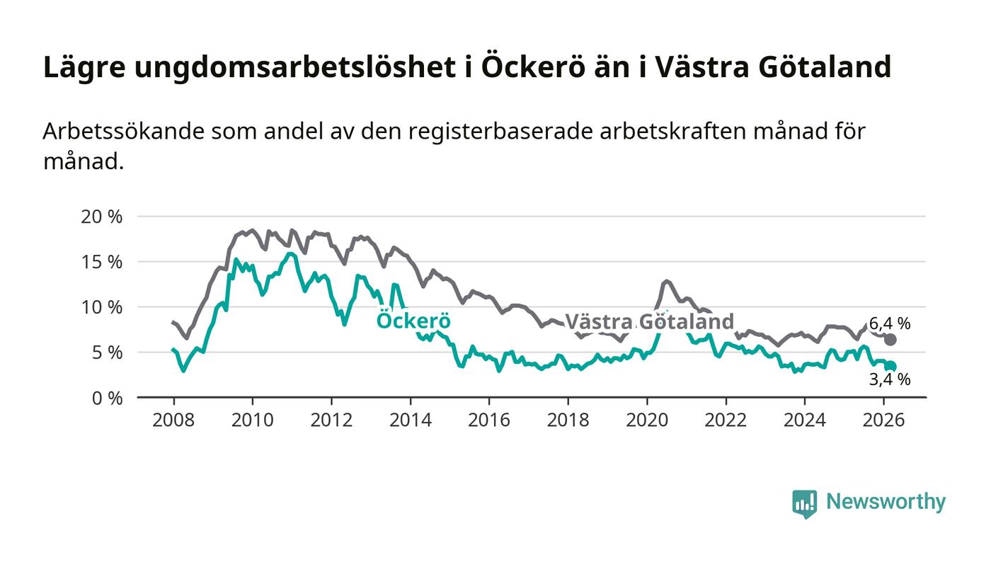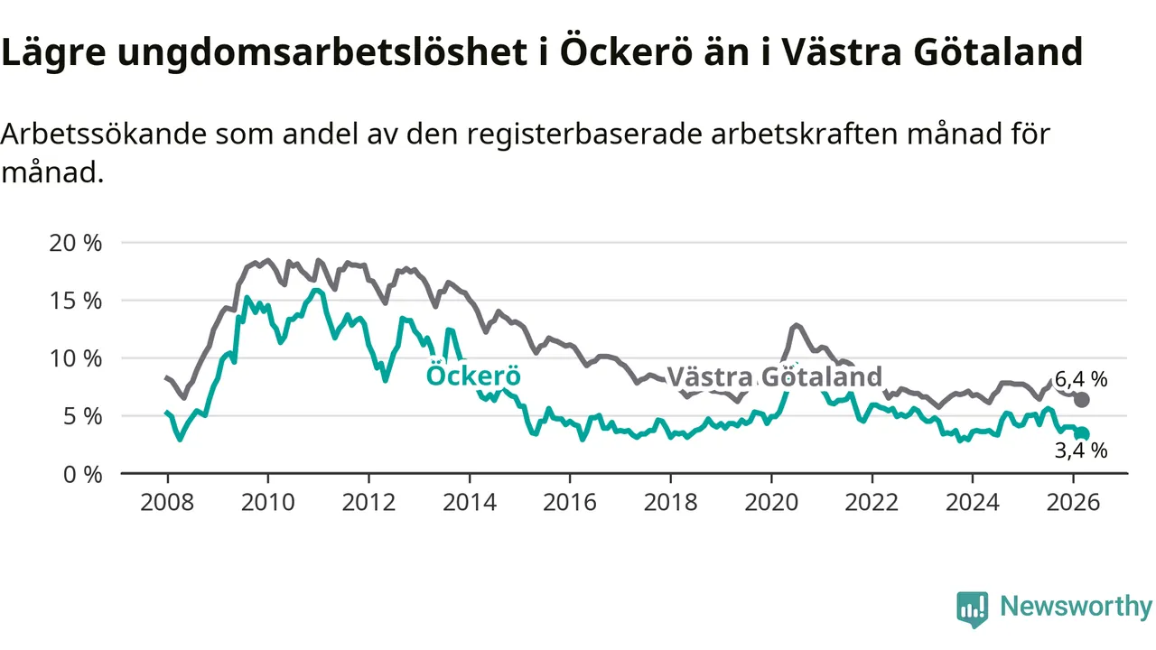 I och med den senaste månadens nedgång har de ungas arbetslöshet på Öckerö sjunkit sju månader i följd (ner från 5,4 procent i augusti 2025 till 3,4 procent nu).