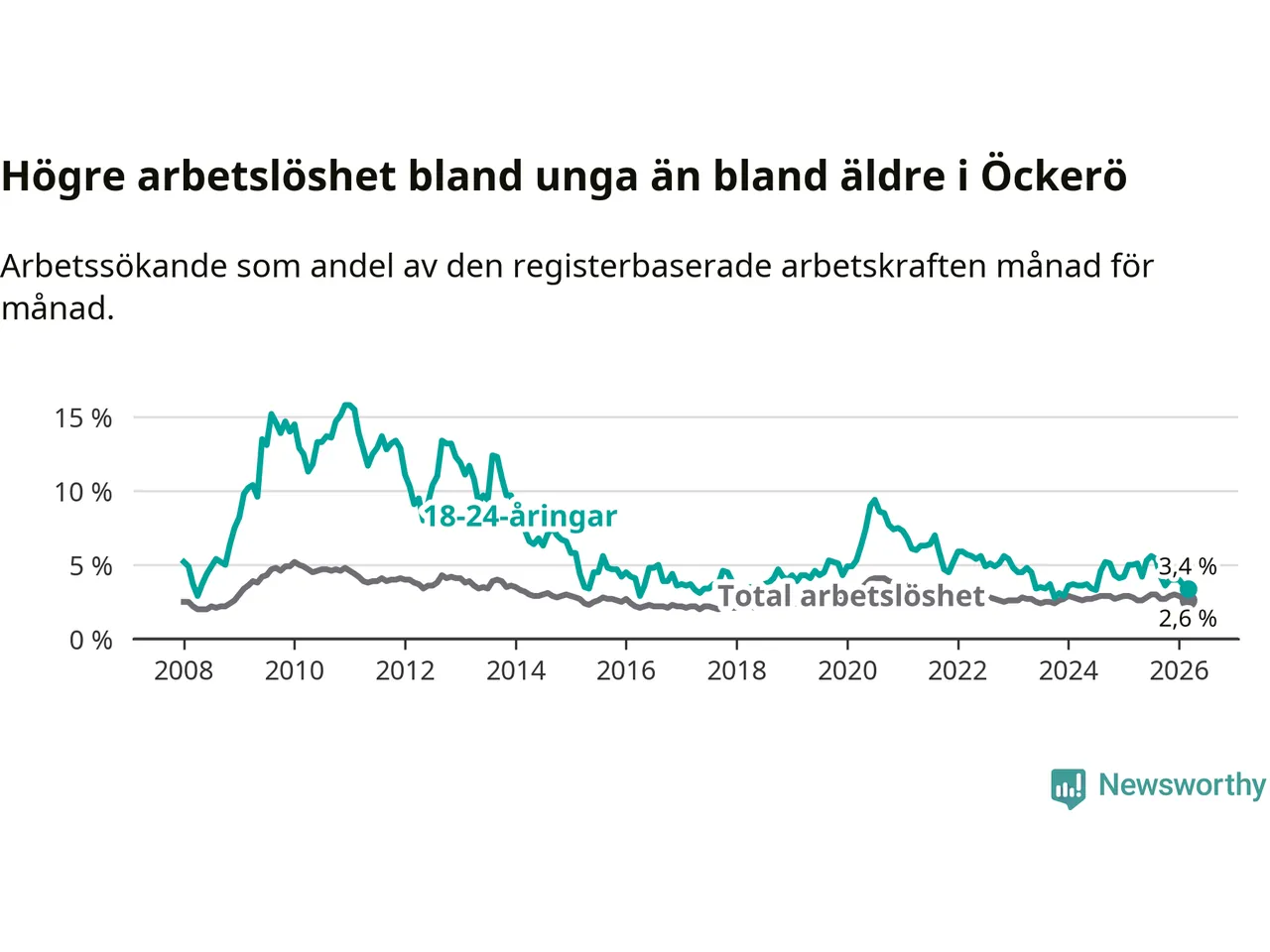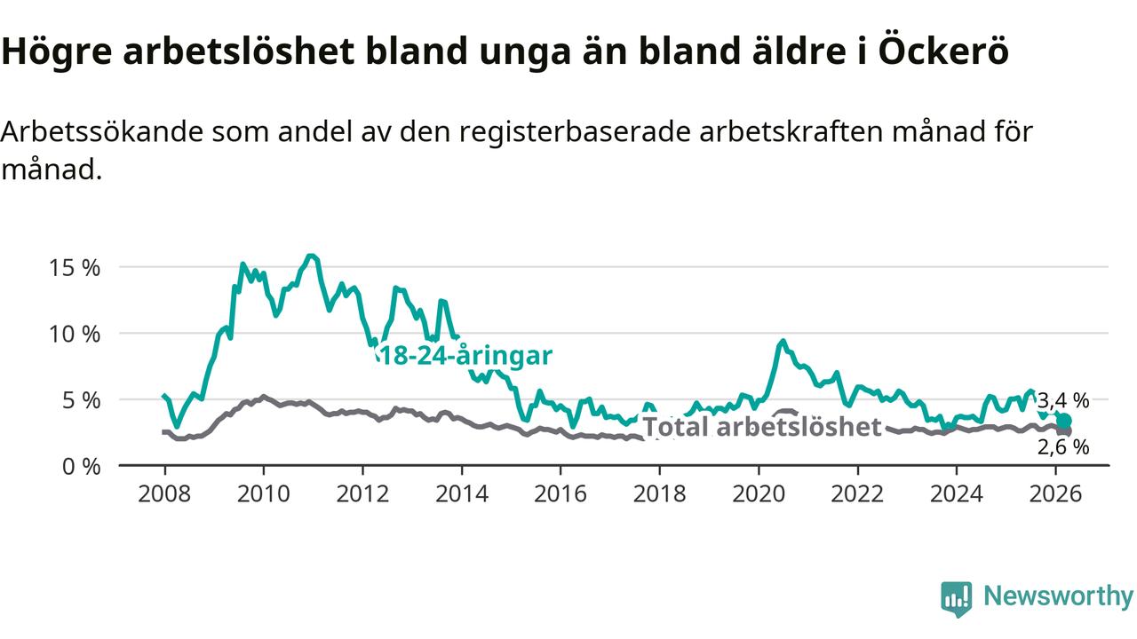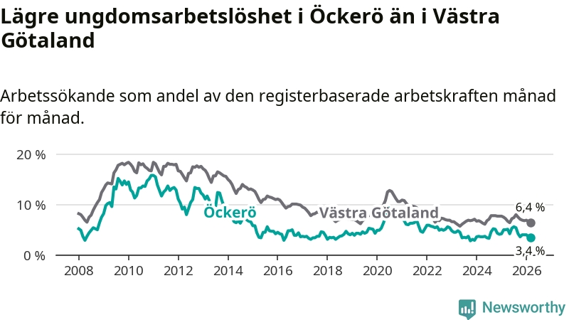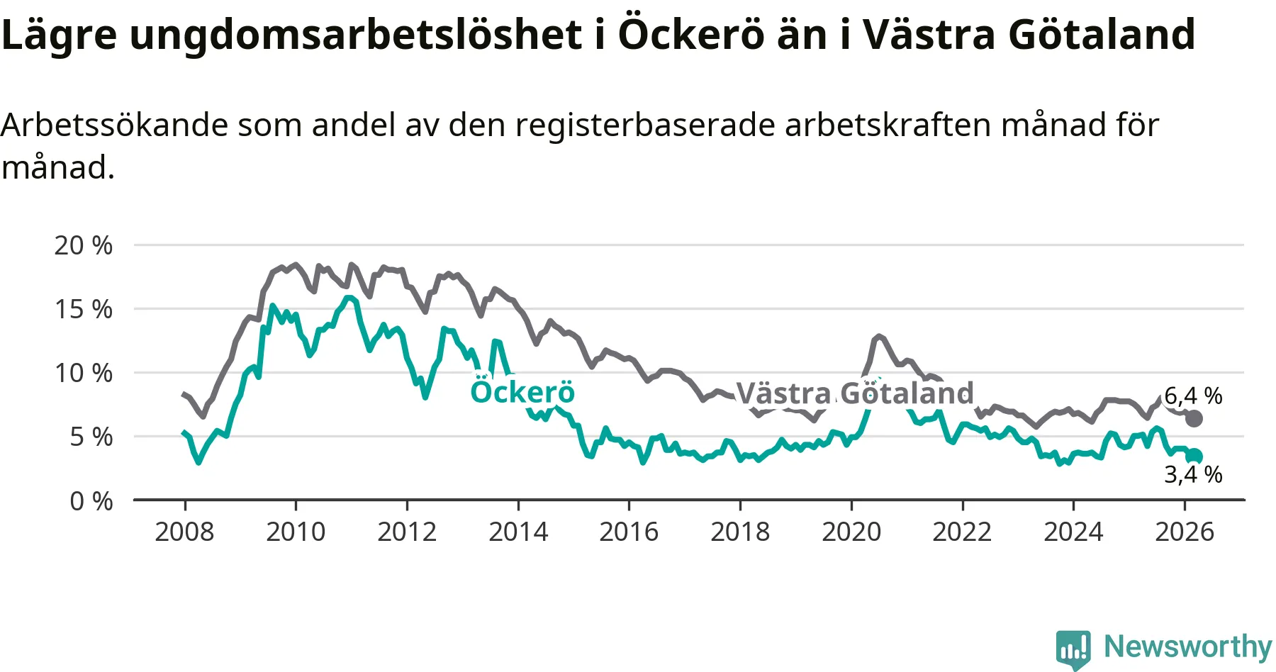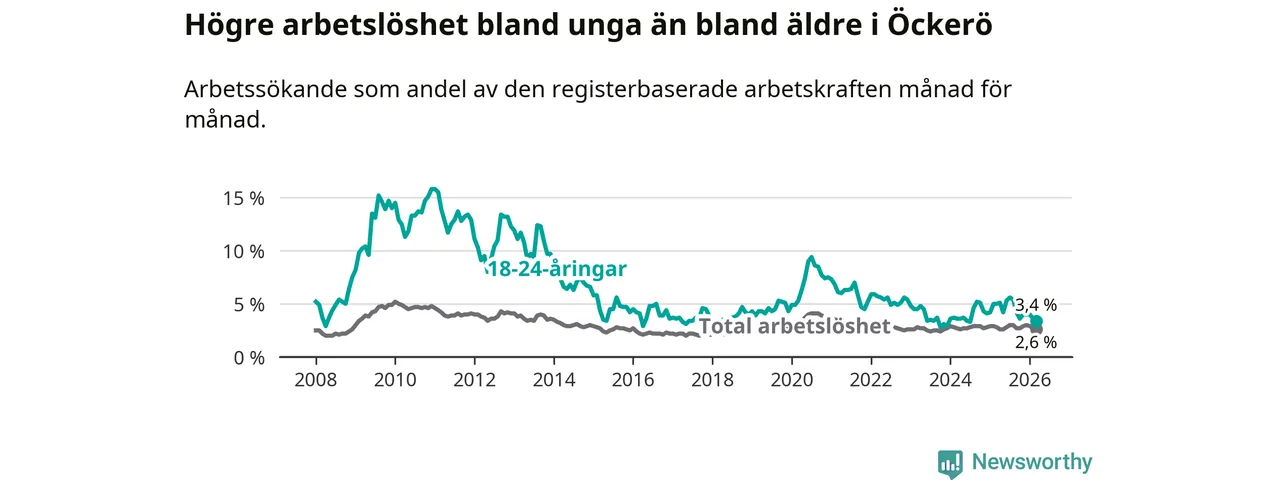 I och med den senaste månadens nedgång har de ungas arbetslöshet på Öckerö sjunkit sju månader i följd (ner från 5,4 procent i augusti 2025 till 3,4 procent nu).