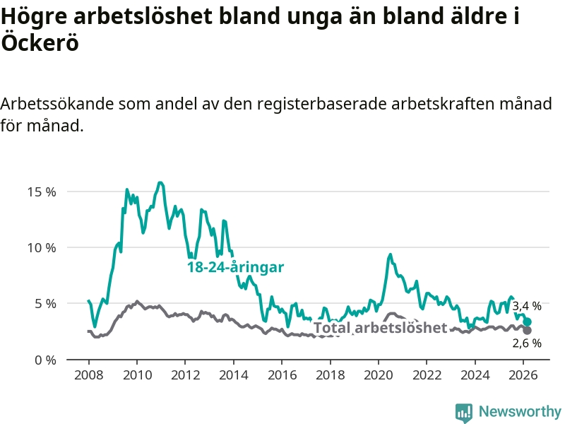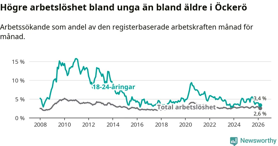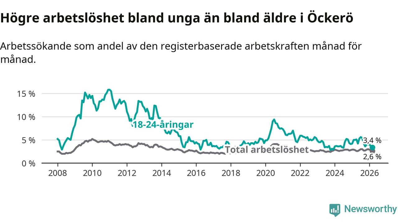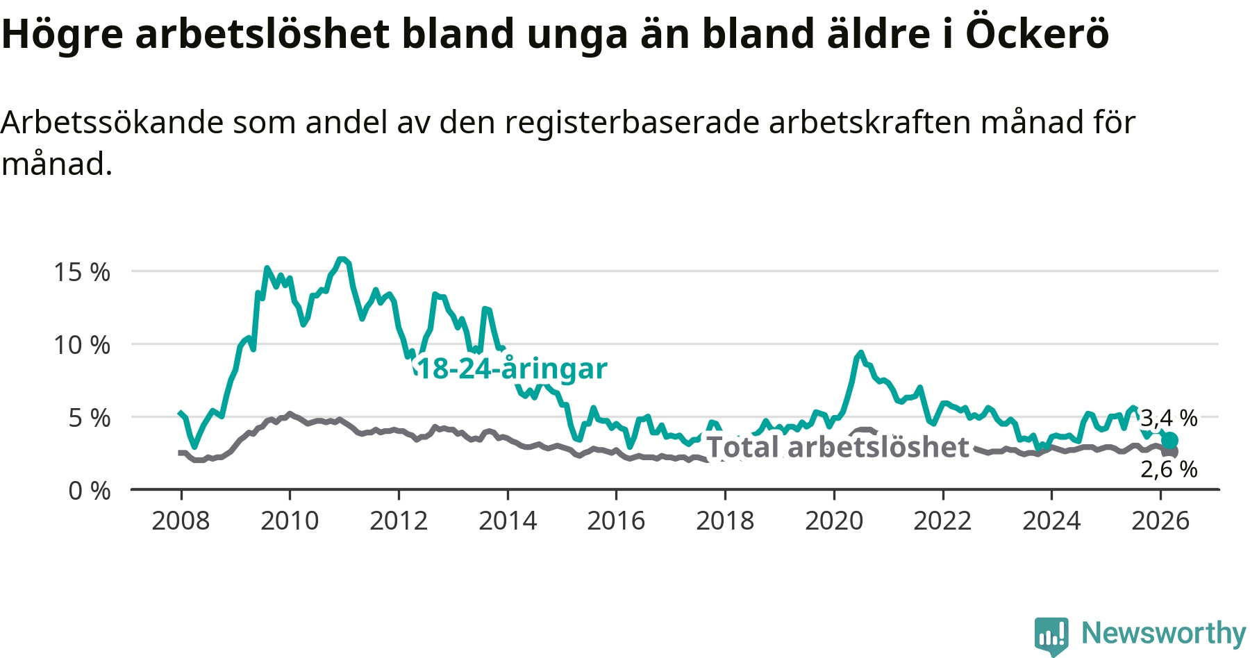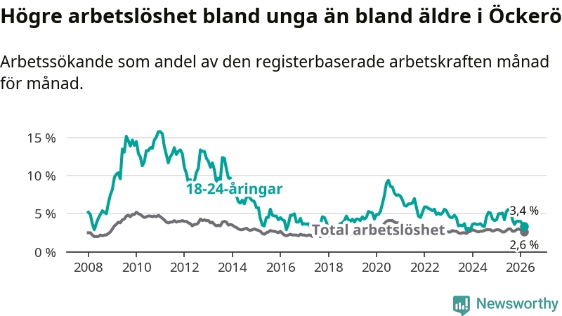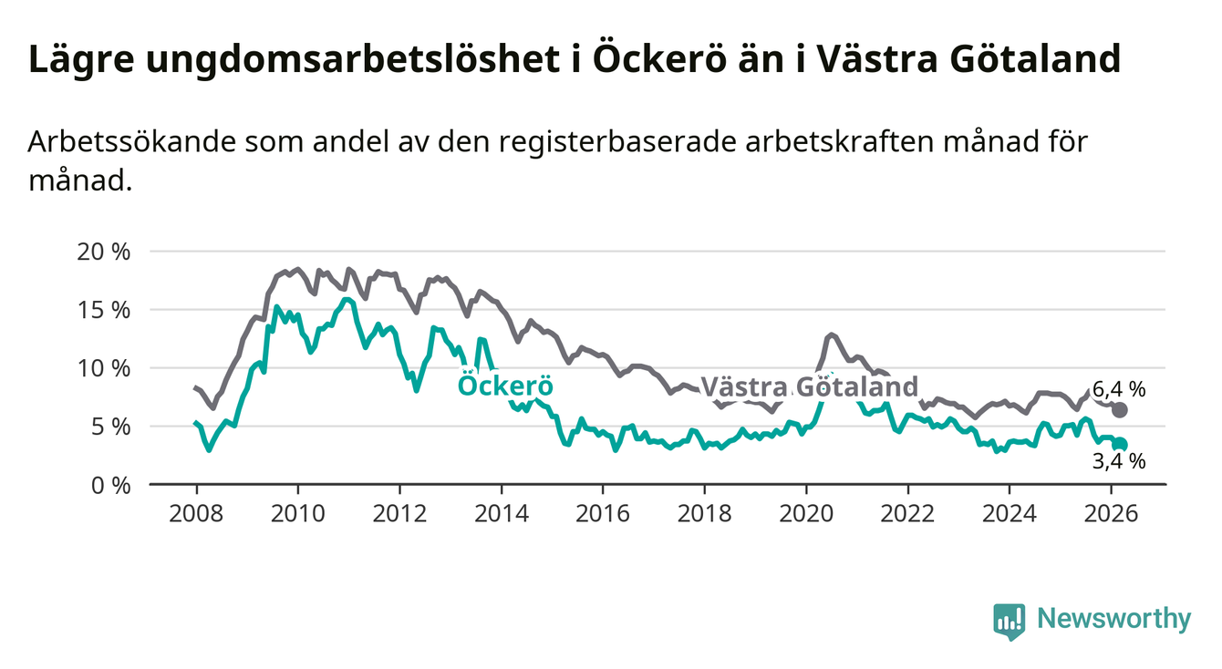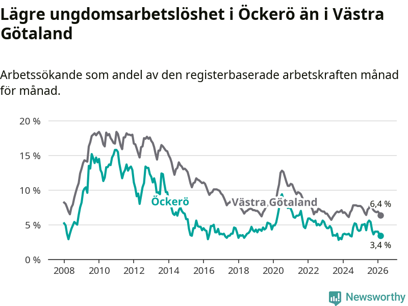 I och med den senaste månadens nedgång har de ungas arbetslöshet på Öckerö sjunkit sju månader i följd (ner från 5,4 procent i augusti 2025 till 3,4 procent nu).