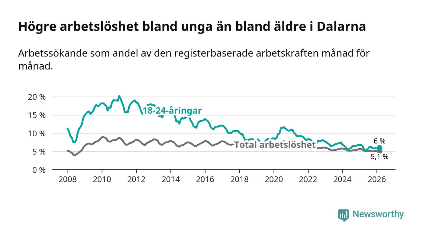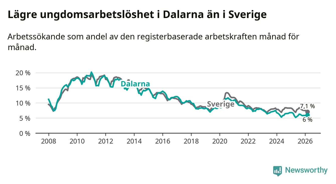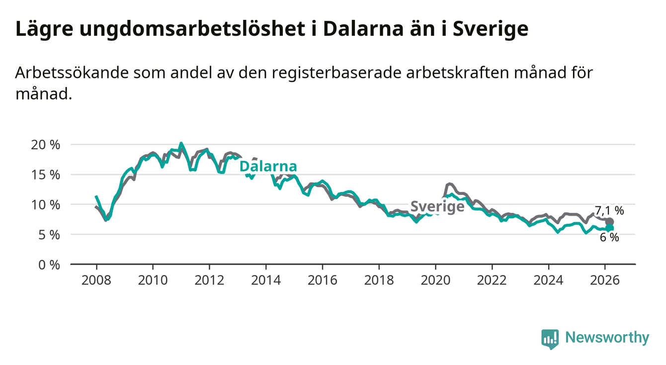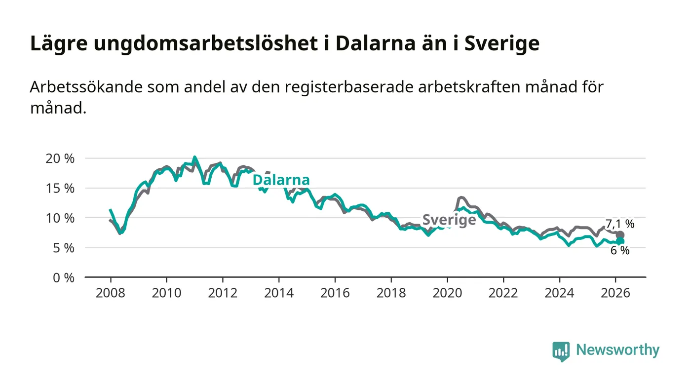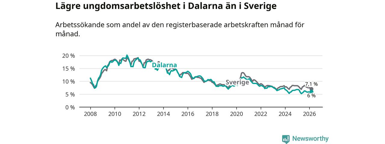 I och med den senaste månadens nedgång har de ungas arbetslöshet i Dalarna sjunkit tolv månader i följd (ner från 6,5 procent i mars 2025 till 6,0 procent nu).