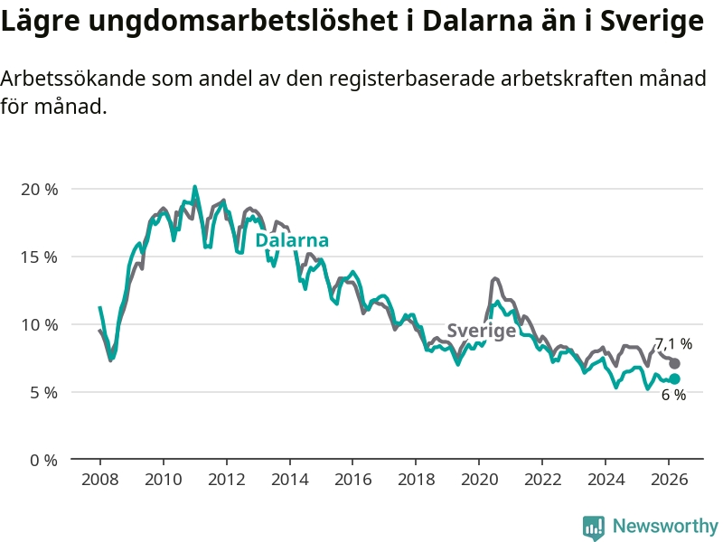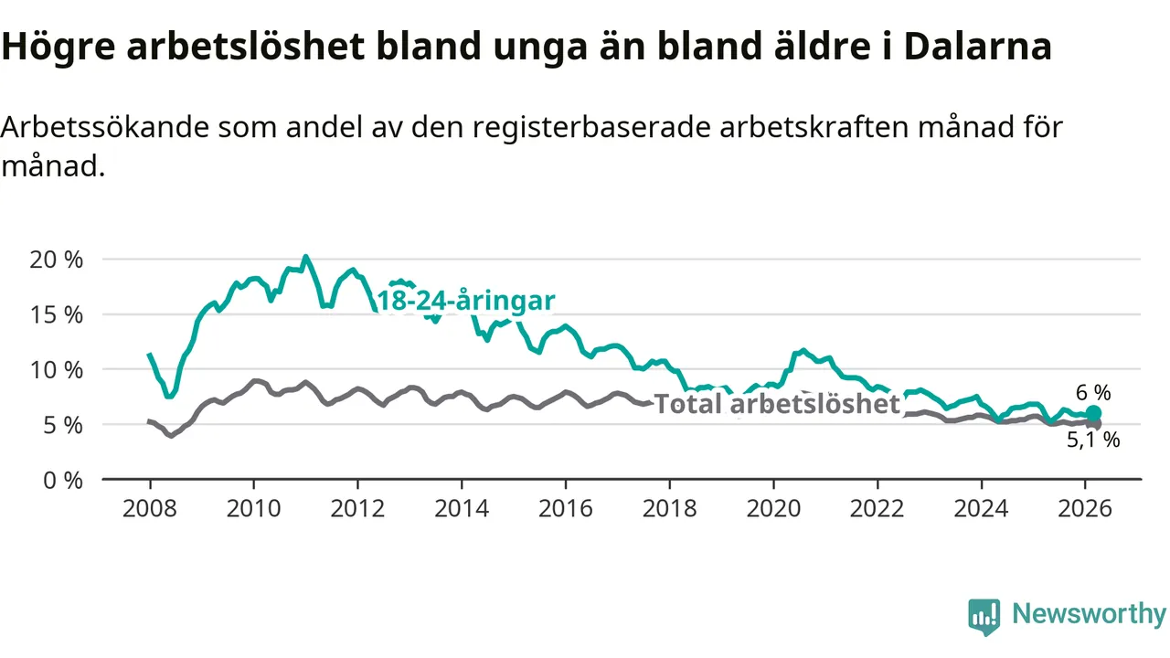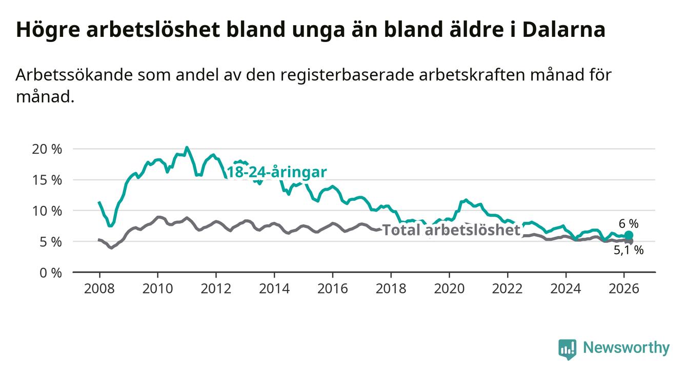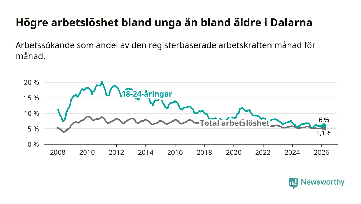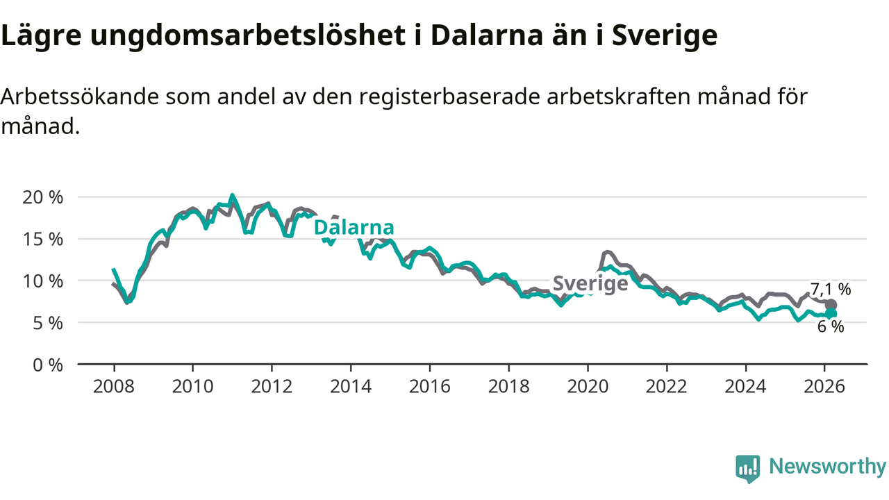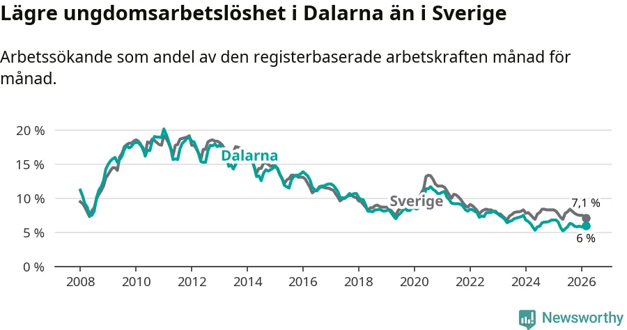 I och med den senaste månadens nedgång har de ungas arbetslöshet i Dalarna sjunkit tolv månader i följd (ner från 6,5 procent i mars 2025 till 6,0 procent nu).